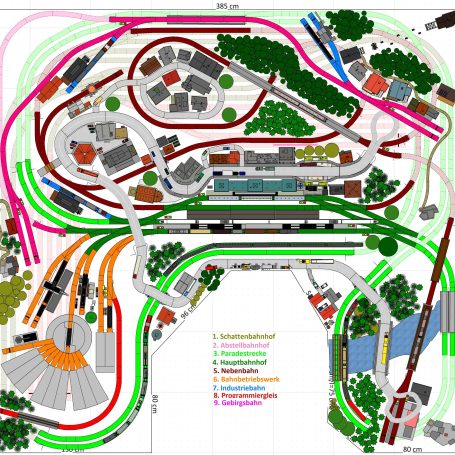 Mittelgebirge / Hochgebirge mit mittlerem Industriegebiet, Erholung am Fluss, Hauptstrecke mit 1-gleisiger Nebenstrecke ins Mittelgebirge mit 1 Durchgangsbahnhof 1-gleisig sowie zwei Endbahnhöfen 2-gleisig. Die Anlage besitzt 2 Schattenbahnhöfe mit insgesamt 9-Gleisen und 3 Abstellbahnhöfe mit 21 Gleisen. Car-System mit 4 Bahnübergänge, Straßen 2-spurig mit insgesamt 3 Wendekreisen und 3 Abzweigen, davon 2 Abzweige als Einbahnstraße, Baustelle mit Ampelverkehr