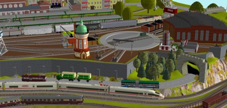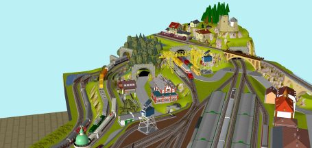 2 Schattenbahnhöfe insgesamt 7-gleisig (1x 4-gleisig und 1x 3-gleisig), 1 Abstellbahnhof (4-gleisig) - 2 Abstellgleise mit 2er Lokschuppen, 2 x Abstellgleise mit Tanklager, 2 x Abstellgleis mit Güterschuppen und Digitalkran und Bekohlungsanlage, 1x Abstellgleis mit alter Maschinenfabrik, 1x Abstellgleis mit Öllager und Dieseltankstelle. 1x Abstellgleis mit Fabrik mit Anbau - 1x Berg mit Burg, 1 großes Bergdorf mit Bergsee und Wasserfall mit Bachlauf - 2 Bahnübergänge. Für Car-System geeignet, mit 2 Abzweigen, 1 T-Kreuzung und 4 Wendekreisen- (2-spurige Straßen) und 2 Bußhaltestellen