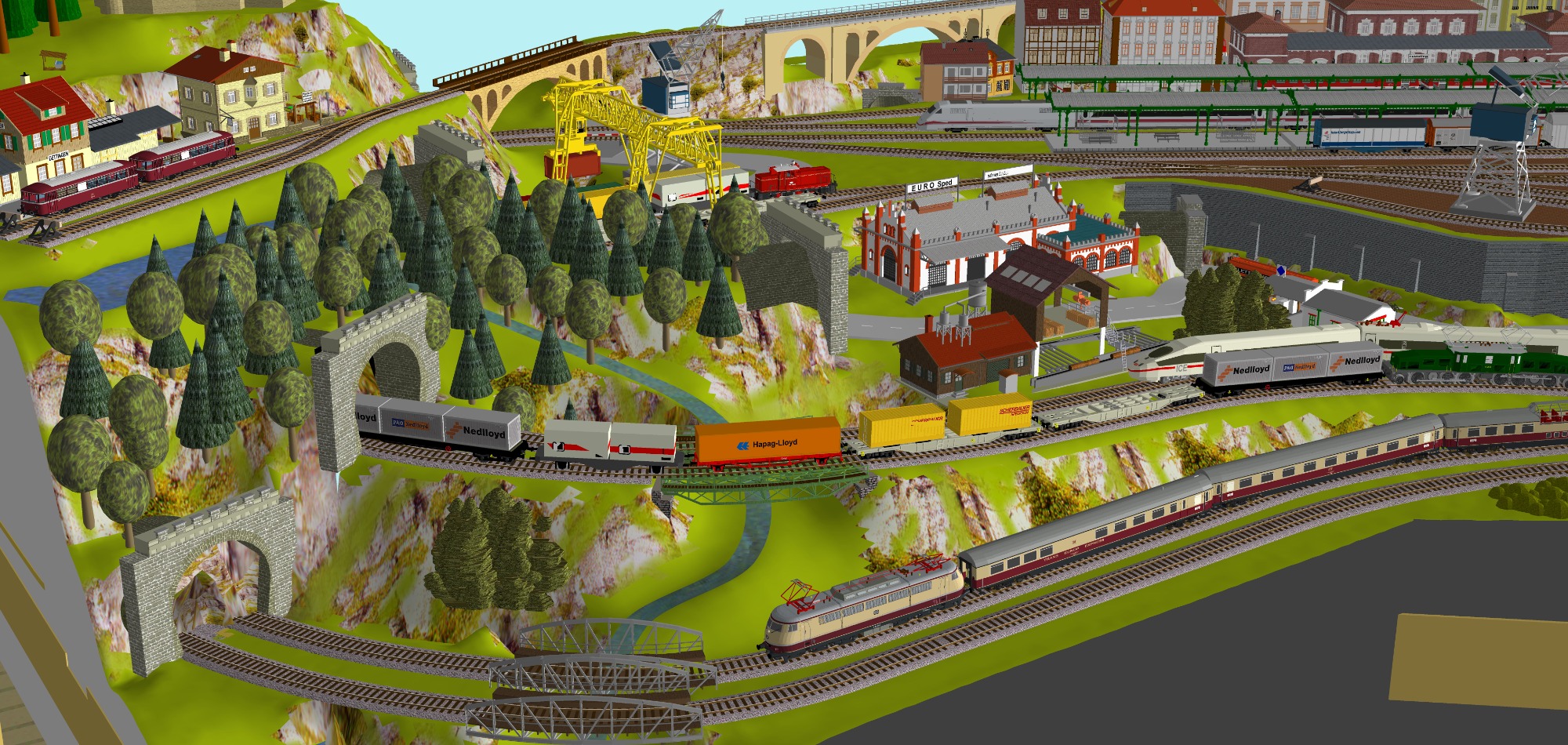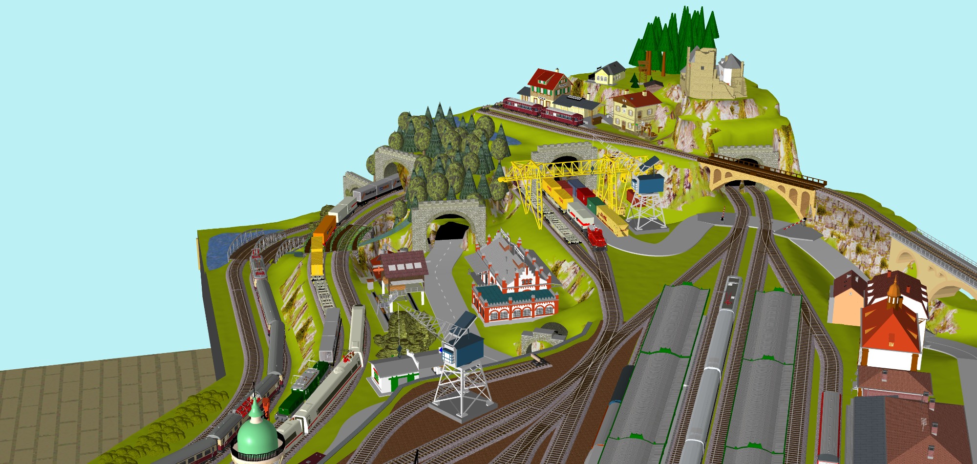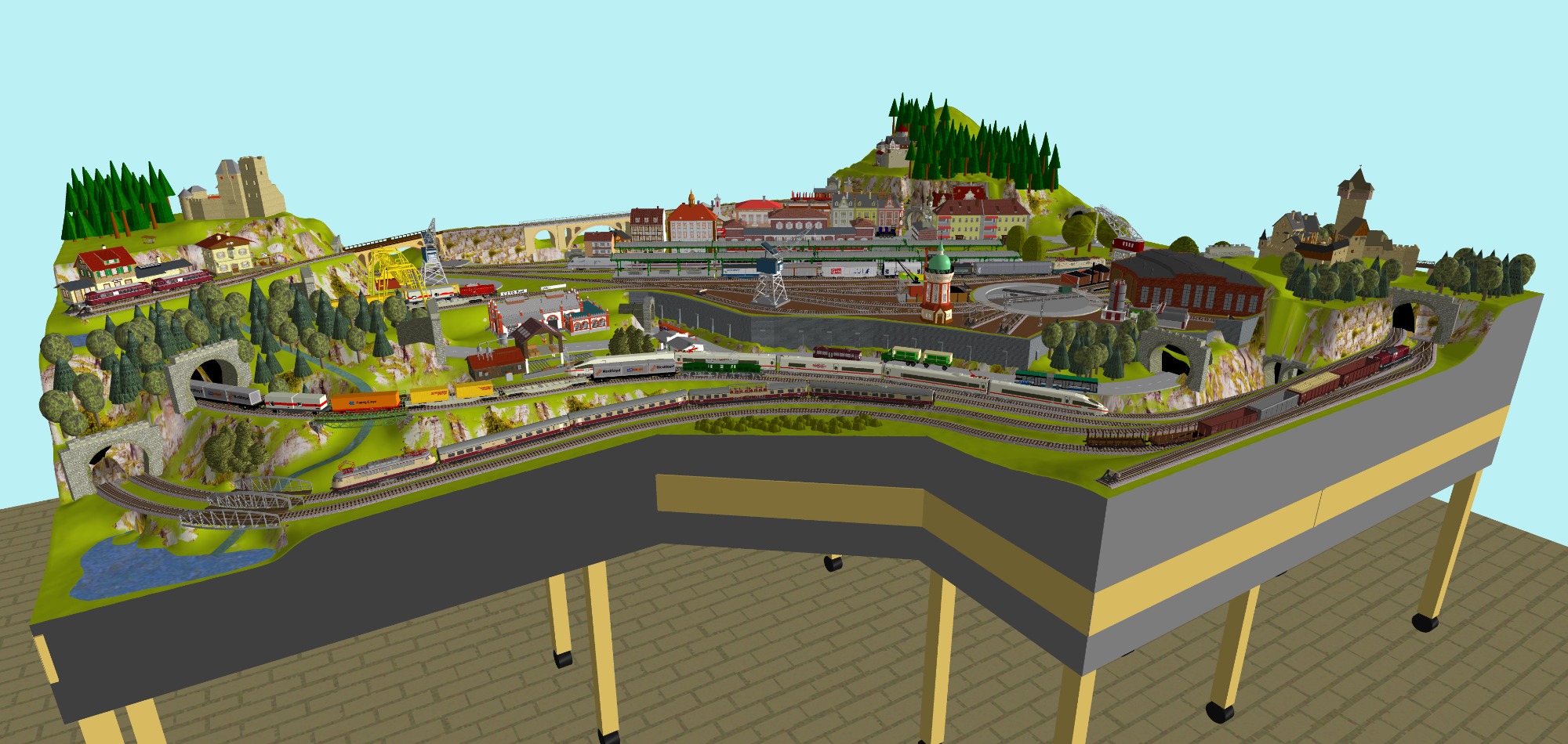 1 Hauptbahnhof (6-gleisig) - 2-gleisige Hauptstrecke, 1 gleisige Nebenstrecke mit Endbahnhof 2-gleisig) - 2 Schattenbahnhöfe insgesamt 10-gleisig (2x 5-gleisig), 2 Abstellbahnhöfe 10-gleisig (2x 5-gleisig) -2 Paradestrecken der Hauptstrecke, einmal in den Schattenbahnhof und einmal aus dem Schattenbahnhof - Mittleres Bahnbetriebswerk mit Drehscheibe und Lokschuppen mit 3 Segmenten, Kohleverladung, Verladekran, Dieseltankstelle, Wasserturm usw. - 2 Abstellgleise mit Containerverladung, 1x Abstellgeis mit Sägewerk auf der Nebenbahn, 1x Abstellgleis als Programmiergleis, 2 Berge mit je einer Burg, sowie einer 3. Burg auf kleinem Berg - 2 Bahnübergänge, Bergsee mit Wasserfall und Bachlauf, Anlage für Car-System geeignet, mit Rundkreis (2-spurige Straßen) und 4 Abzweigen