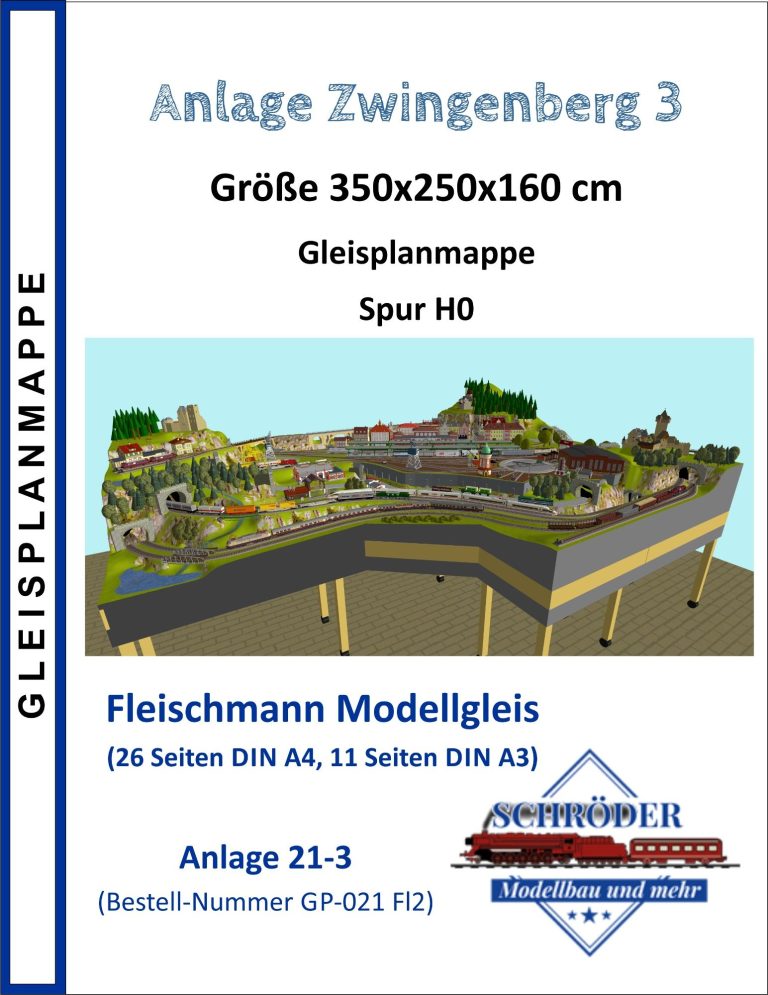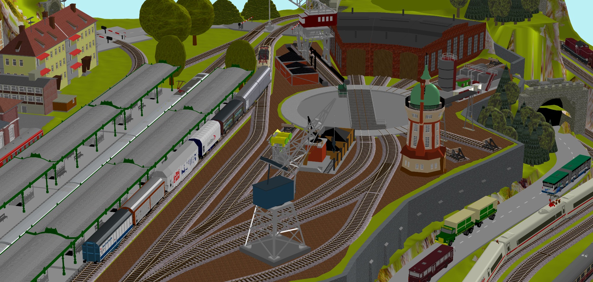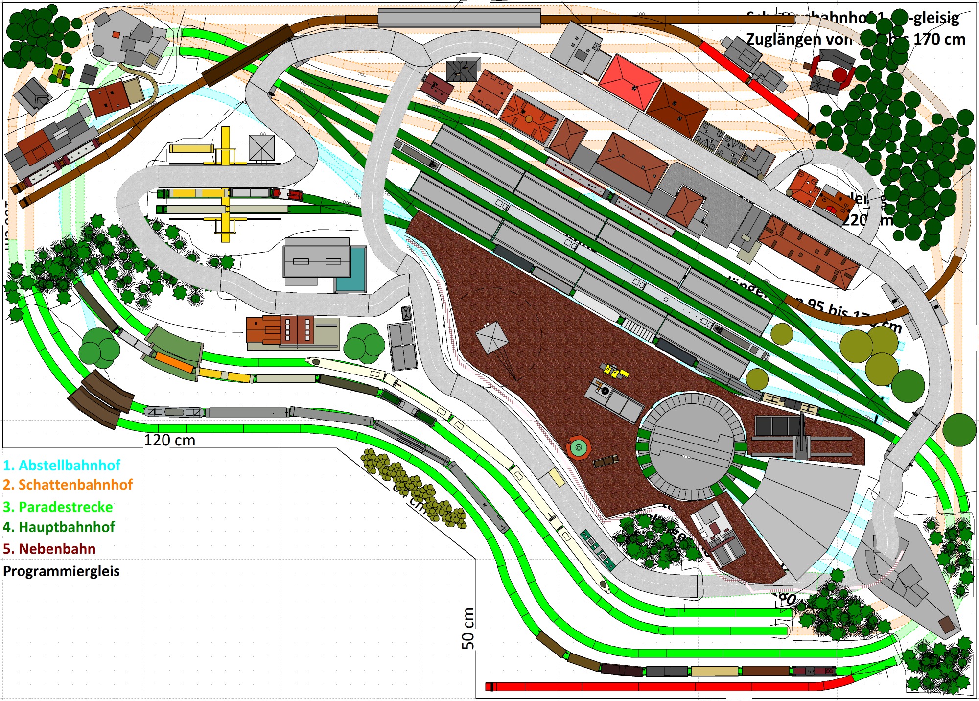1 Hauptbahnhof (6-gleisig) - 2-gleisige Hauptstrecke, 1 gleisige Nebenstrecke mit Endbahnhof 2-gleisig) - 2 Schattenbahnhöfe insgesamt 10-gleisig (2x 5-gleisig), 2 Abstellbahnhöfe 10-gleisig (2x 5-gleisig) -2 Paradestrecken der Hauptstrecke, einmal in den Schattenbahnhof und einmal aus dem Schattenbahnhof - Mittleres Bahnbetriebswerk mit Drehscheibe und Lokschuppen mit 3 Segmenten, Kohleverladung, Verladekran, Dieseltankstelle, Wasserturm usw. - 2 Abstellgleise mit Containerverladung, 1x Abstellgeis mit Sägewerk auf der Nebenbahn, 1x Abstellgleis als Programmiergleis, 2 Berge mit je einer Burg, sowie einer 3. Burg auf kleinem Berg - 2 Bahnübergänge, Bergsee mit Wasserfall und Bachlauf, Anlage für Car-System geeignet, mit Rundkreis (2-spurige Straßen) und 4 Abzweigen