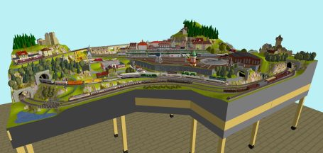 Ländlliche Idylle mit Mittelgebirge und 1 Hauptbahnhof (4-gleisig) mit 2-gleisige Hauptstrecke und 1 gleisiger Nebenstrecke mit Zwischenbahnhof (2-gleisig)- und Endbahnhof 1-gleisig), 1 Schattenbahnhof (1x 4-gleisig), 1 Abstellgleis mit Fabrik, 1x Abstellgleis mit öl-Tanklager, 1 Abstellgleise mit Bahnsteig, 1 ländliches Dorf, 3 Brücken, 1 See, 1 Abstellgleis als Programmiergleis, Berg mit Burg und 1 Berg mit Schloss, Car-System mit 2 Wendekreisen