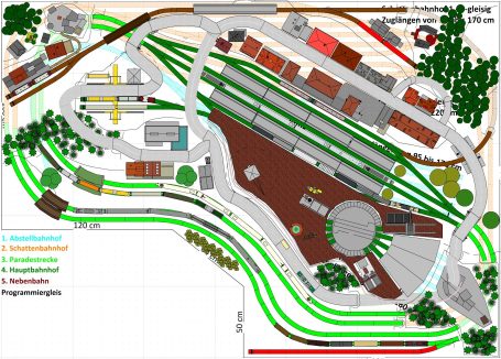 2-gleisige Hauptstrecke, 1 gleisige Nebenstrecke mit Endbahnhof 2-gleisig), 1 Schattenbahnhof insgesamt 10-gleisig (2x 5-gleisig), 1 Abstellbahnhof (9-gleisig) - 2 Paradestrecken der Hauptstrecke, einmal in den Schattenbahnhof und einmal aus dem Schattenbahnhof - 1 Abstellgleis mit 1-gleisigem Lokschuppen, 2x Abstellgeise mit Maschinenbauund Fabrik mit Anbau, 2x Abstellgleise mit Tanklager, 1x Abstellgleis als Programmiergleis und alter Maschinenfabrik, sowie Brauerei - 2 Berge mit je einer Burg, 3 Bahnübergänge, Bergsee mit Wasserfall und Bachlauf, Anlage für Car-System geeignet, mit Rundkreis und 2 Abzweigen (2-spurige Straßen)