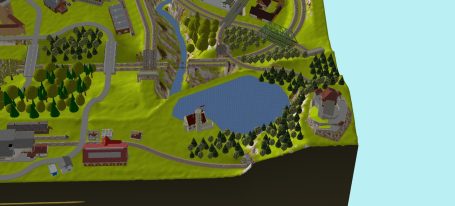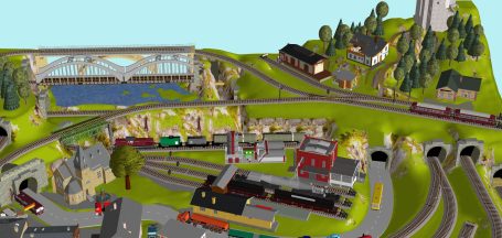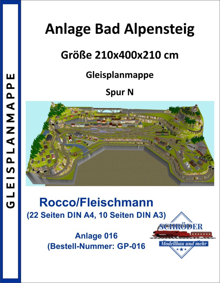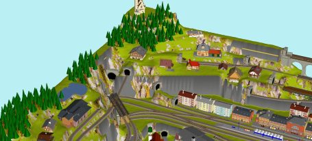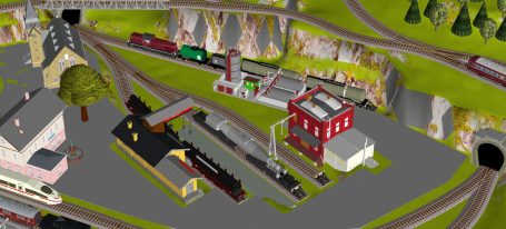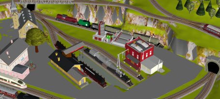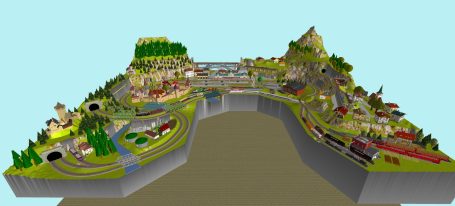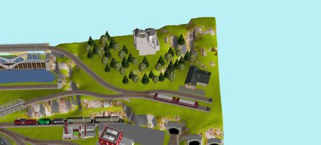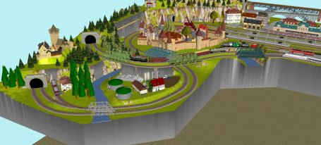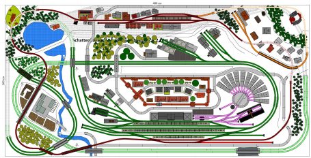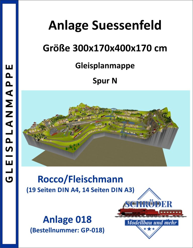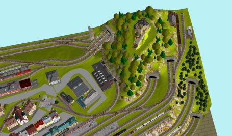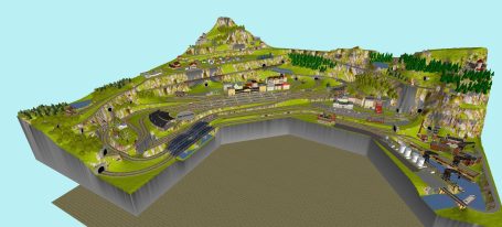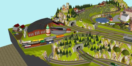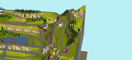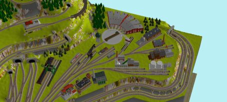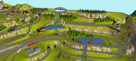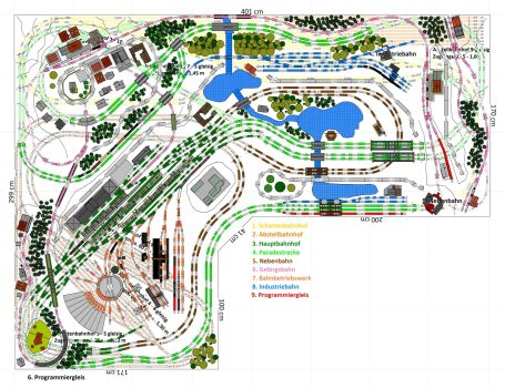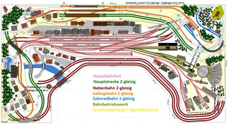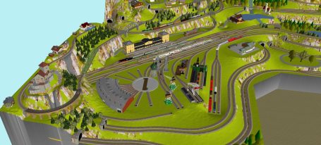 7 Schattenbahnhöfe, davon 4 Schattenbahnhöfe (insgesamt 22-gleisig,m 3 Abstellbahnhöfe ( insgesamt 28-gleisig) - Großes Bahnbetriebswerk mit Ringlockschuppen 6-spännig, Wasserturm, Kohleverladung usw. - 4 Paradestrecken, 2x Hauptstrecke und 2x Nebenstrecke, 1 Abstellgleis mit Sägewerk, 7 Abstellgleise im Industriegebiet mit 9 Fabriken, Berg mit Bergsee, sowie Alpendorf, Burg, Fluss und vieles mehr