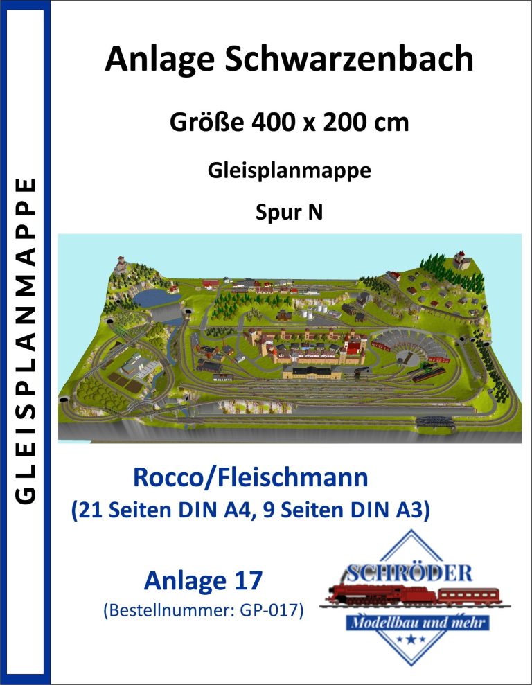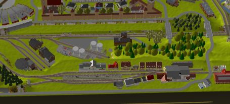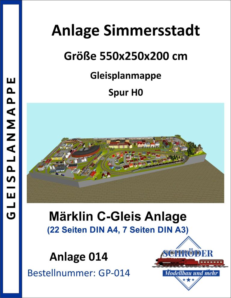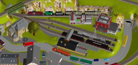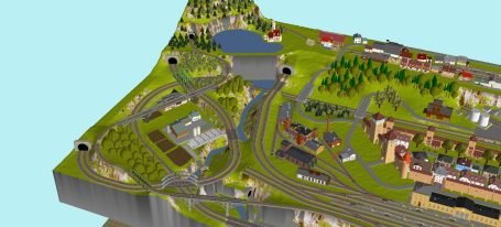 Kleinstadt mit 2 Hauptbahnhöfen (2x 5-gleisig), mit 2 gleisiger Hauptstrecke, 1 gleisiger Nebenstrecke mit Endbahnhof (2-gleisig), 2 Schattenbahhöfe mit insgesamt 14-gleisig (2x7-gleisig), 1 Abstellbahnhof (8-gleisig), Drehscheibe mit Ringlokschuppen (6-Segmente), kleines Bahnbetriebswerk, 1 Ablaufberg 3-gleisig, 1 Abstellgleis mit Kohleverladung, 1 Abstellgleis mit Sägewerk, 2 Abstellgleise Kieswerk, 2 Abstellgleise mit Stahl-und Maschinenbau, See mit Bachlauf, Erholungsgebiet, 1 Bahnübergang. 4x Abstellgleise am Hauptbahnhof, davon 1 Programmiergleis. Anlage für Car-System geeignet - 2 spurige Straßen mit 2 Wendekreisen.