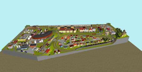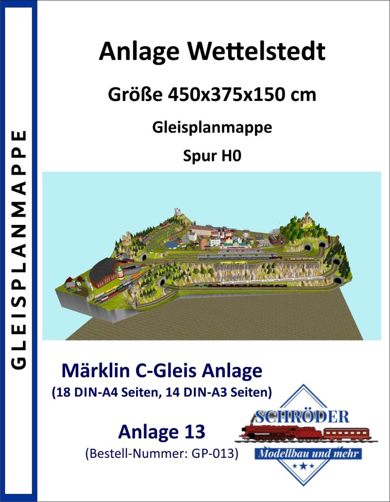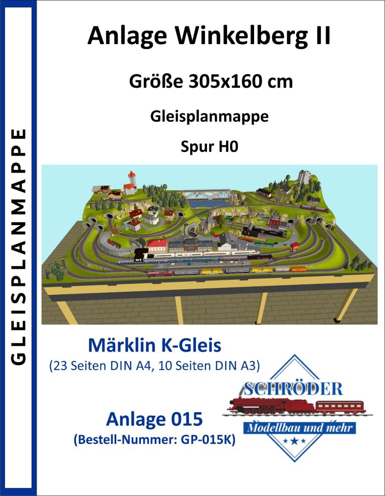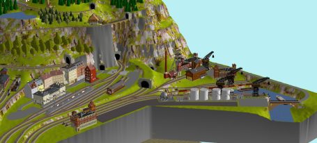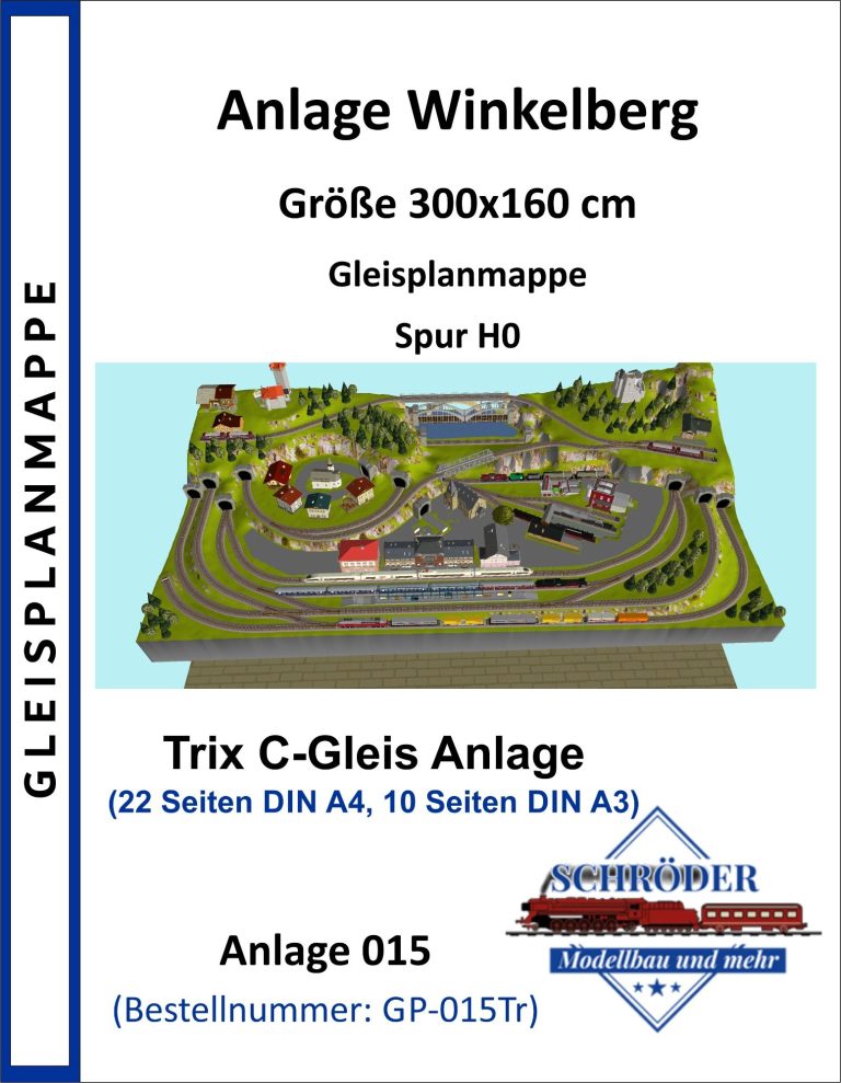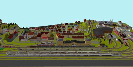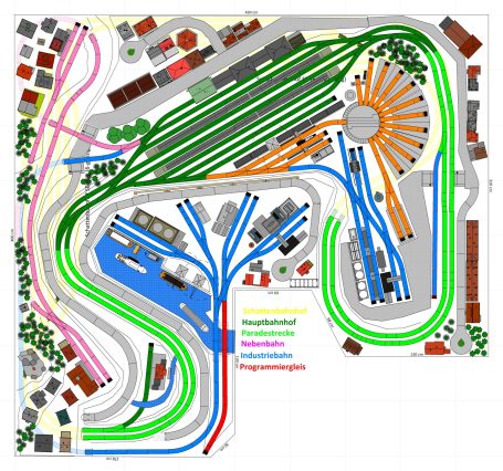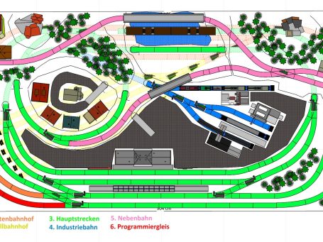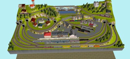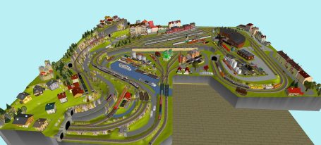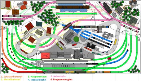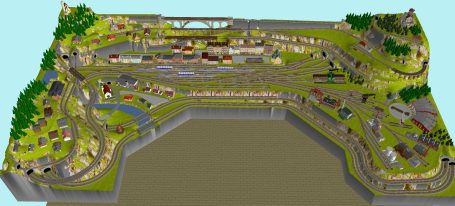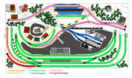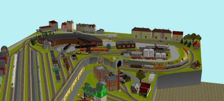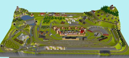 Kleinstadt mit 1 Hauptbahnhof (8-gleisig) und 2-gleisiger Hauptstrecke, 2-gleisige Nebenstrecke mit Nebenbahnhof (8-gleisig), 1-gleisige Gebirgsbahn mit 4 Bahnhöfen (je 2-gleisig), 2 Schattenbahnhöfe insgesamt 20-gleisig (1x8-gleisig, 1x12-gleisig), 1 Abstellbahnhof (1x 15-gleisig) - Drehscheibe mit Ringlockschuppen mit 4-Segmenten mit großem Bahnbetriebswerk, Kohleverladung, Wasserturm, usw. - Hafengebiet mit 9 Abstellgleisen, verschiedenen Fabriken, Tanklager, Verladekräne usw. - 15 weitere Abstellgleise mit weiteren diversen Fabriken, Güterschuppen, Sägewerk, Förderanlage usw. 1 Abstellgleis mit 2-gleisigem Lokschuppen - 1 großes ländliches Dorf, 1 Abstellgleis als Programmiergleis, Berg mit Burg, Alpendorf, 1 Bahnübergang, Großes Car-System mit Wendekreisen, Abzweigen, Wendekreisen (2-spurige Straßen)