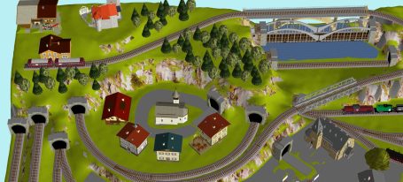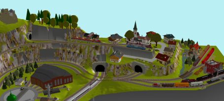 Ländlliche Idylle mit Mittelgebirge und 1 Hauptbahnhof (4-gleisig) mit 2-gleisige Hauptstrecke und 1 gleisiger Nebenstrecke mit Zwischenbahnhof (2-gleisig)- und Endbahnhof 1-gleisig), 1 Schattenbahnhof (1x 4-gleisig), 1 Abstellgleis mit Fabrik, 1x Abstellgleis mit öl-Tanklager, 1 Abstellgleise mit Bahnsteig, 1 ländliches Dorf, 3 Brücken, 1 See, 1 Abstellgleis als Programmiergleis, Berg mit Burg und 1 Berg mit Schloss, Car-System mit 2 Wendekreisen