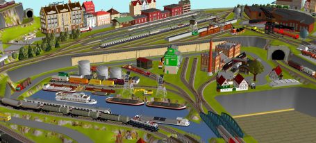 Kleinstadt-Idylle mit 1 Bahnhof (1x 8-gleisig) mit 2-gleisiger Hauptstrecke, 1 gleisige Nebenstrecke mit 1 Bahnhof (2-gleisig) Endbahnhof (2-gleisig), 1 Drehscheibe mit 12x Abstellgleise mit Lokschuppen (9 Segmente), 3 Abstellgleise für Kohleverladung, großes Bahnbetriebswerk, 2x Abstellgleise für Tanklager, 4x Abstellgleis für Industrie, 1x Hafen mit großem Industriegebiet mit 9 Abstellgleisen, 1 Berg mit Burg, Alpendorf, Für Car-System geeignet - Straßen 2spurig mit 3 Wendekreise, 2 lange Tunnel (zu den Schatten- und Abstellbahnhöfen), 2 Schattenbahnhöfe je 6-gleisig (insgesamt 12 Gleise), 2 Abstellbahnhöfe je 7-gleisig (insgesamt 14-gleisig), 2 Bahnübergänge