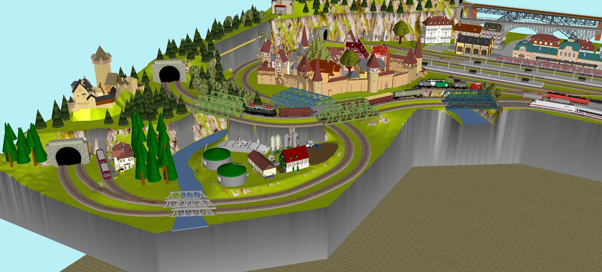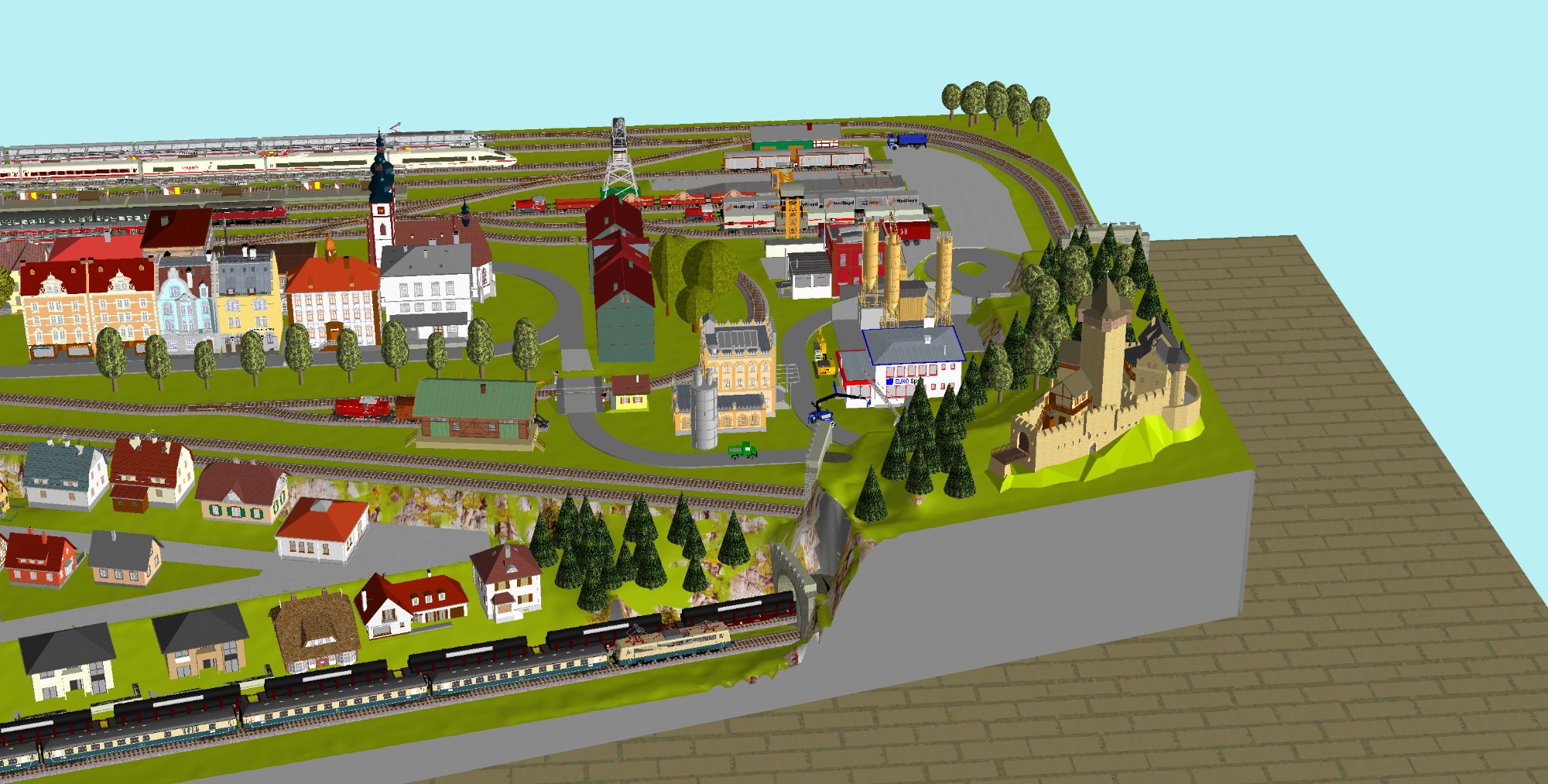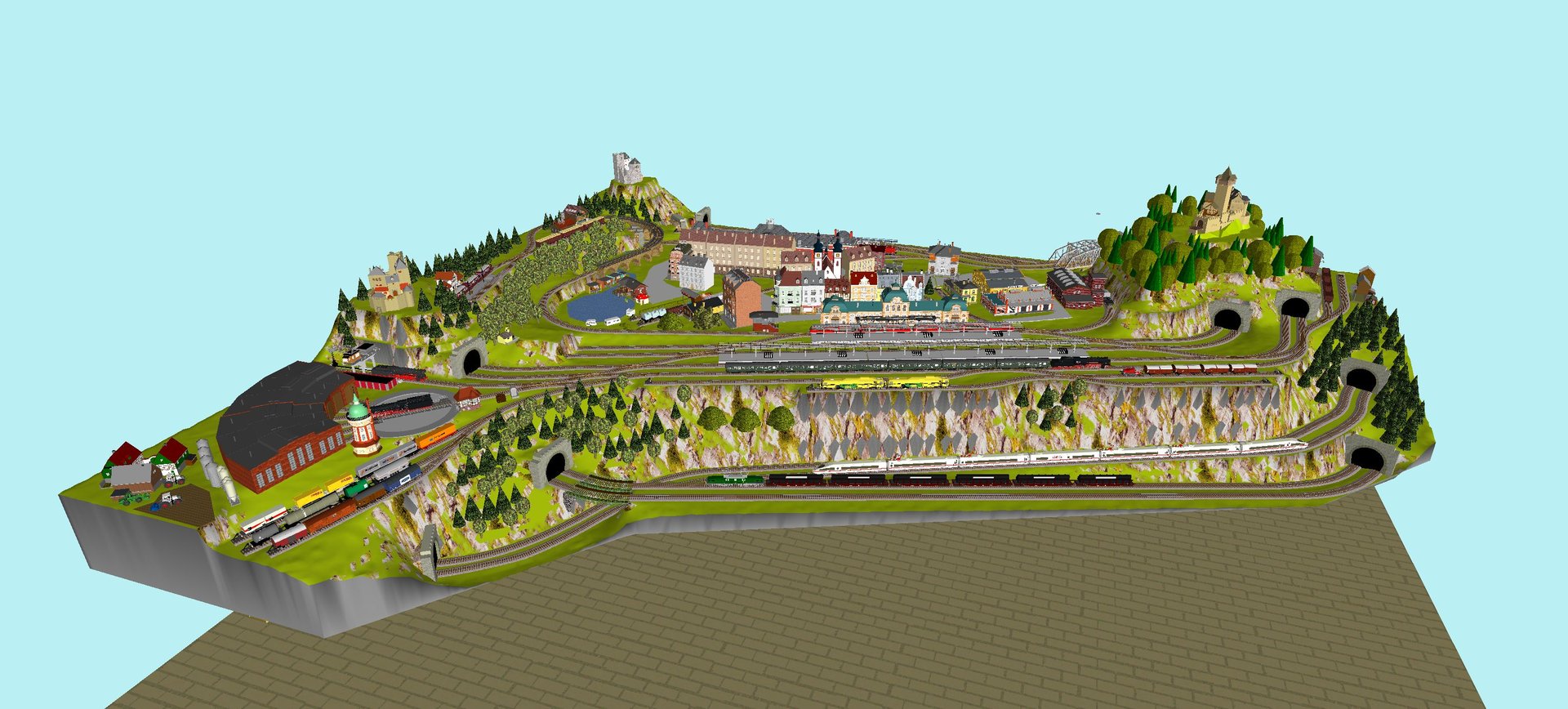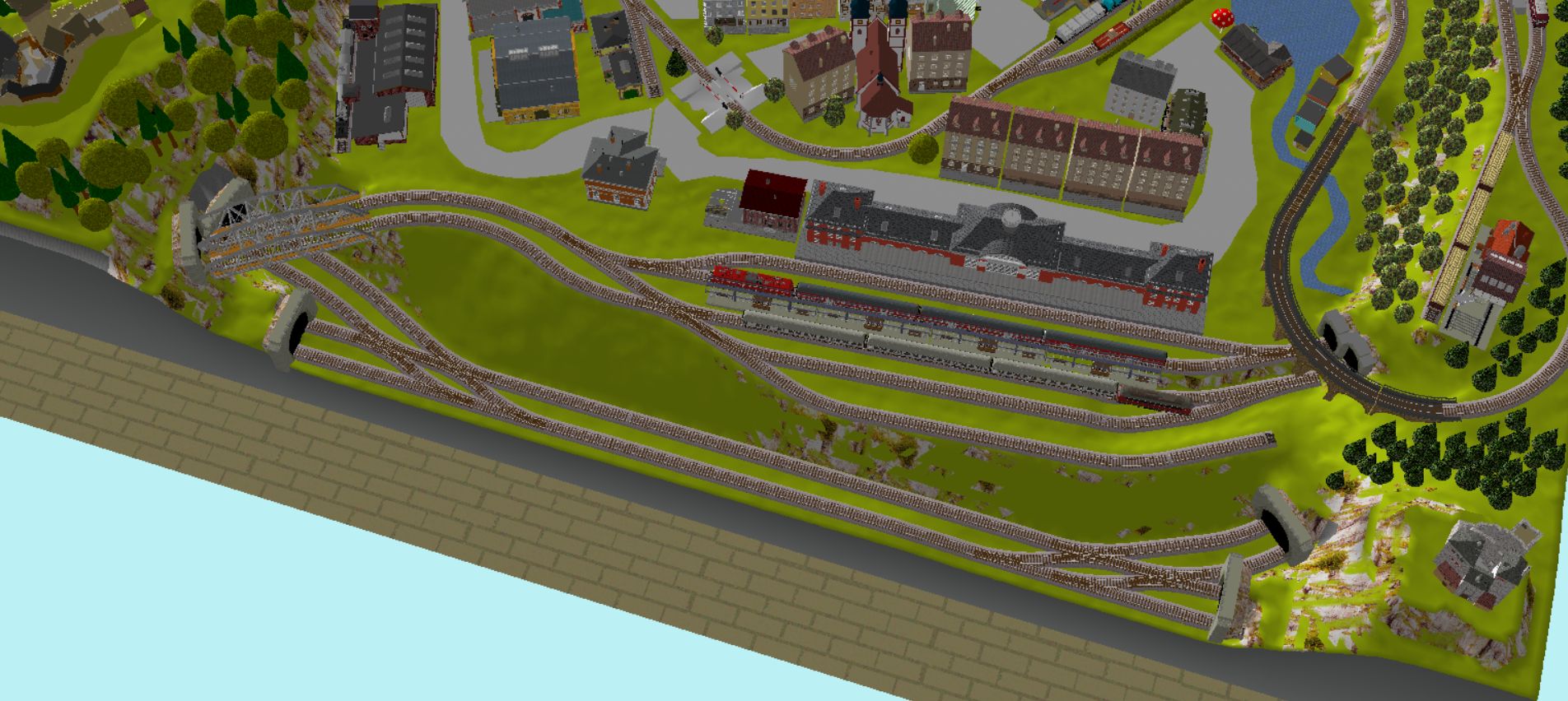 Mittelalterliche Stadt mit Stadtmauer, 3 Bahnhöfe (1x 5-gleisig, 1x 3-gleisig, 1x 1-gleisig), 2-gleisige Hauptstrecke, 1 große Paradestrecke, 1 gleisige Nebenstrecke mit Verbindung zum Hauptbahnhof, 1 Schattenbahnhof insgesamt 13-gleisig, 1 Abstellbahnhof 5-gleisig, kleines Bahnbetriebswerk mit Ringlockschuppen (3 Segmente), 2x Abstellgleise mit Kohleverladung, 2 Abstellgleise mit Sägewerk, 1 Abstellgleis mit Metallindustrie, Berg mit Alpendorf, 1 Bahnübergang, Fluß, sowie ein Bachlauf mit Sägewerk.