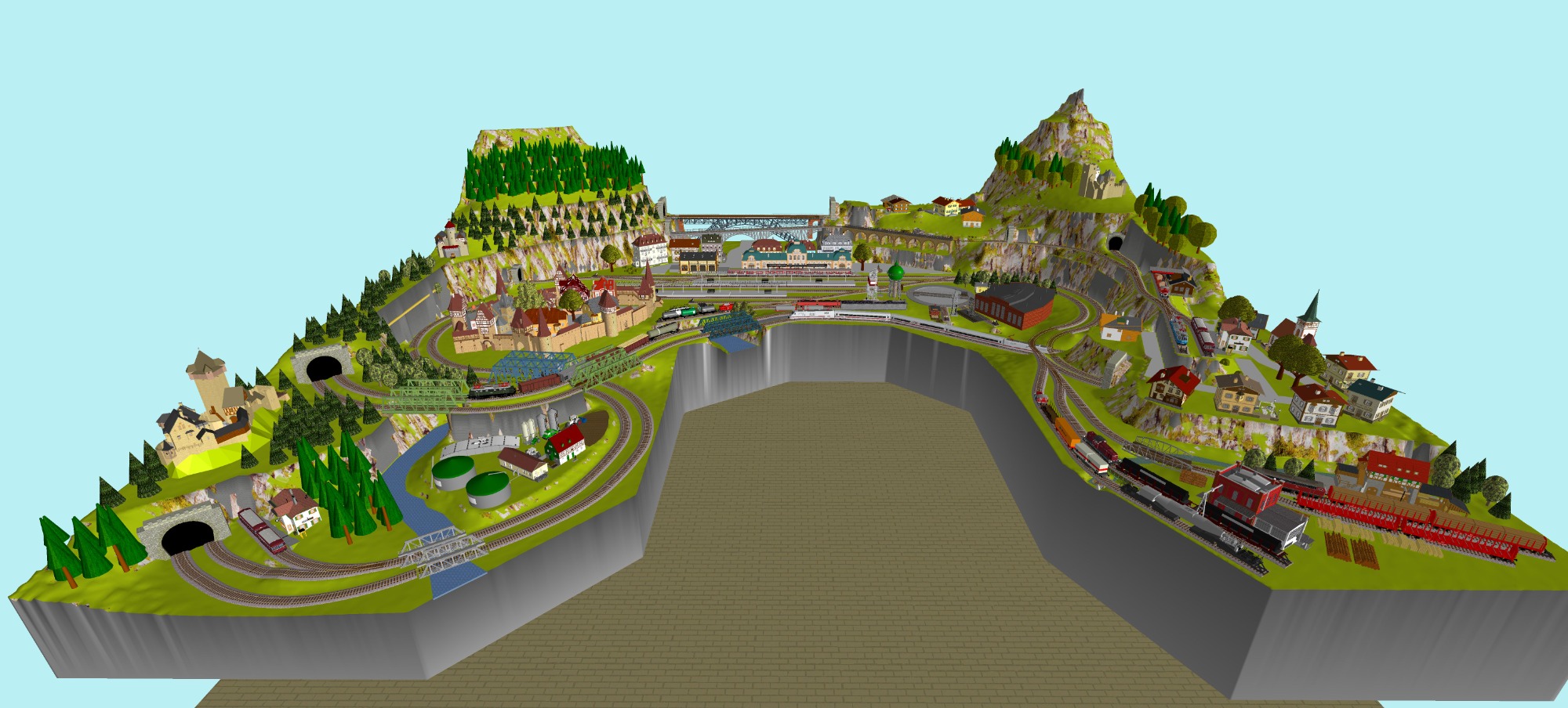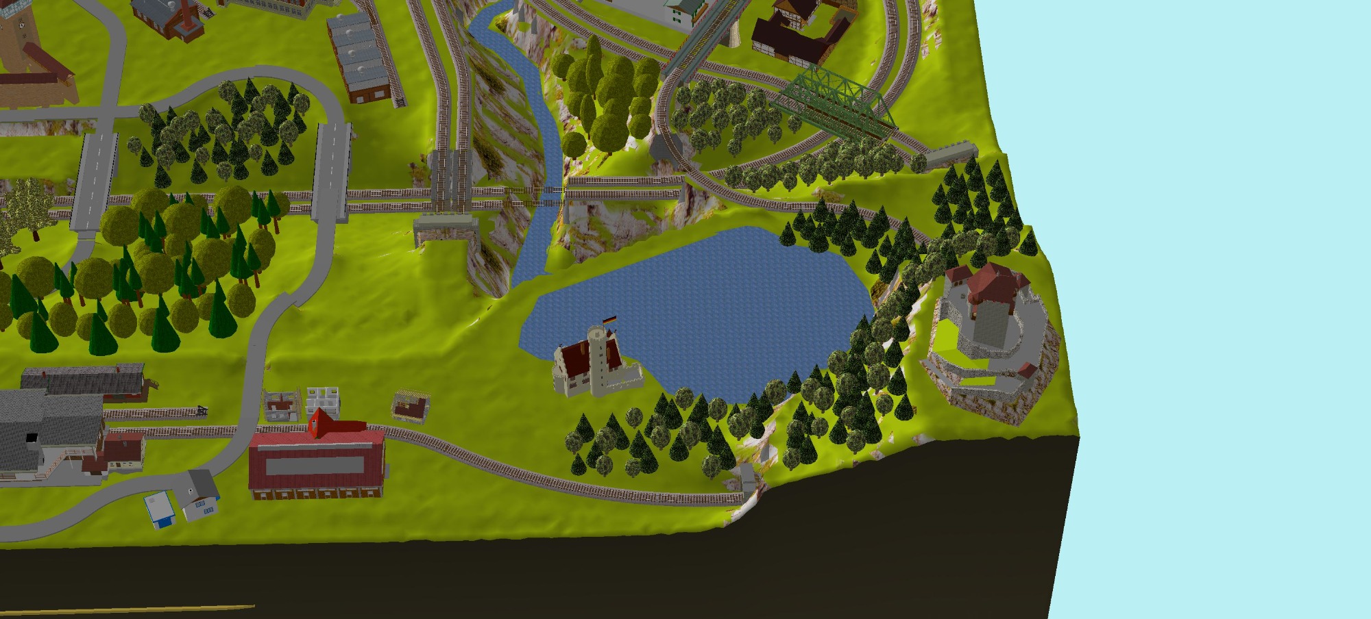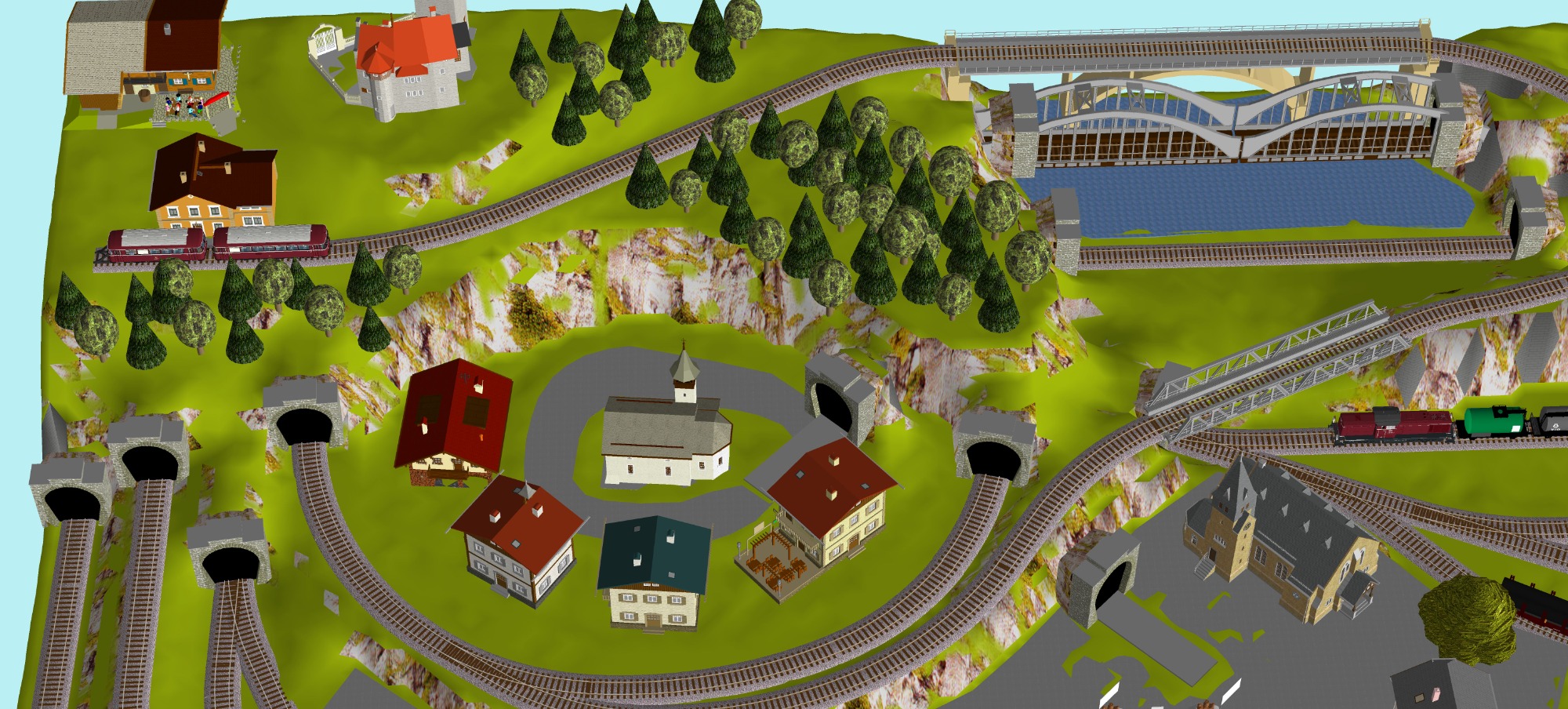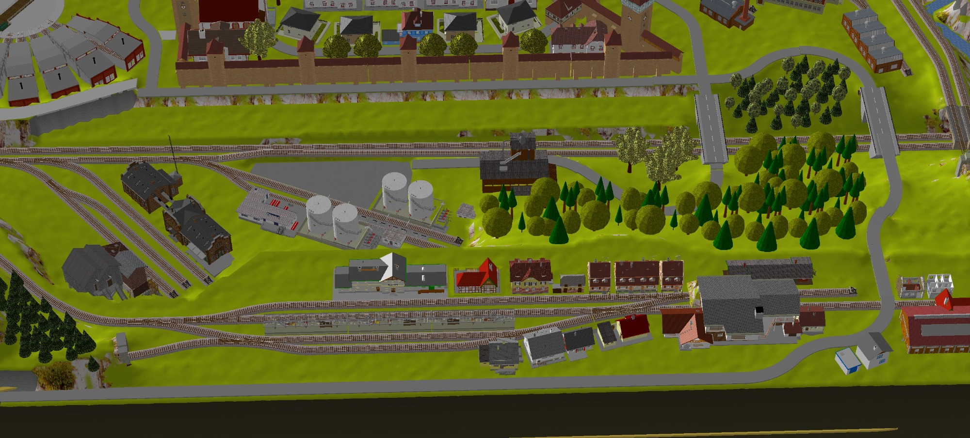 Mittelalterliche Stadt mit Stadtmauer, 3 Bahnhöfe (1x 5-gleisig, 1x 3-gleisig, 1x 1-gleisig), 2-gleisige Hauptstrecke, 1 große Paradestrecke, 1 gleisige Nebenstrecke mit Verbindung zum Hauptbahnhof, 1 Schattenbahnhof insgesamt 13-gleisig, 1 Abstellbahnhof 5-gleisig, kleines Bahnbetriebswerk mit Ringlockschuppen (3 Segmente), 2x Abstellgleise mit Kohleverladung, 2 Abstellgleise mit Sägewerk, 1 Abstellgleis mit Metallindustrie, Berg mit Alpendorf, 1 Bahnübergang, Fluß, sowie ein Bachlauf mit Sägewerk.