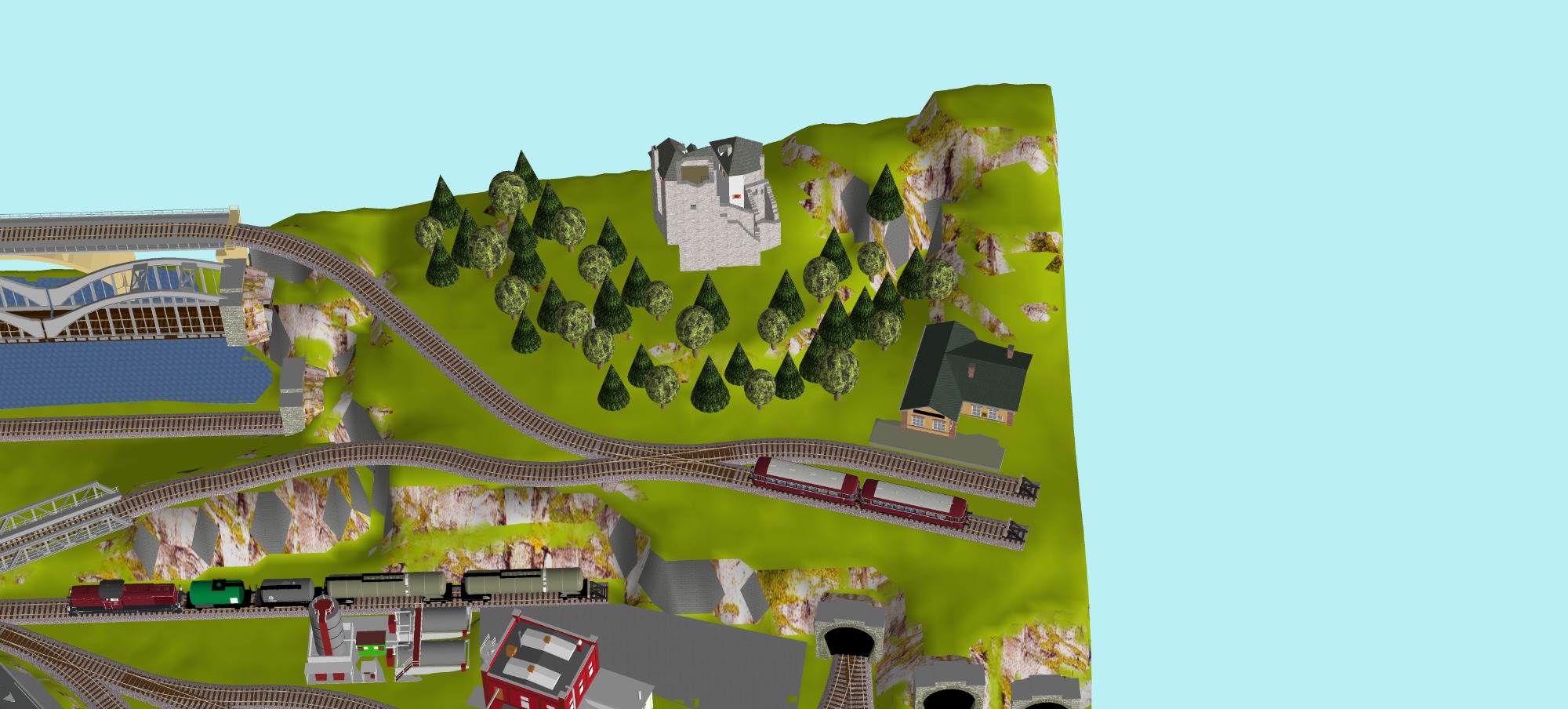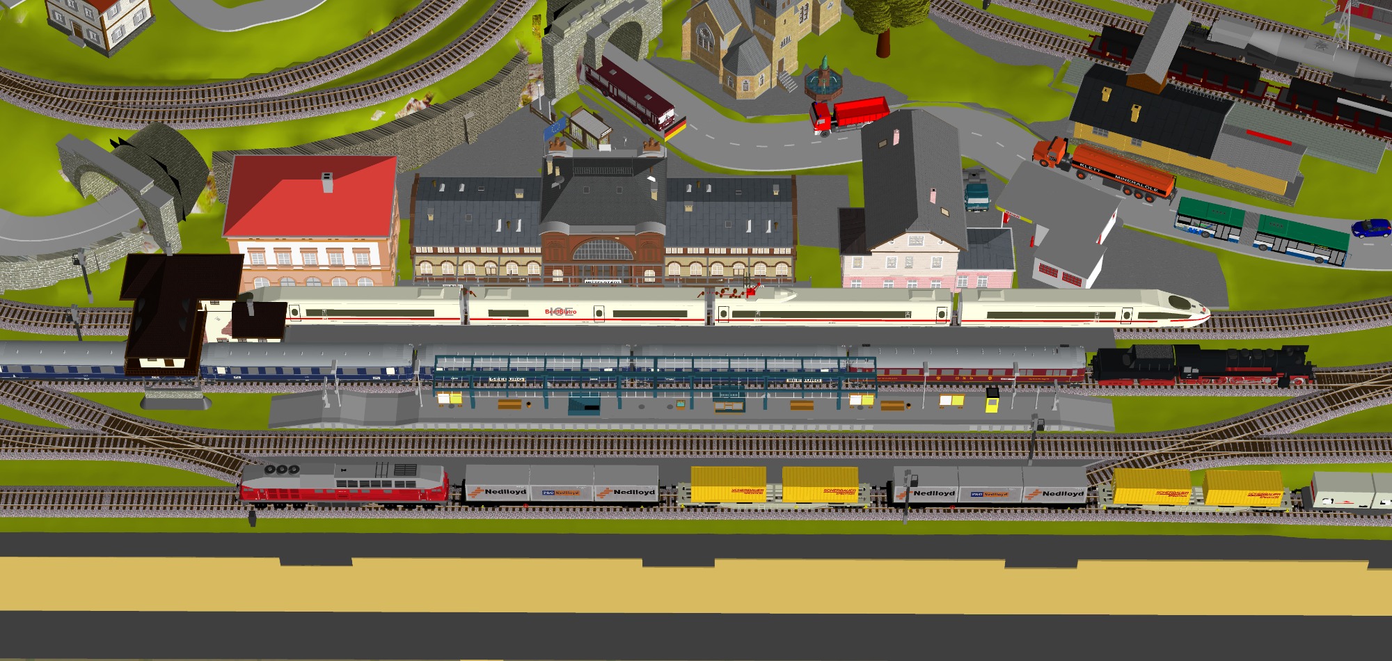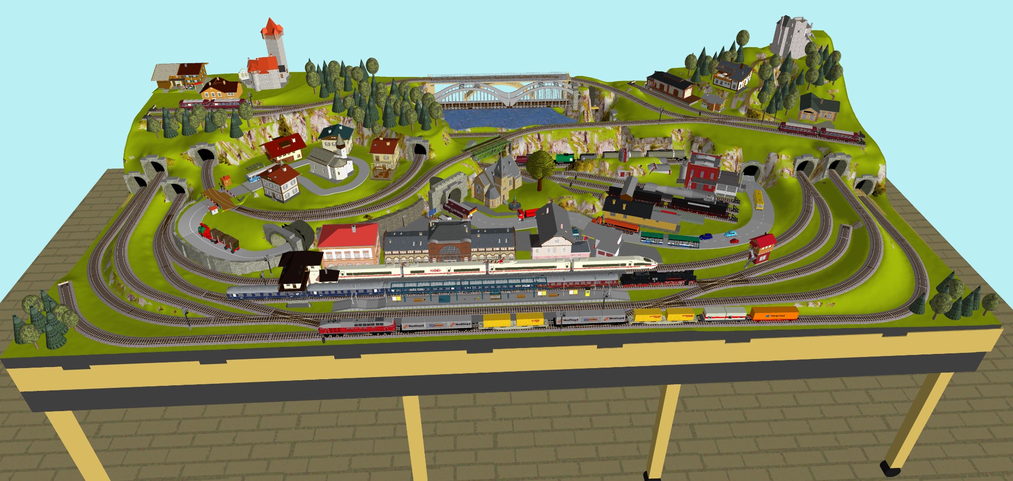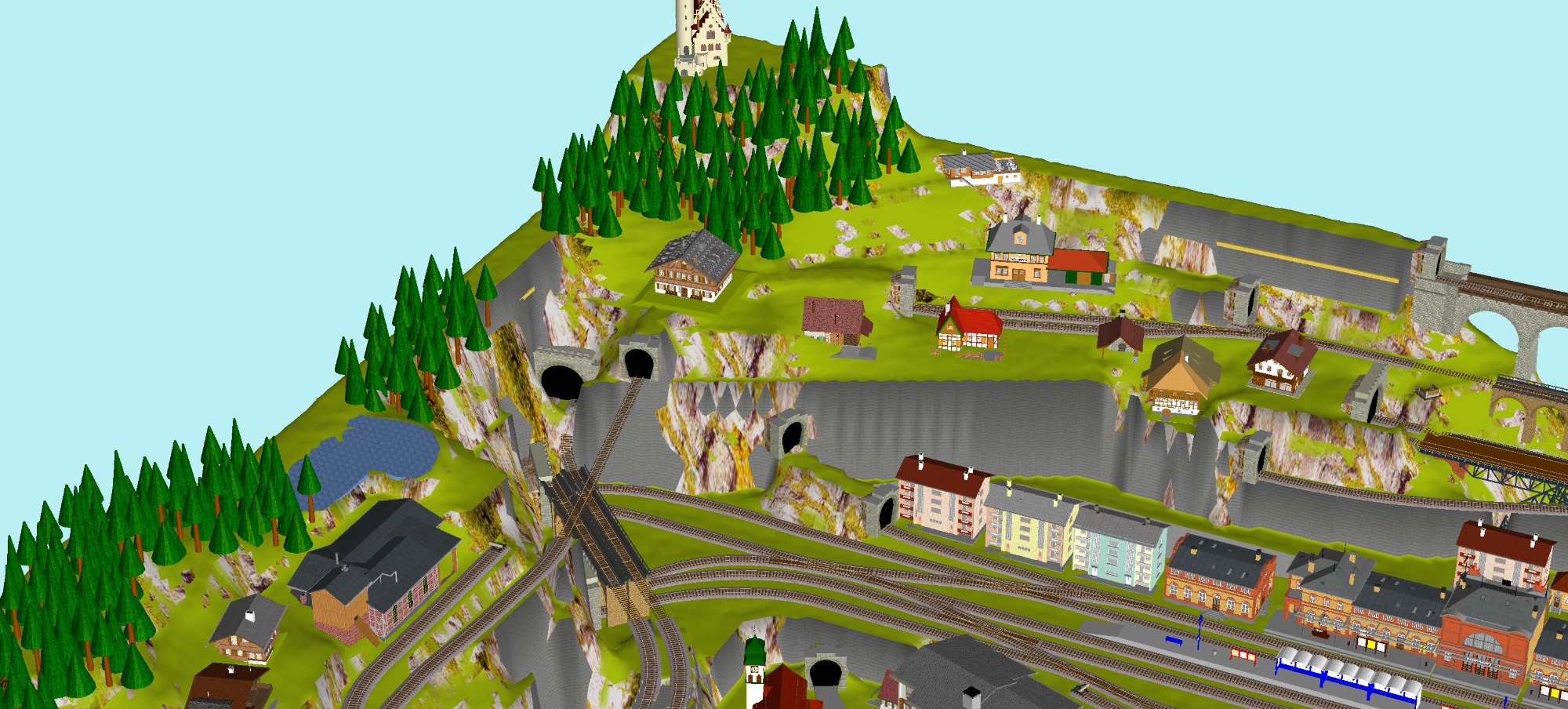 Mittelalterliche Stadt mit Stadtmauer, 3 Bahnhöfe (1x 5-gleisig, 1x 3-gleisig, 1x 1-gleisig), 2-gleisige Hauptstrecke, 1 große Paradestrecke, 1 gleisige Nebenstrecke mit Verbindung zum Hauptbahnhof, 1 Schattenbahnhof insgesamt 13-gleisig, 1 Abstellbahnhof 5-gleisig, kleines Bahnbetriebswerk mit Ringlockschuppen (3 Segmente), 2x Abstellgleise mit Kohleverladung, 2 Abstellgleise mit Sägewerk, 1 Abstellgleis mit Metallindustrie, Berg mit Alpendorf, 1 Bahnübergang, Fluß, sowie ein Bachlauf mit Sägewerk.