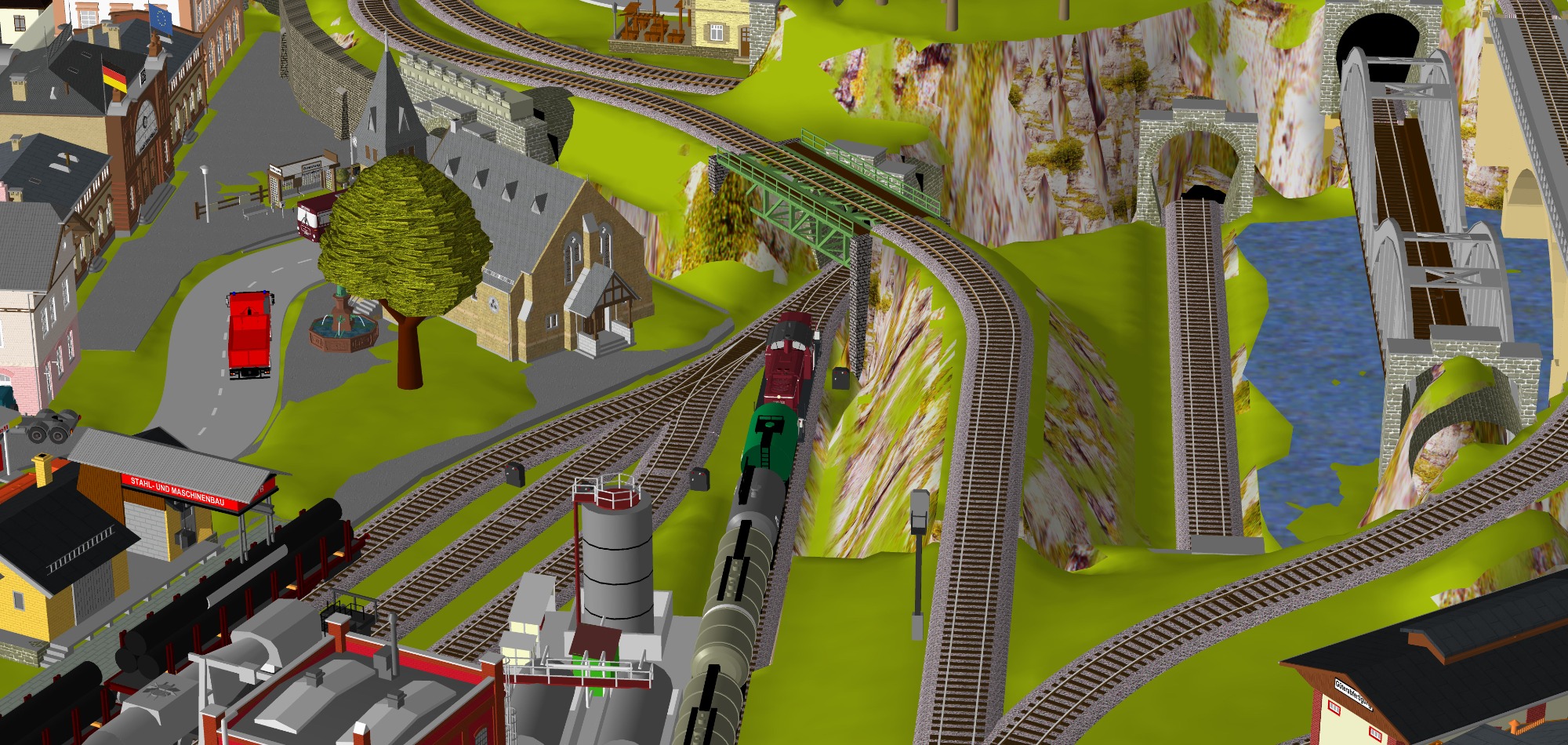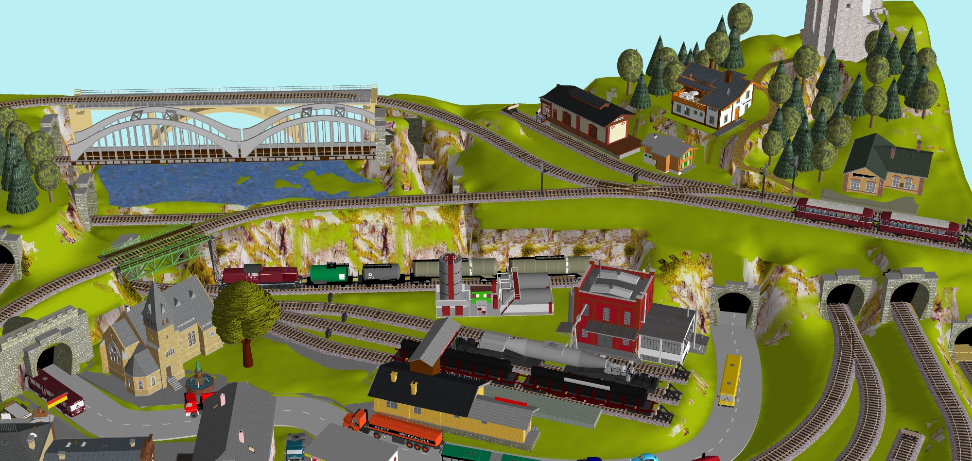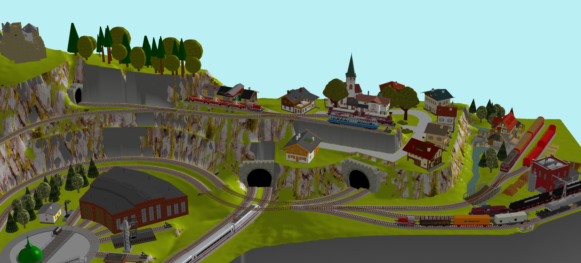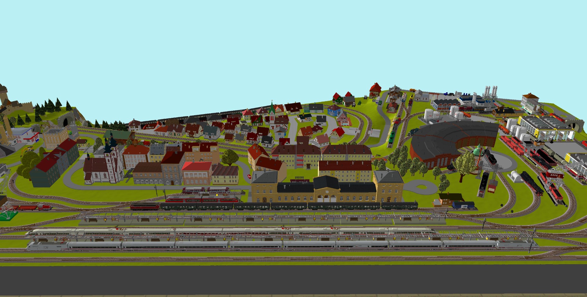 Kleinstadt-Idylle mit 1 Bahnhof (1x 8-gleisig) mit 2-gleisiger Hauptstrecke, 1 gleisige Nebenstrecke mit 1 Bahnhof (2-gleisig) Endbahnhof (2-gleisig), 1 Drehscheibe mit 12x Abstellgleise mit Lokschuppen (9 Segmente), 3 Abstellgleise für Kohleverladung, großes Bahnbetriebswerk, 2x Abstellgleise für Tanklager, 4x Abstellgleis für Industrie, 1x Hafen mit großem Industriegebiet mit 9 Abstellgleisen, 1 Berg mit Burg, Alpendorf, Für Car-System geeignet - Straßen 2spurig mit 3 Wendekreise, 2 lange Tunnel (zu den Schatten- und Abstellbahnhöfen), 2 Schattenbahnhöfe je 6-gleisig (insgesamt 12 Gleise), 2 Abstellbahnhöfe je 7-gleisig (insgesamt 14-gleisig), 2 Bahnübergänge