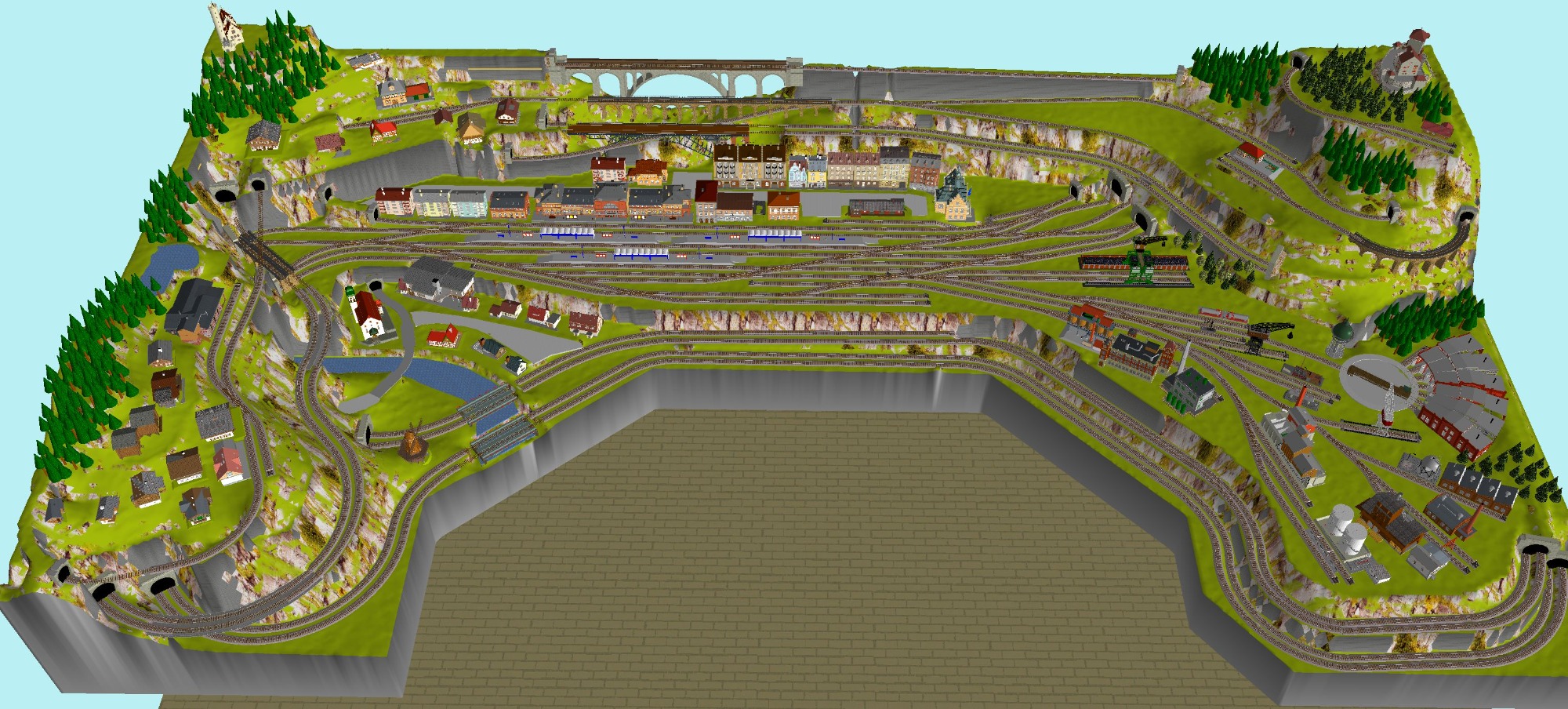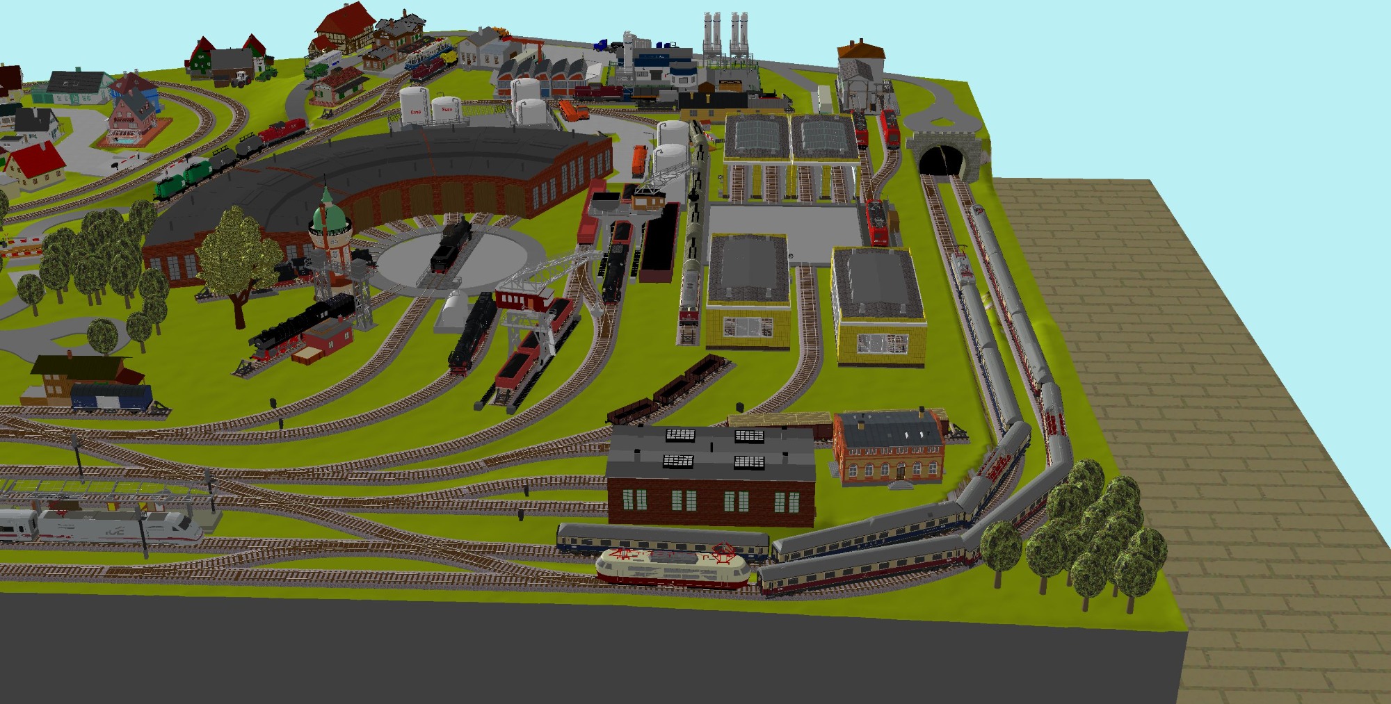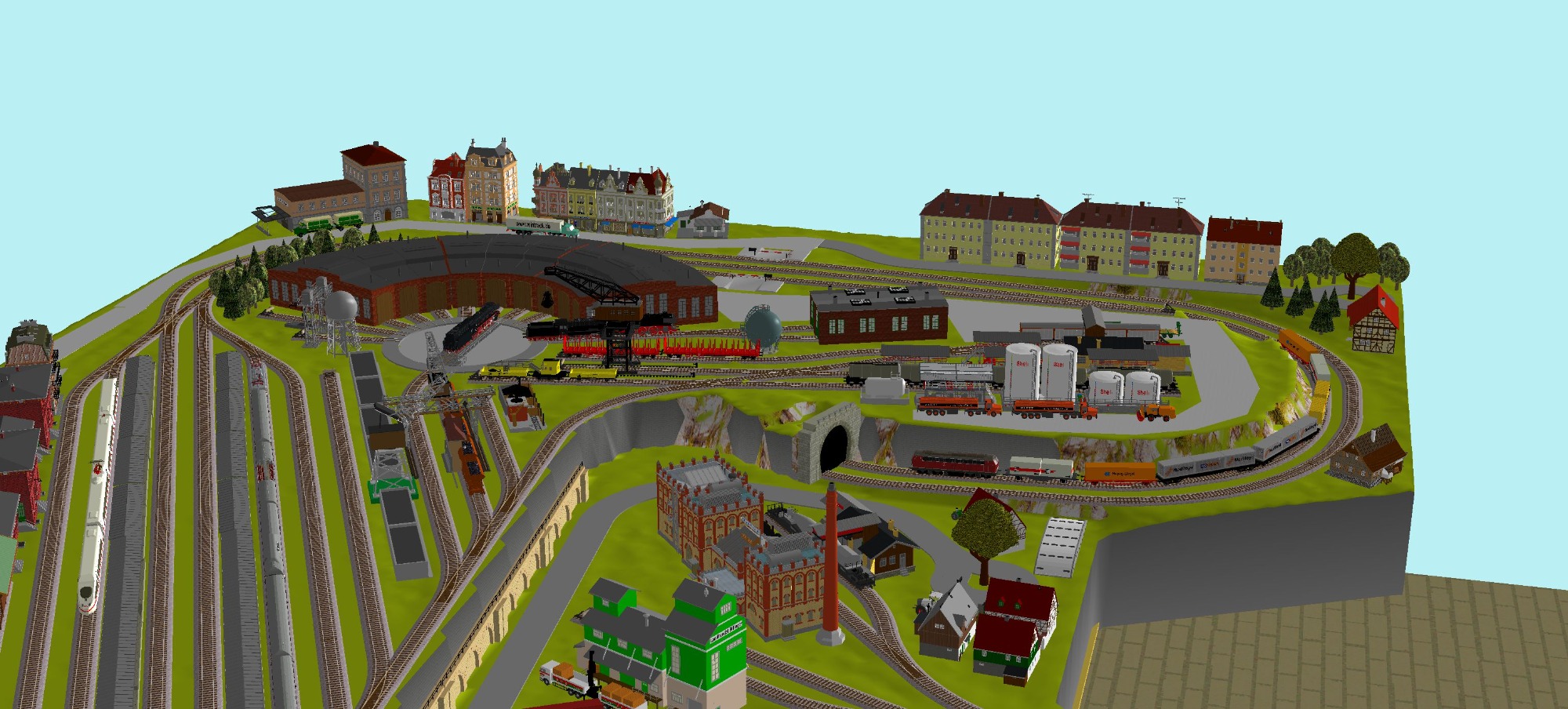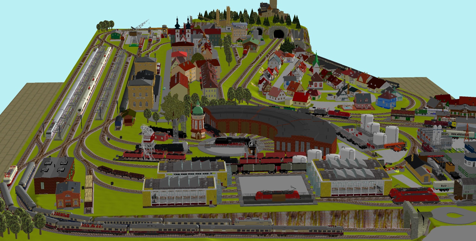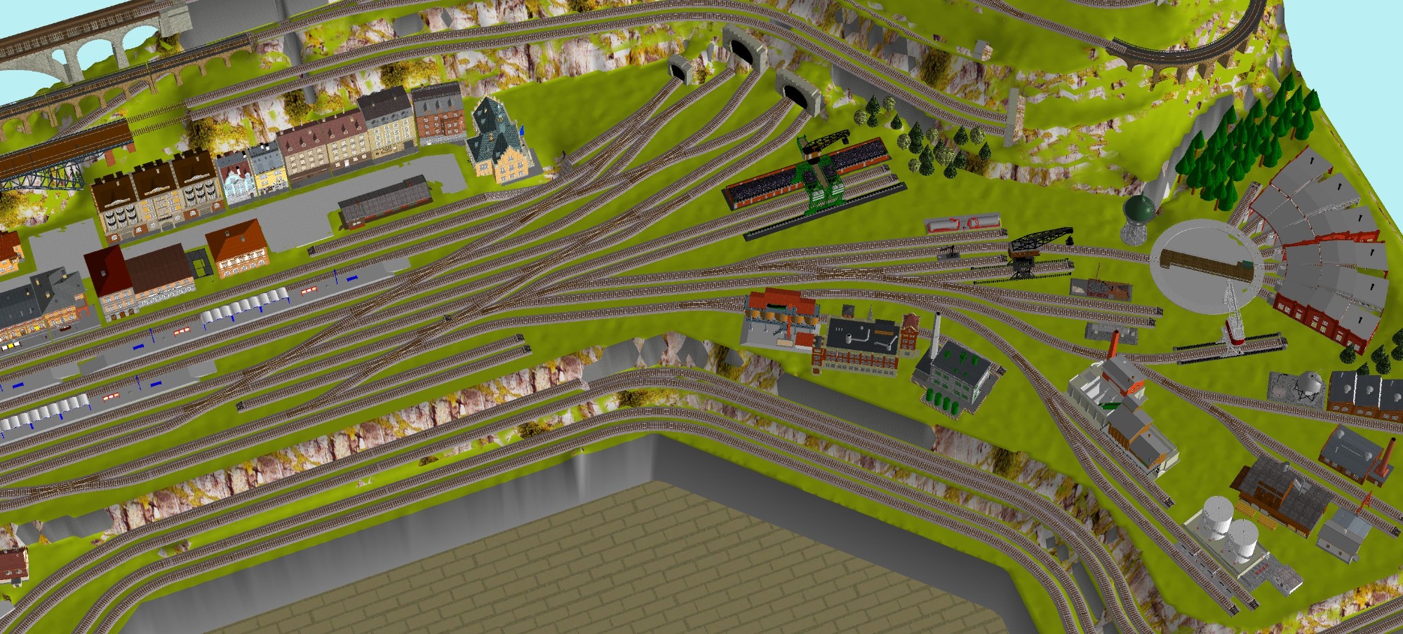 7 Schattenbahnhöfe, davon 4 Schattenbahnhöfe (insgesamt 22-gleisig,m 3 Abstellbahnhöfe ( insgesamt 28-gleisig) - Großes Bahnbetriebswerk mit Ringlockschuppen 6-spännig, Wasserturm, Kohleverladung usw. - 4 Paradestrecken, 2x Hauptstrecke und 2x Nebenstrecke, 1 Abstellgleis mit Sägewerk, 7 Abstellgleise im Industriegebiet mit 9 Fabriken, Berg mit Bergsee, sowie Alpendorf, Burg, Fluss und vieles mehr