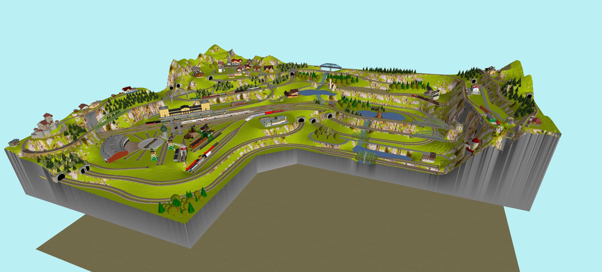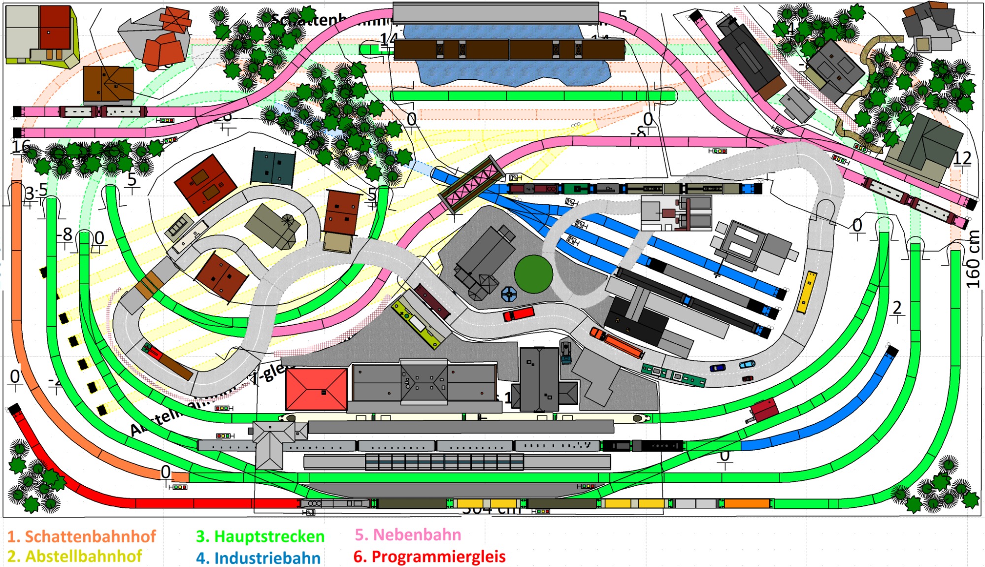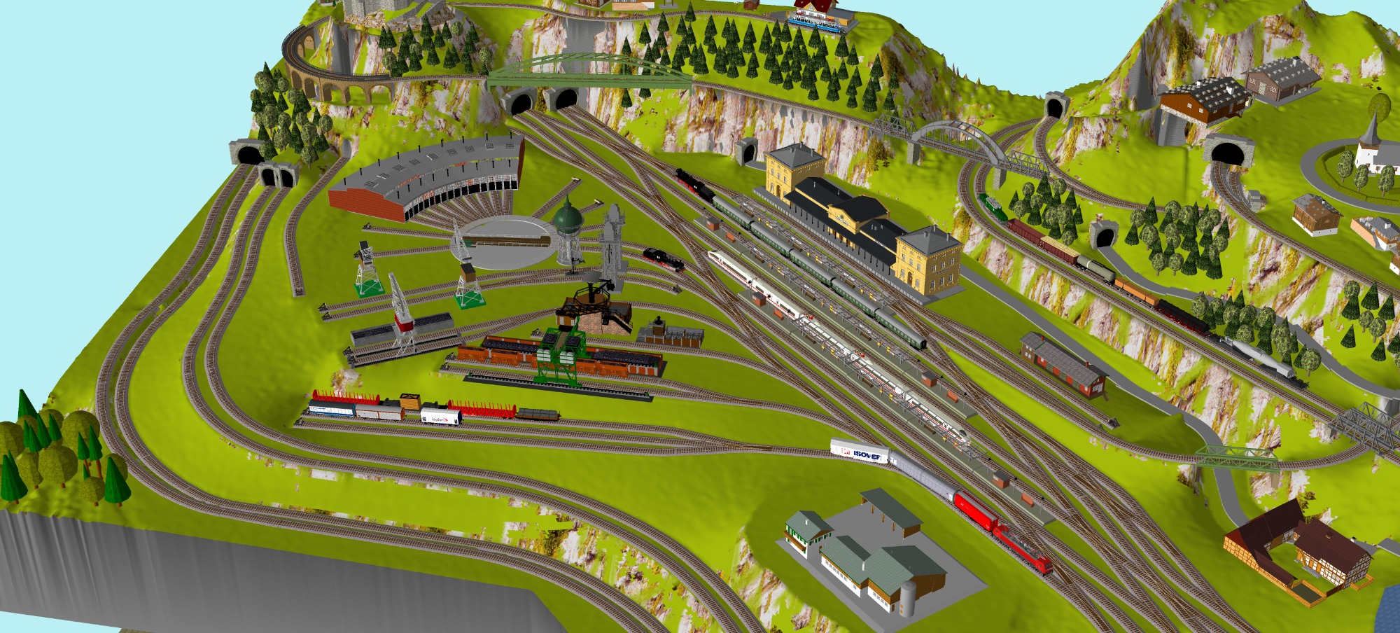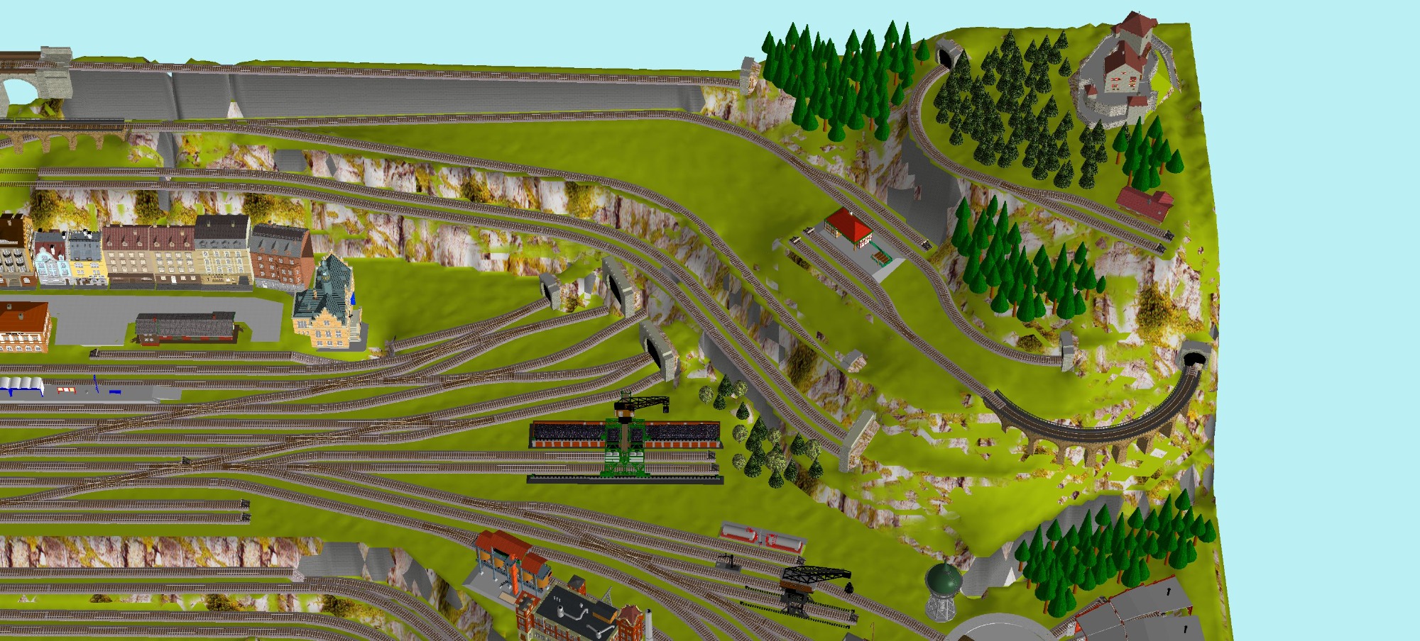 7 Schattenbahnhöfe, davon 4 Schattenbahnhöfe (insgesamt 22-gleisig,m 3 Abstellbahnhöfe ( insgesamt 28-gleisig) - Großes Bahnbetriebswerk mit Ringlockschuppen 6-spännig, Wasserturm, Kohleverladung usw. - 4 Paradestrecken, 2x Hauptstrecke und 2x Nebenstrecke, 1 Abstellgleis mit Sägewerk, 7 Abstellgleise im Industriegebiet mit 9 Fabriken, Berg mit Bergsee, sowie Alpendorf, Burg, Fluss und vieles mehr