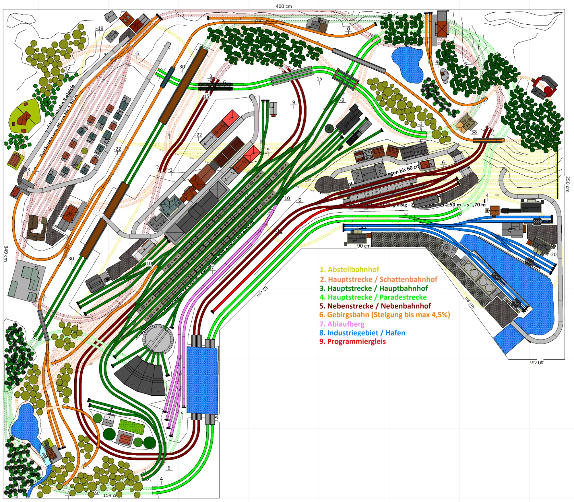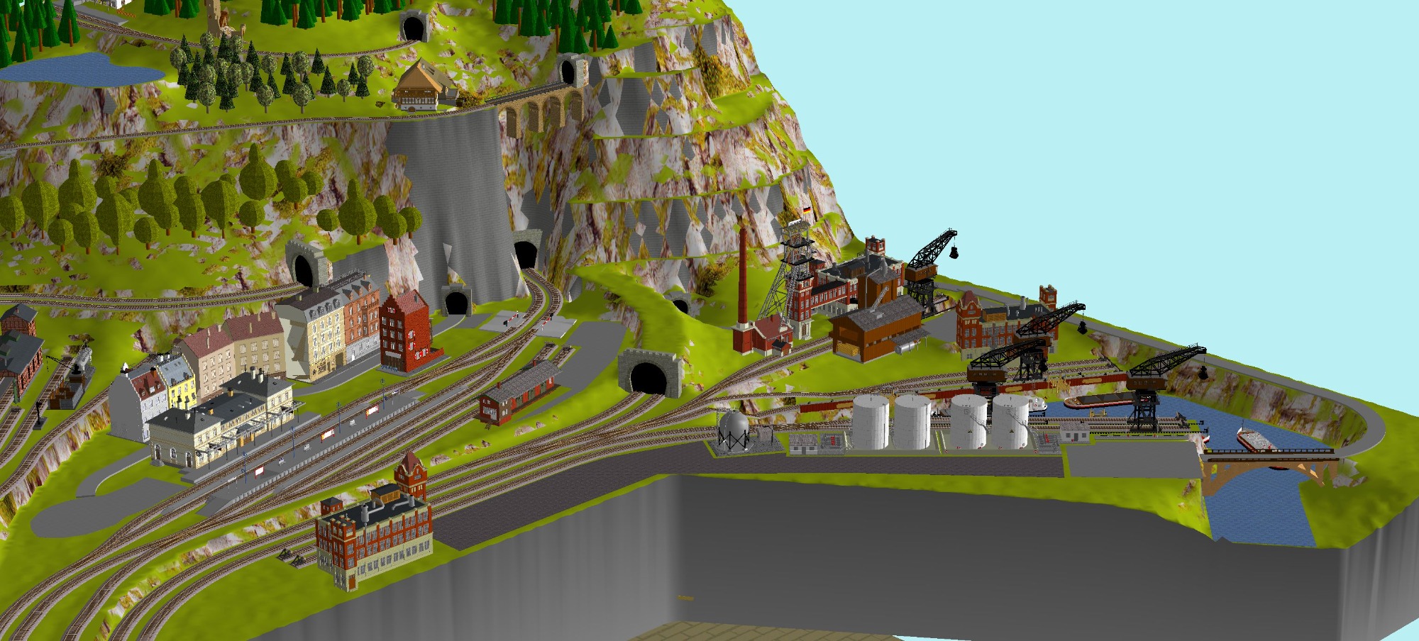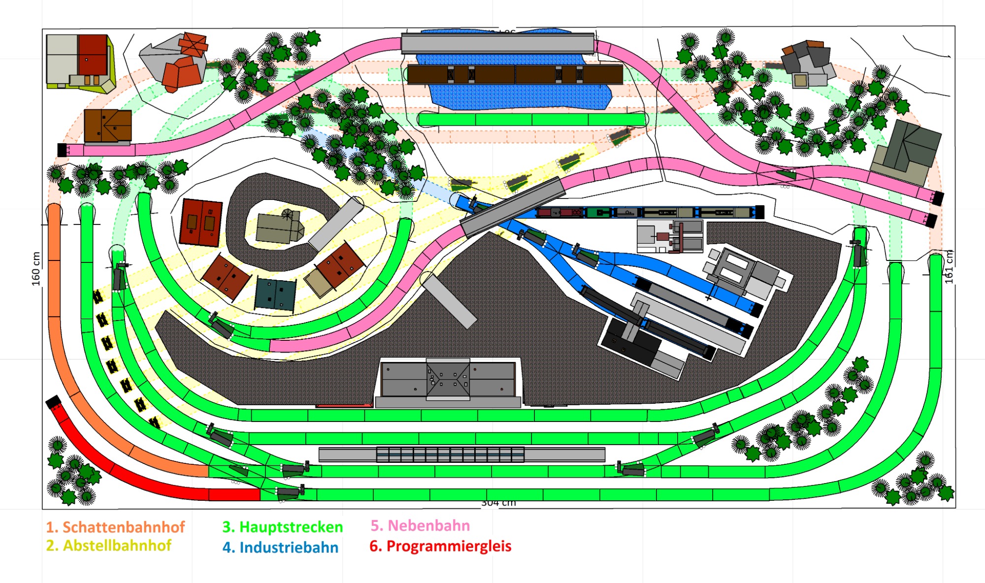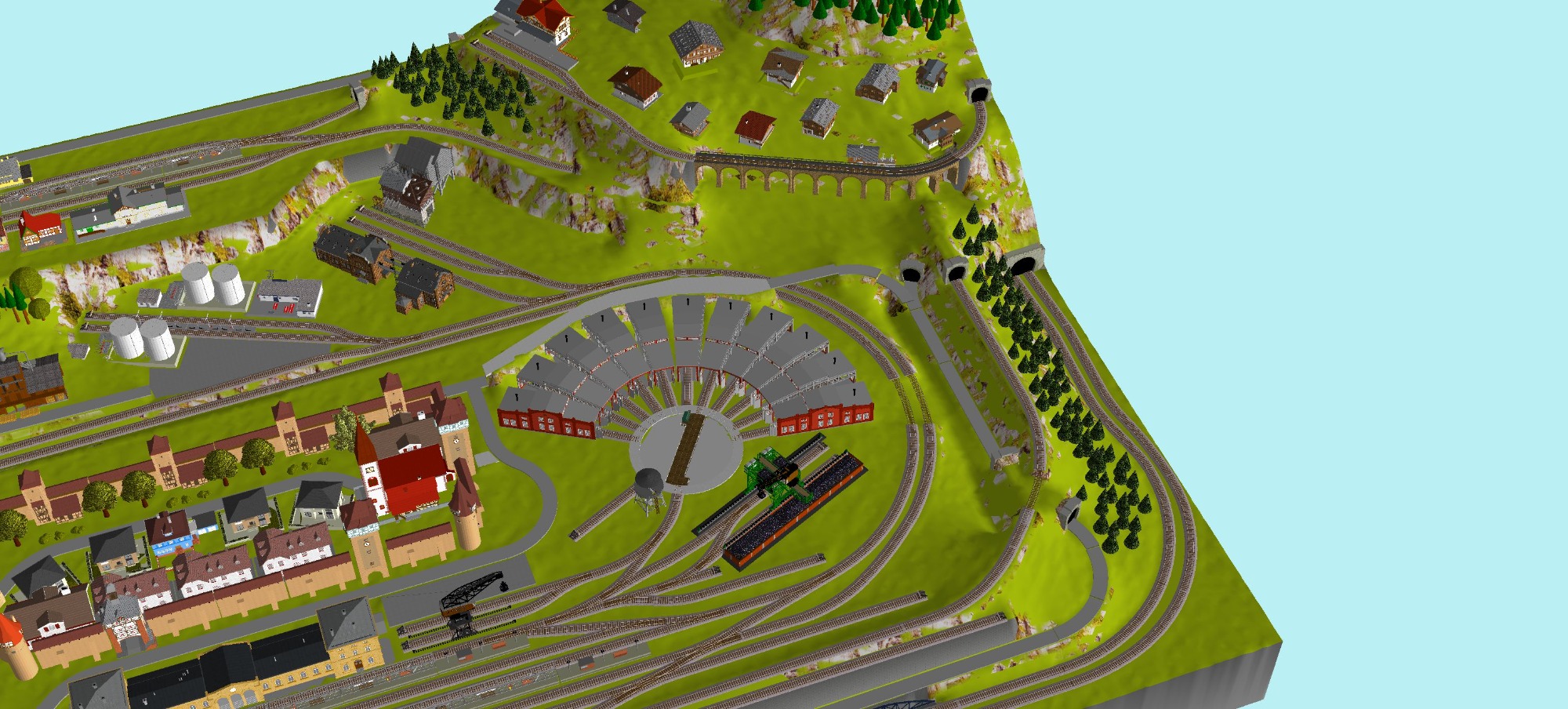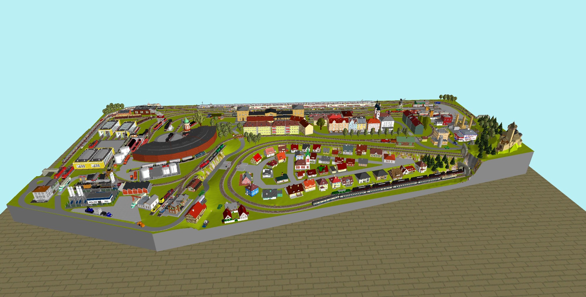 7 Schattenbahnhöfe, davon 4 Schattenbahnhöfe (insgesamt 22-gleisig,m 3 Abstellbahnhöfe ( insgesamt 28-gleisig) - Großes Bahnbetriebswerk mit Ringlockschuppen 6-spännig, Wasserturm, Kohleverladung usw. - 4 Paradestrecken, 2x Hauptstrecke und 2x Nebenstrecke, 1 Abstellgleis mit Sägewerk, 7 Abstellgleise im Industriegebiet mit 9 Fabriken, Berg mit Bergsee, sowie Alpendorf, Burg, Fluss und vieles mehr