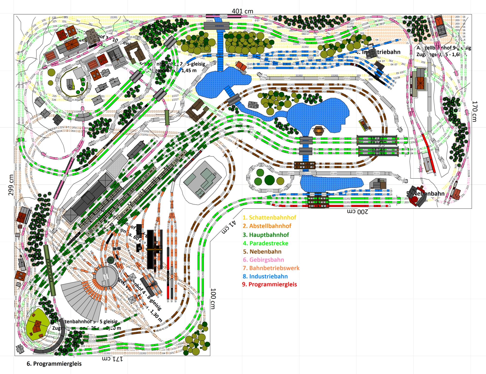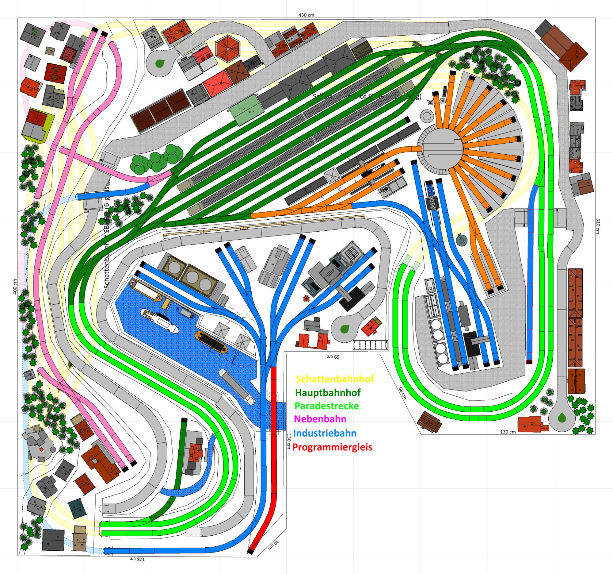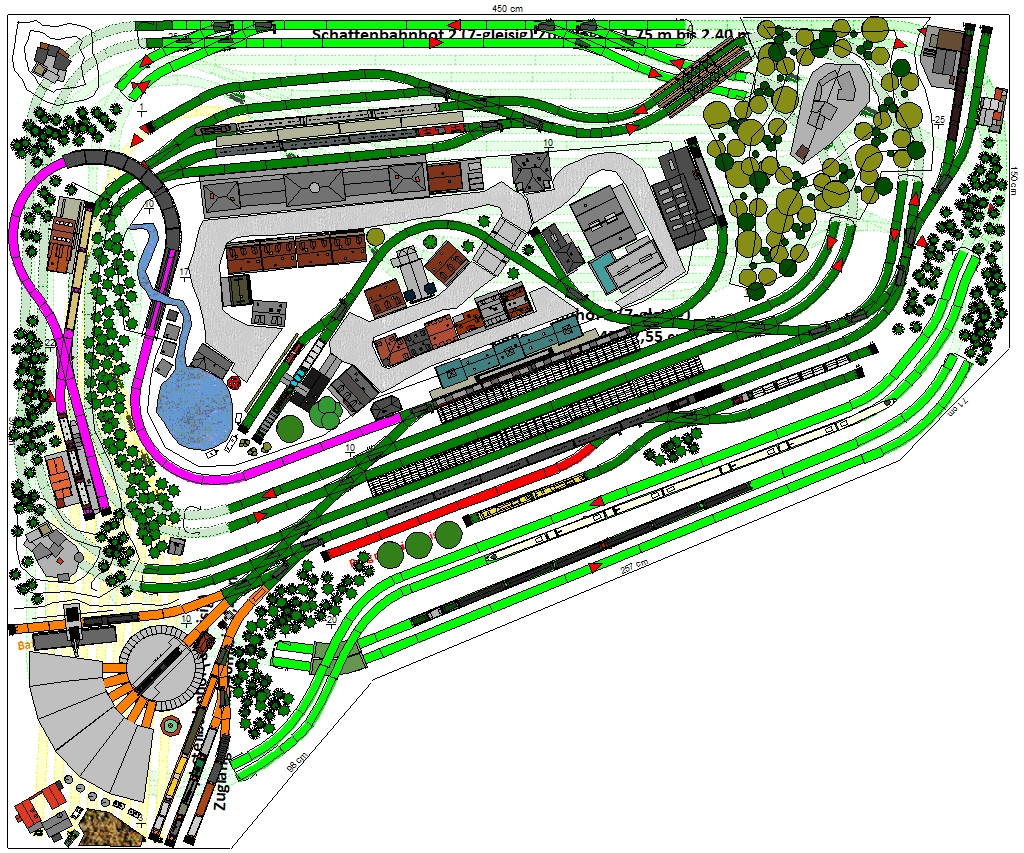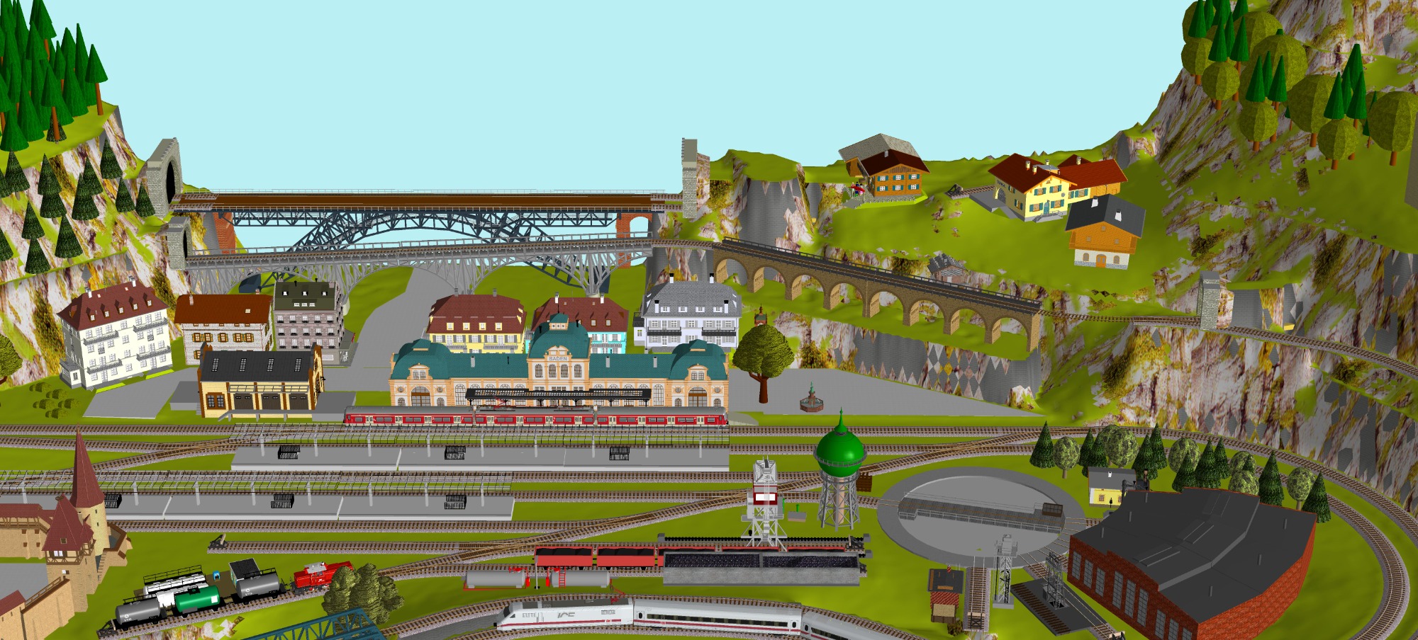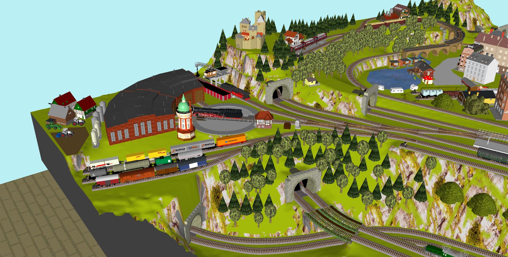 7 Schattenbahnhöfe, davon 4 Schattenbahnhöfe (insgesamt 22-gleisig,m 3 Abstellbahnhöfe ( insgesamt 28-gleisig) - Großes Bahnbetriebswerk mit Ringlockschuppen 6-spännig, Wasserturm, Kohleverladung usw. - 4 Paradestrecken, 2x Hauptstrecke und 2x Nebenstrecke, 1 Abstellgleis mit Sägewerk, 7 Abstellgleise im Industriegebiet mit 9 Fabriken, Berg mit Bergsee, sowie Alpendorf, Burg, Fluss und vieles mehr