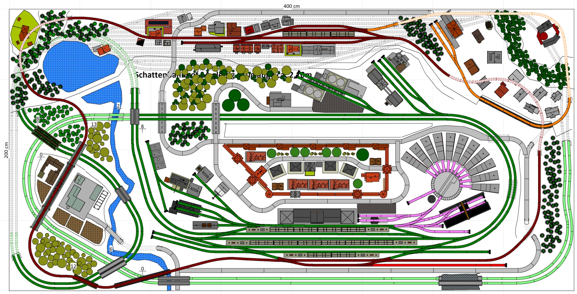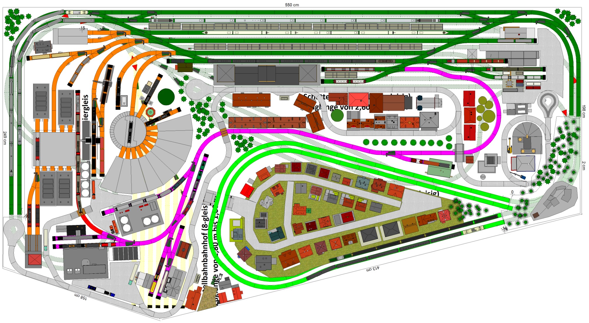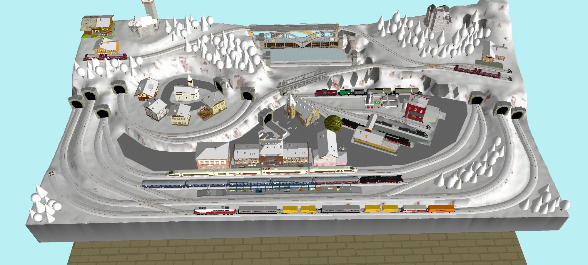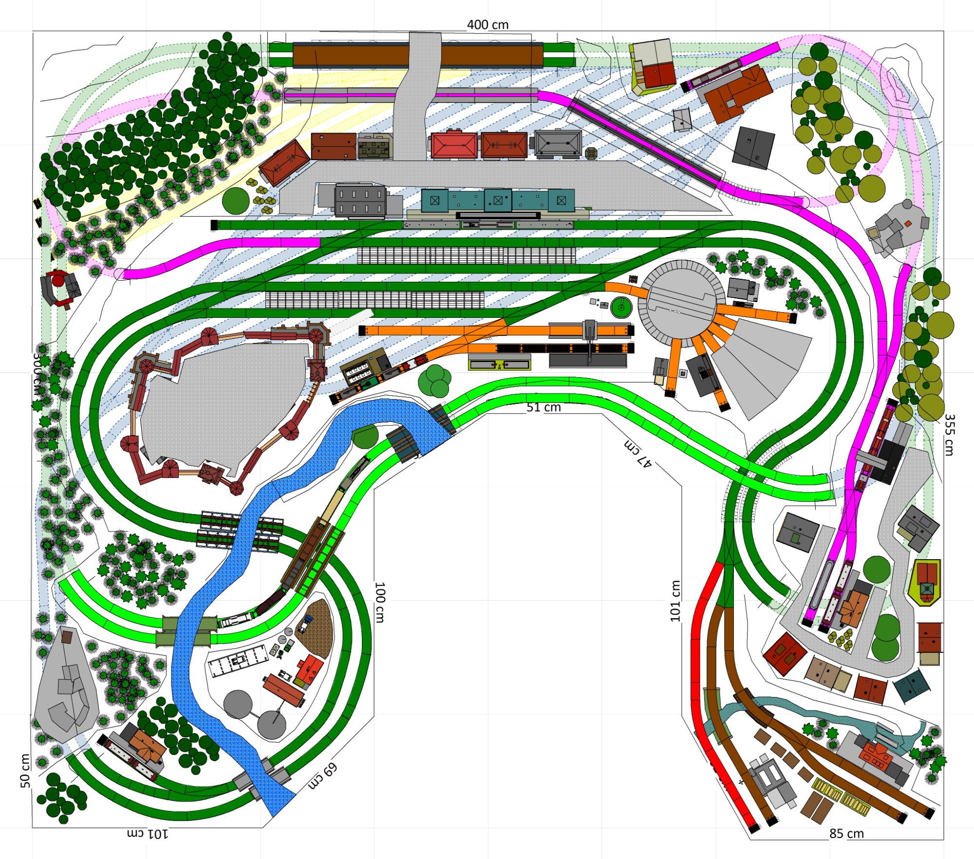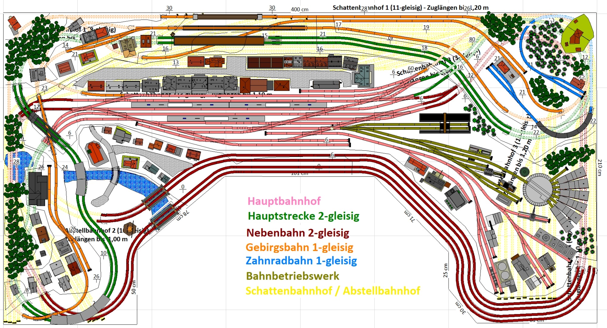 7 Schattenbahnhöfe, davon 4 Schattenbahnhöfe (insgesamt 22-gleisig,m 3 Abstellbahnhöfe ( insgesamt 28-gleisig) - Großes Bahnbetriebswerk mit Ringlockschuppen 6-spännig, Wasserturm, Kohleverladung usw. - 4 Paradestrecken, 2x Hauptstrecke und 2x Nebenstrecke, 1 Abstellgleis mit Sägewerk, 7 Abstellgleise im Industriegebiet mit 9 Fabriken, Berg mit Bergsee, sowie Alpendorf, Burg, Fluss und vieles mehr