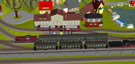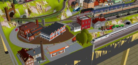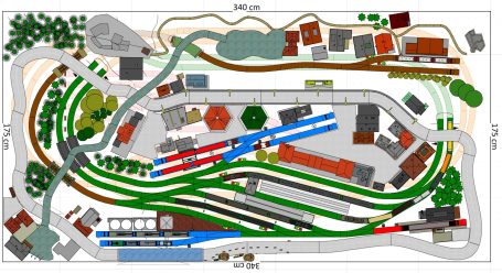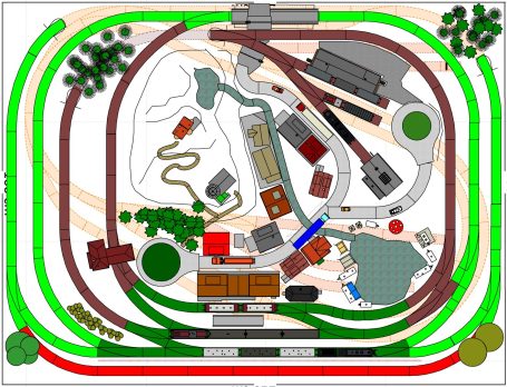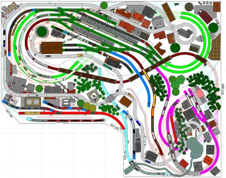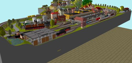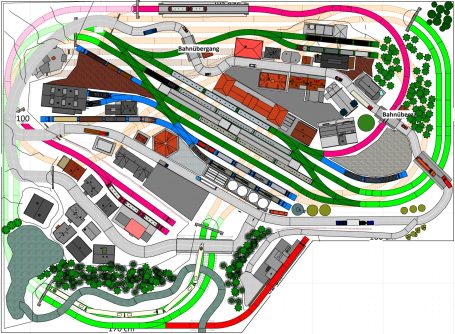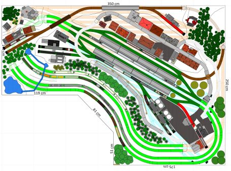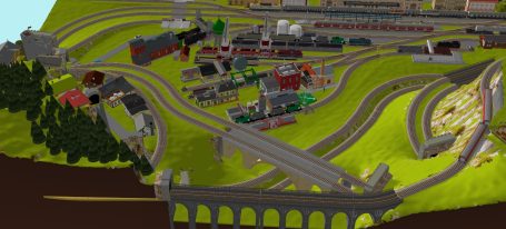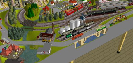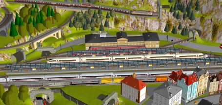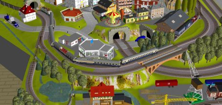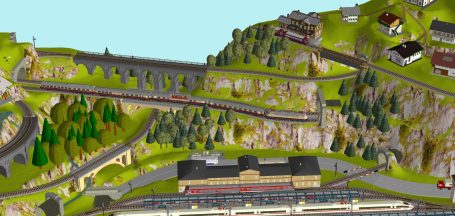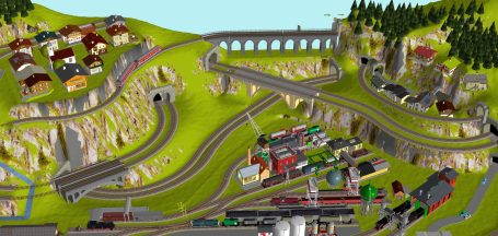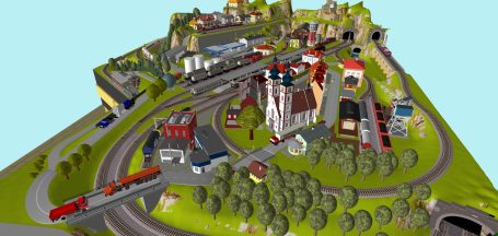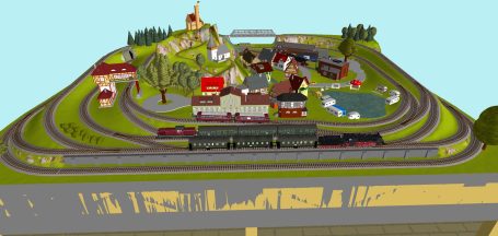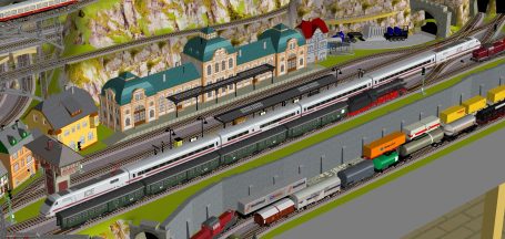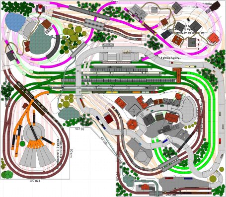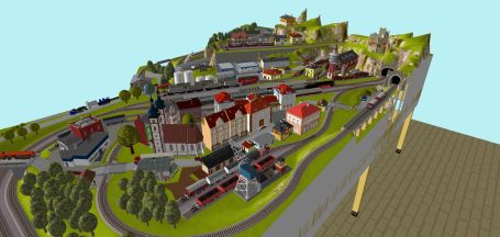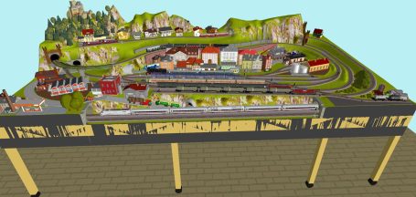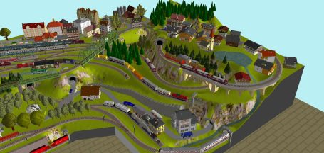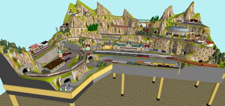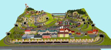 Große Stadt mit 1 Hauptbahnhof (7-gleisig) und 2-gleisiger Hauptstrecke mit langer Paradestrecke, 1-gleisige Nebenstrecke mit 2 Endbahnhöfen (2x 1-gleisig) - 4 Schattenbahnhöfe insgesamt 19-gleisig (1x6-gleisig, 1x 5-gleisig, 2x 4-gleisig), 3 Abstellbahnhöfe 14-gleisig (1x7-gleisig, 1x 4-gleisig, 1x 3-gleisig) - Mittleres Bahnbetriebswerk mit 6-spännigem Ringlokschuppen mit Drehscheibe, sowie 4 Abstellgleise, Wasserturm, Wasserfüllanlage usw. - 1 Abstellgleis mit Güterschuppen, 2 Abstellgleise mit Güterschuppen und Sägemühle, sowie Verladekran, 1 Berg mit Bergsee mit Staumauer, 2. See als Erholungsgebiet mit Burg, Ablauf zum 3. See und zum 4. See über Bachlauf zur Sägemühle - 2. Berg mit großem Alpendorf und Endbahnhof, 3 Bahnübergänge -