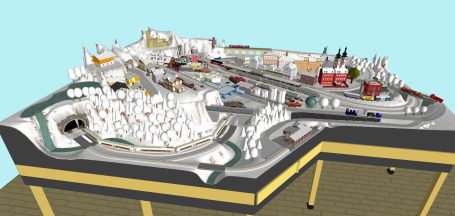 1 Bahnhof (1x 4-gleisig) - 2-gleisige Hauptstrecke mit Paradestrecke, 1 gleisige Nebenstrecke mit 3 Endbahnhöfen (3x 2-gleisig) und Abzweig zum Kieswerk mit Steinbruch und Kiesverladung mit 2 Abstellgleisen. - 1 Zahnradbahn mit Endbahnhof - 2 Schattenbahnhöfe insgesamt 8-gleisig (2x 4-gleisig) - 1 kleines Bahnbetriebswerk mit 2-spännigen Lokschuppen, Kohleverladung, Wasserturm und Wassertankstelle, 1x Abstellgleis mit Wassermühle als Programmiergleis