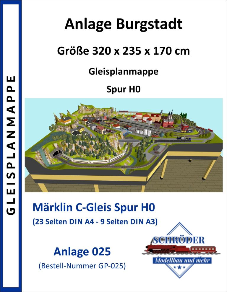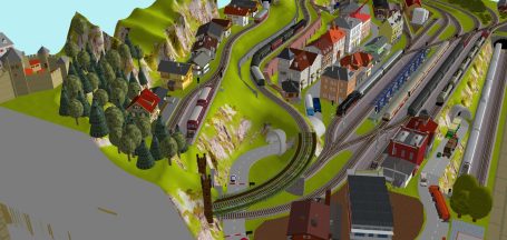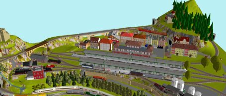 Mittlere Stadt mit 1 Hauptbahnhof (4-gleisig) und 2 -gleisiger Hauptstrecke , 1 gleisige Nebenstrecke mit Zwischenbahnhof (1-gleisig) und Endbahnhof 2-gleisig) - 2 Schattenbahnhöfe insgesamt 10-gleisig (2x 5-gleisig), 3 Abstellbahnhöfe insgesamt 14-gleisig (1x6-, 1x5- und 1x3-gleisig) - Mittleres Bahnbetriebswerk mit 2-gleisigem Lokschuppen, Kohleverladung, Wasserturm, usw. x Abstellgleis mit 2-gleisigem Fahrleitungsmeisterei - 1 Abstellgleis mit Sägemühle auf der Nebenbahn, 1x Abstellgleis mit Tanklager, 2 Abstellgleise mit Güterschuppen, 2x Abstellgleise für Maschinenbau, Brauerei und Maschinenfabrik - 1 großes ländliches Alpendorf, Berg mit Burg, 1 Bahnübergang. Anlage für Car-System geeignet, mit 2 Wendekreisen (2-spurige Straßen)