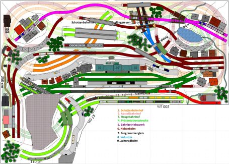 2-gleisige Hauptstrecke, 1 gleisige Nebenstrecke mit Endbahnhof 2-gleisig), 1 Schattenbahnhof insgesamt 10-gleisig (2x 5-gleisig), 1 Abstellbahnhof (9-gleisig) - 2 Paradestrecken der Hauptstrecke, einmal in den Schattenbahnhof und einmal aus dem Schattenbahnhof - 1 Abstellgleis mit 1-gleisigem Lokschuppen, 2x Abstellgeise mit Maschinenbauund Fabrik mit Anbau, 2x Abstellgleise mit Tanklager, 1x Abstellgleis als Programmiergleis und alter Maschinenfabrik, sowie Brauerei - 2 Berge mit je einer Burg, 3 Bahnübergänge, Bergsee mit Wasserfall und Bachlauf, Anlage für Car-System geeignet, mit Rundkreis und 2 Abzweigen (2-spurige Straßen)