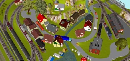 Gemütliches idyllisches Dorfleben mit 1 Bahnhof (3-gleisig) mit 2-gleisiger Hauptstrecke - 1 Schattenbahnhof 5-gleisig, 1 Abstellbahnhof (5-gleisig) - 2 x Abstellgleis mit Güterschuppen, 1 Abstellgleis mit 1-gleisigem Lokschuppen - 1x Berg mit Burg und Kirche auf Anhöhe, 1 großes ländliches Dorf mit See als Erholungsgebiet und Campingplatz, 1 Bahnübergang, Anlage für Car-System geeignet mit 2 Wendekreisen (2-spurige Straßen)