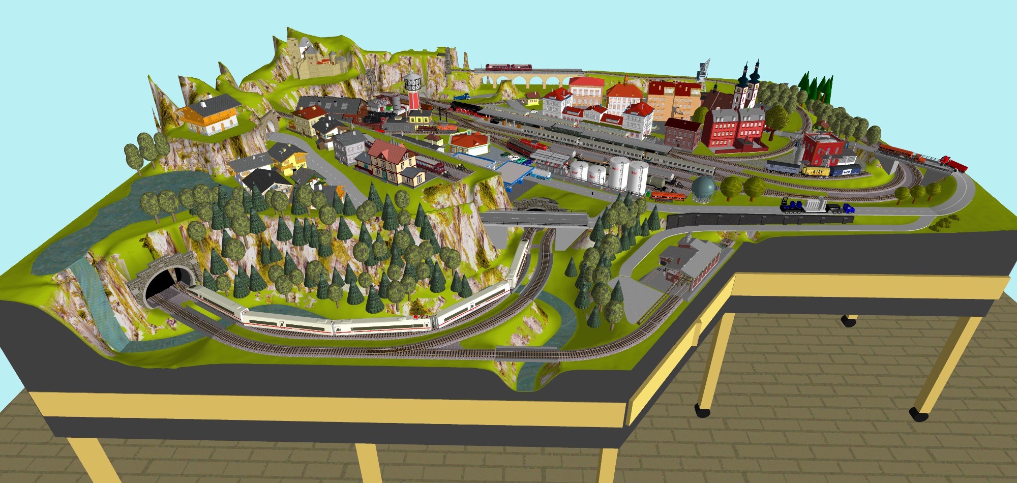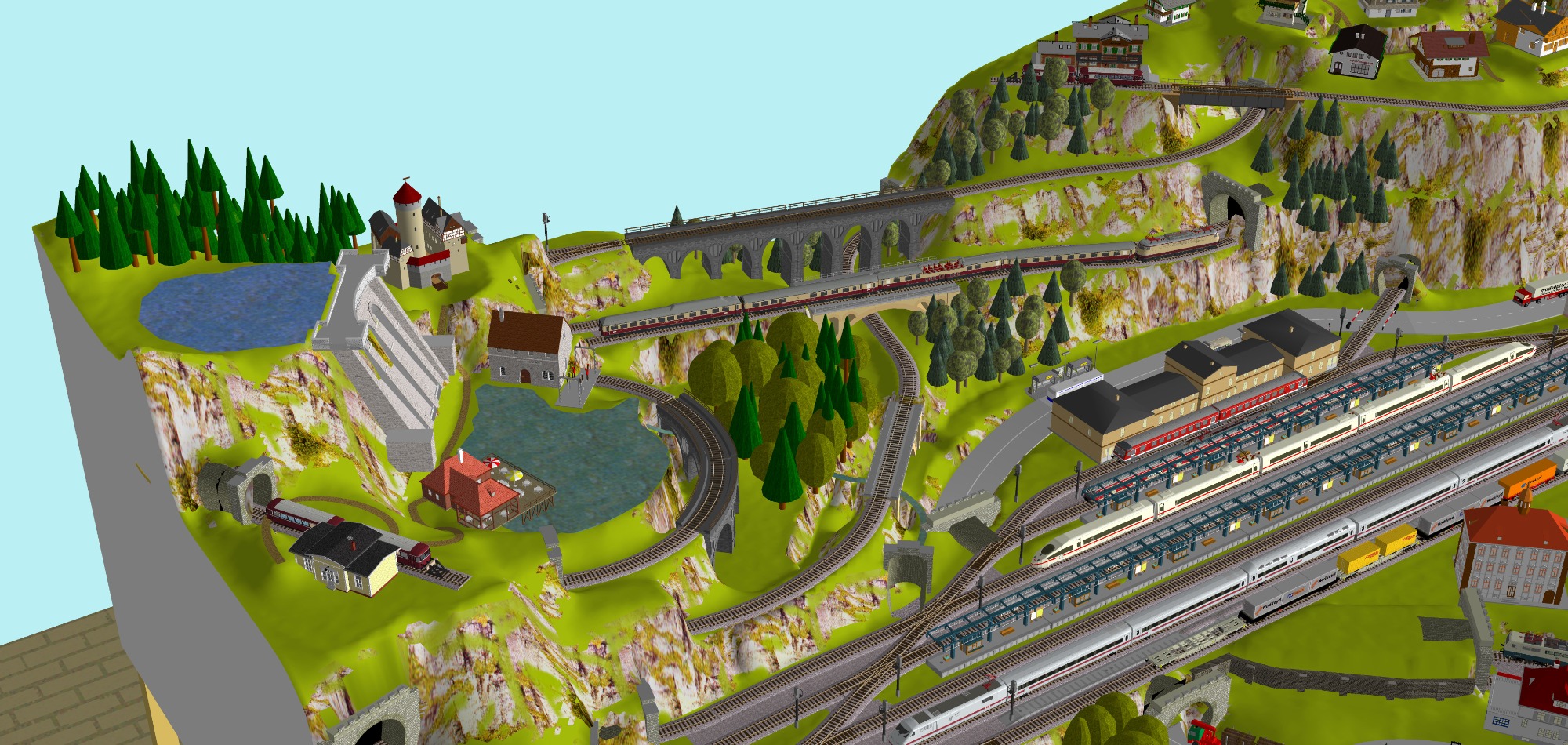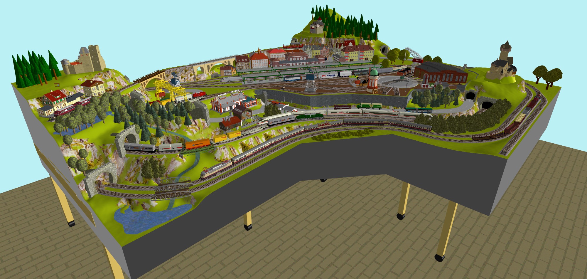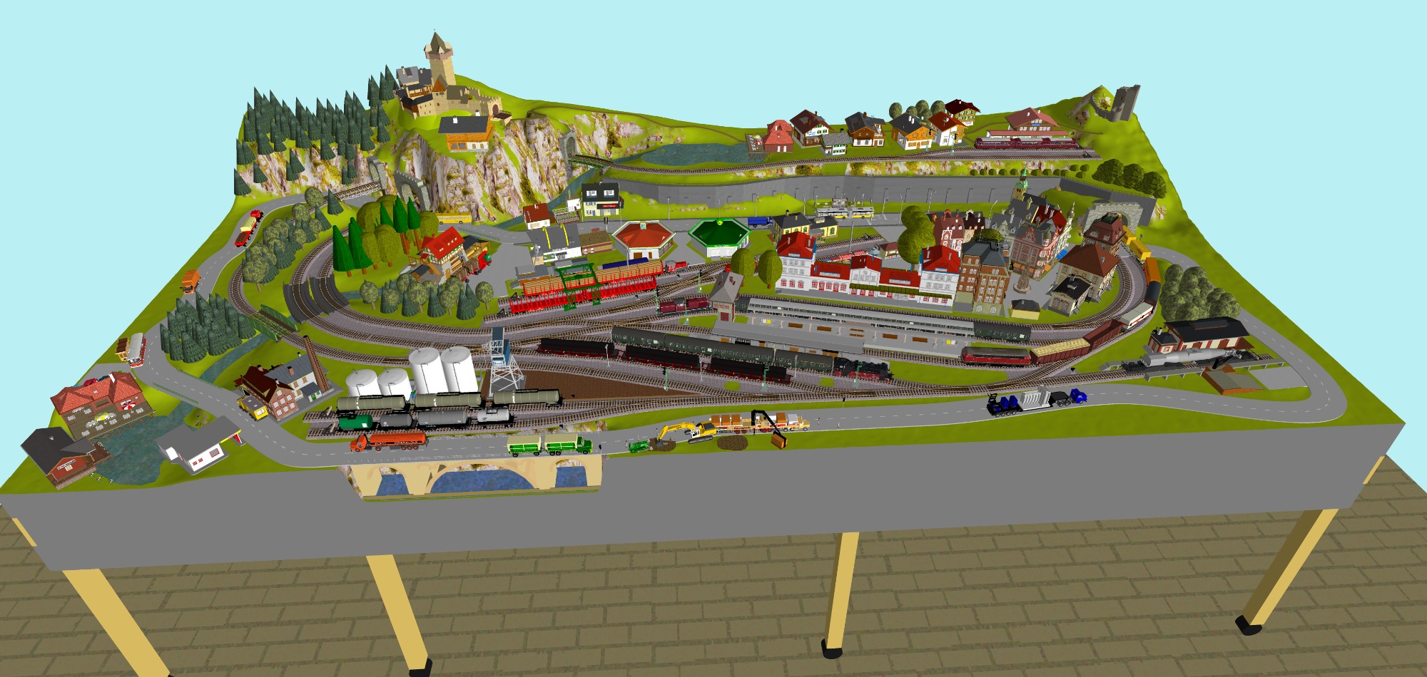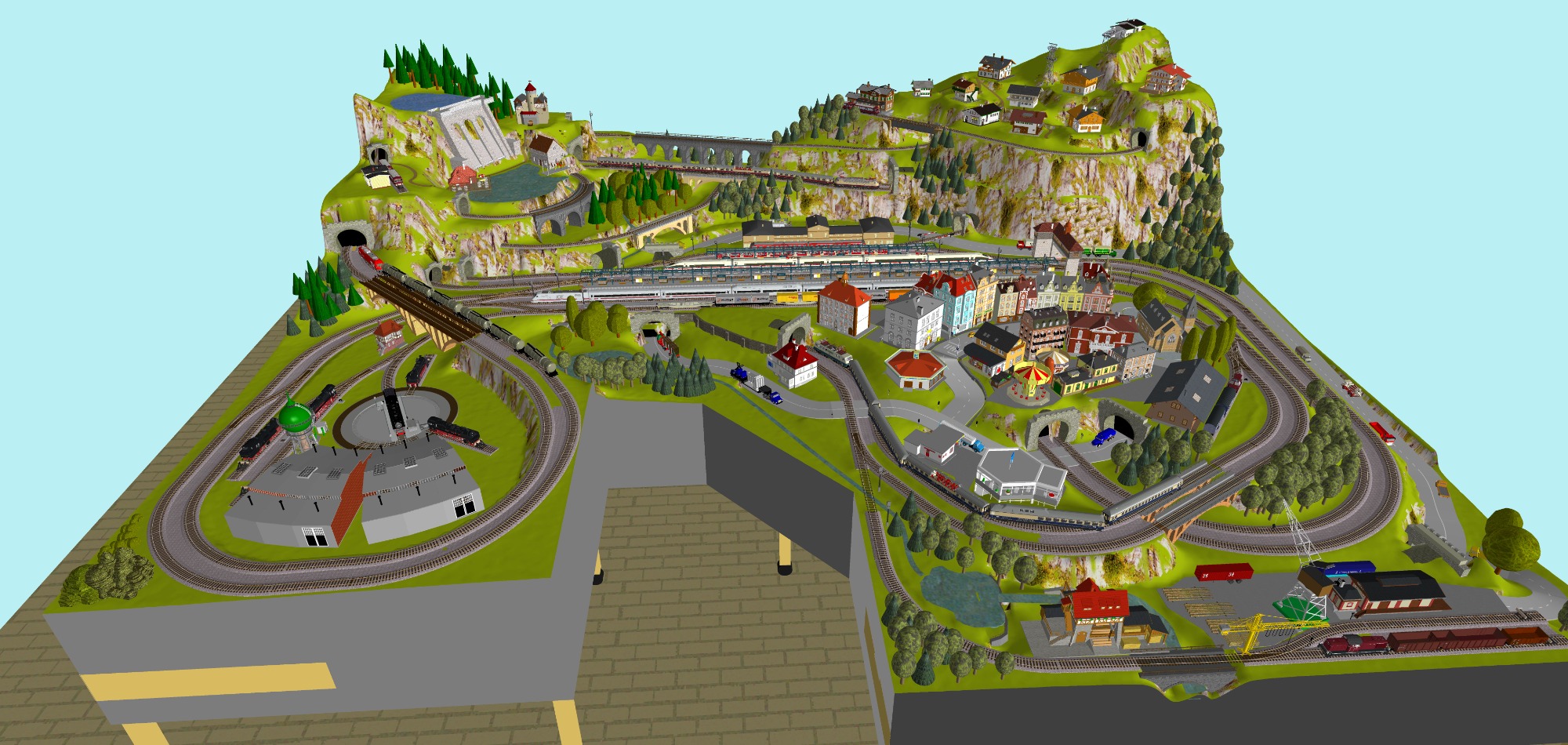 Große Stadt mit 1 Hauptbahnhof (7-gleisig) und 2-gleisiger Hauptstrecke mit langer Paradestrecke, 1-gleisige Nebenstrecke mit 2 Endbahnhöfen (2x 1-gleisig) - 4 Schattenbahnhöfe insgesamt 19-gleisig (1x6-gleisig, 1x 5-gleisig, 2x 4-gleisig), 3 Abstellbahnhöfe 14-gleisig (1x7-gleisig, 1x 4-gleisig, 1x 3-gleisig) - Mittleres Bahnbetriebswerk mit 6-spännigem Ringlokschuppen mit Drehscheibe, sowie 4 Abstellgleise, Wasserturm, Wasserfüllanlage usw. - 1 Abstellgleis mit Güterschuppen, 2 Abstellgleise mit Güterschuppen und Sägemühle, sowie Verladekran, 1 Berg mit Bergsee mit Staumauer, 2. See als Erholungsgebiet mit Burg, Ablauf zum 3. See und zum 4. See über Bachlauf zur Sägemühle - 2. Berg mit großem Alpendorf und Endbahnhof, 3 Bahnübergänge -