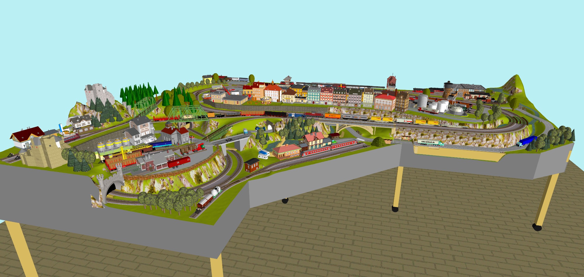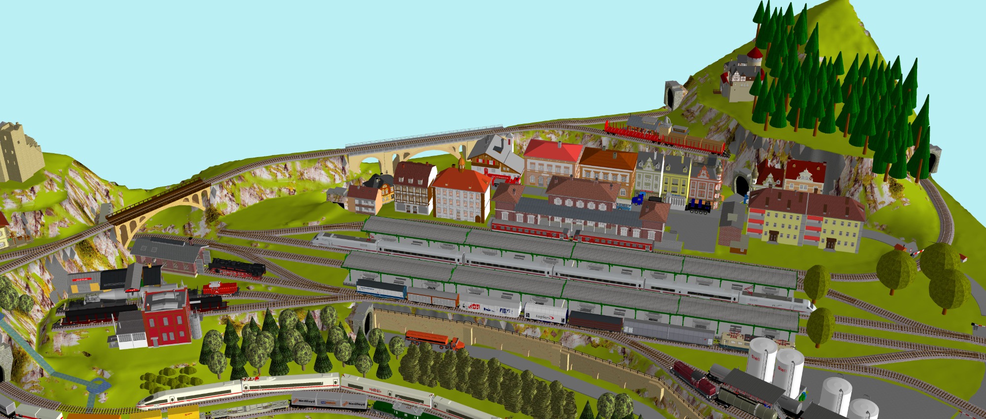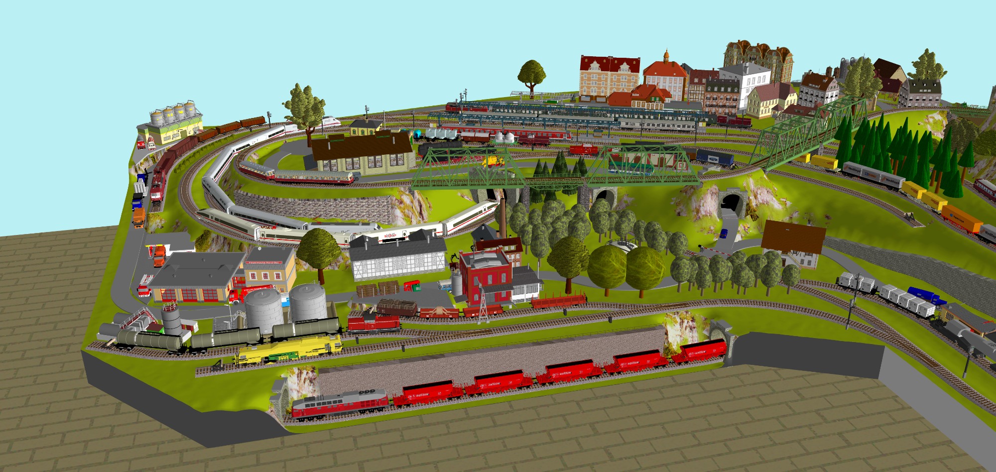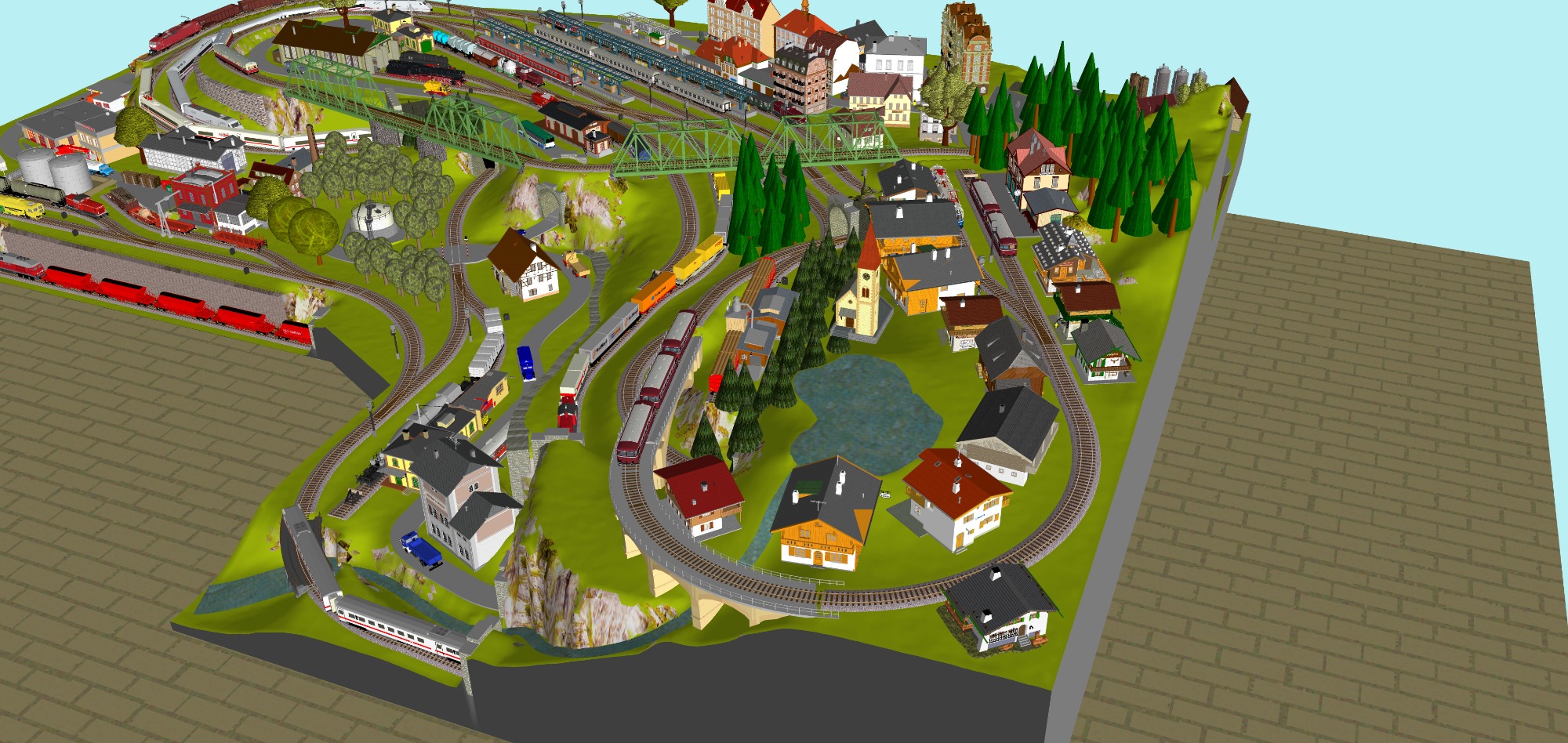 Große Stadt mit 1 Hauptbahnhof (7-gleisig) und 2-gleisiger Hauptstrecke mit langer Paradestrecke, 1-gleisige Nebenstrecke mit 2 Endbahnhöfen (2x 1-gleisig) - 4 Schattenbahnhöfe insgesamt 19-gleisig (1x6-gleisig, 1x 5-gleisig, 2x 4-gleisig), 3 Abstellbahnhöfe 14-gleisig (1x7-gleisig, 1x 4-gleisig, 1x 3-gleisig) - Mittleres Bahnbetriebswerk mit 6-spännigem Ringlokschuppen mit Drehscheibe, sowie 4 Abstellgleise, Wasserturm, Wasserfüllanlage usw. - 1 Abstellgleis mit Güterschuppen, 2 Abstellgleise mit Güterschuppen und Sägemühle, sowie Verladekran, 1 Berg mit Bergsee mit Staumauer, 2. See als Erholungsgebiet mit Burg, Ablauf zum 3. See und zum 4. See über Bachlauf zur Sägemühle - 2. Berg mit großem Alpendorf und Endbahnhof, 3 Bahnübergänge -