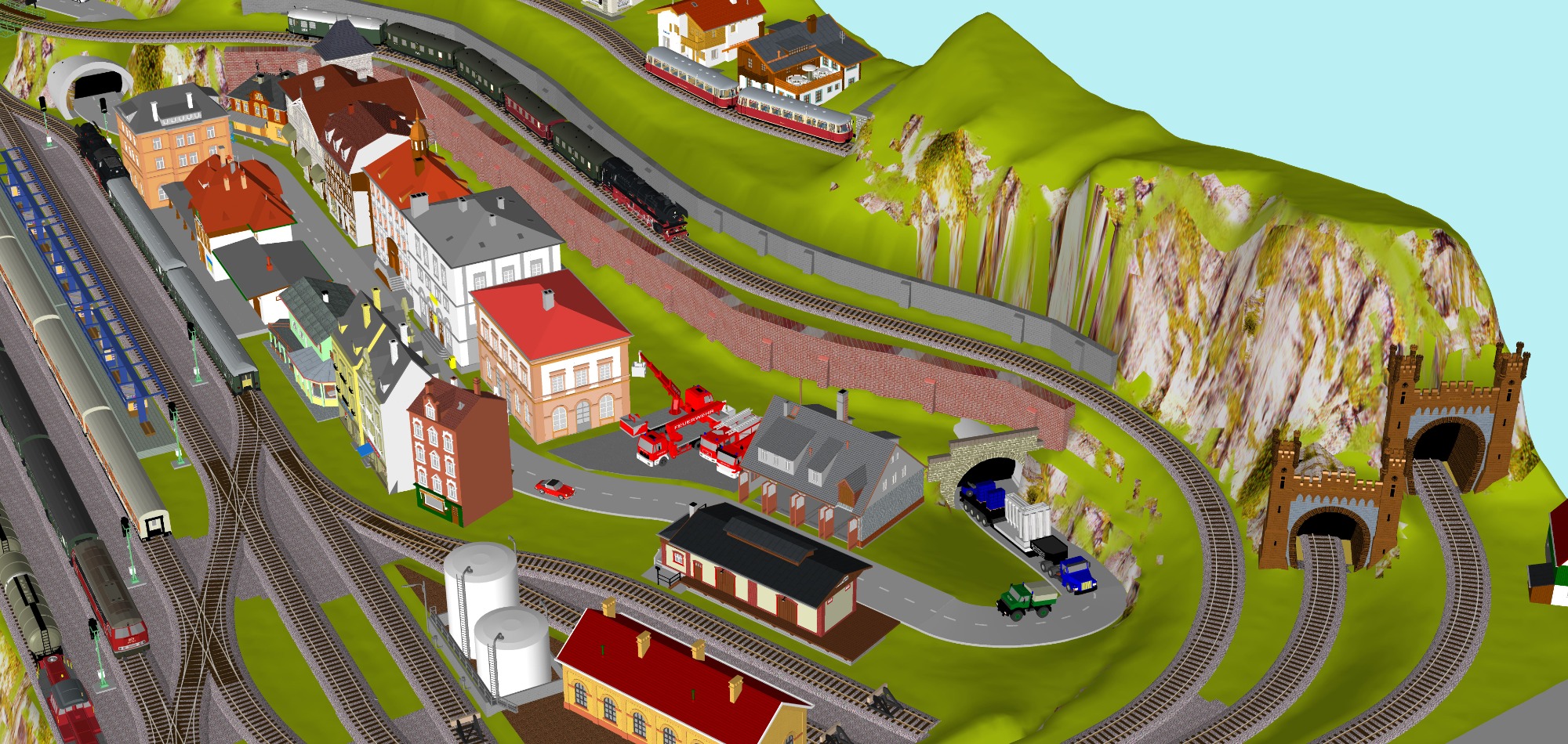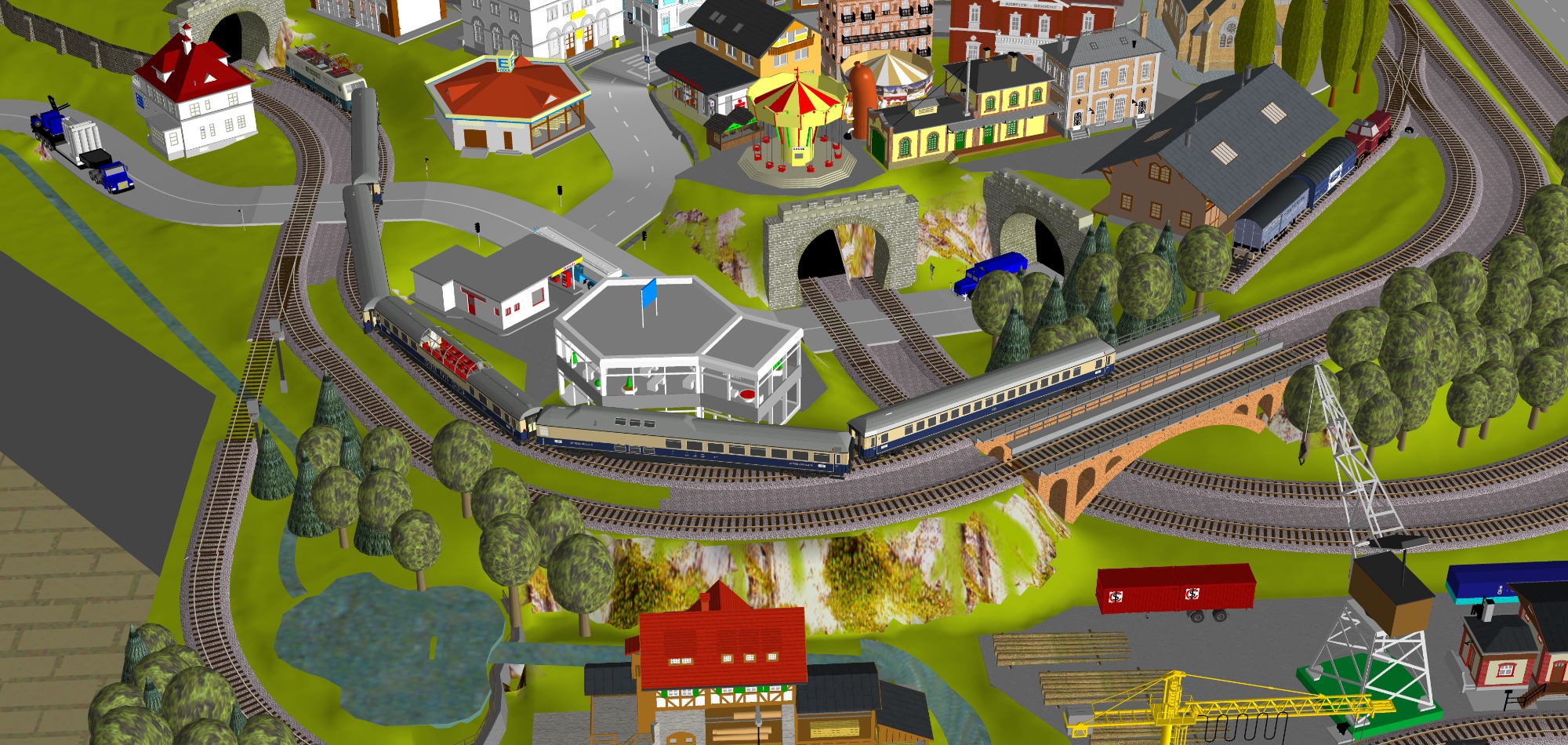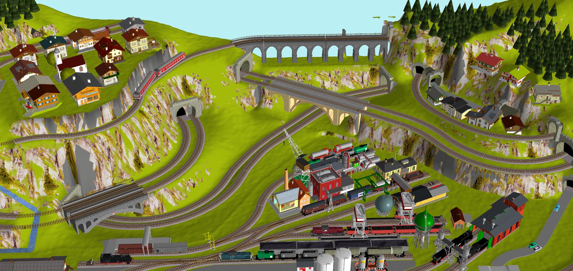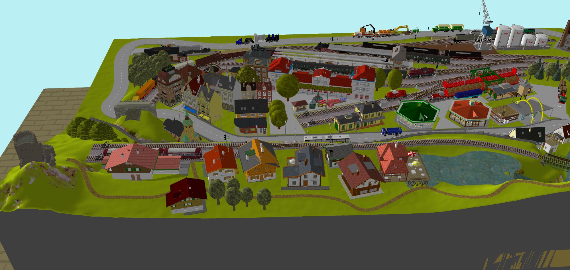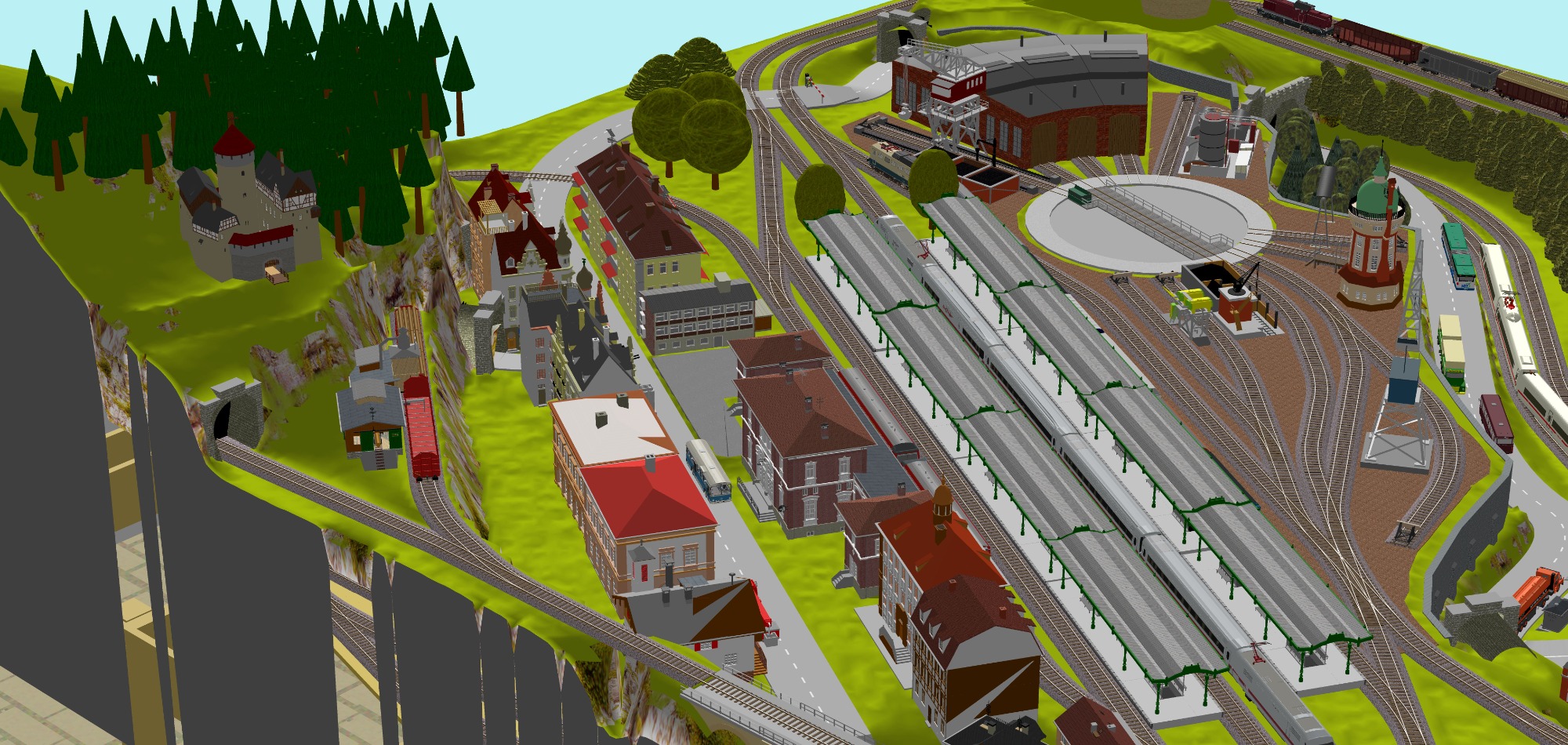 Große Stadt mit 1 Hauptbahnhof (7-gleisig) und 2-gleisiger Hauptstrecke mit langer Paradestrecke, 1-gleisige Nebenstrecke mit 2 Endbahnhöfen (2x 1-gleisig) - 4 Schattenbahnhöfe insgesamt 19-gleisig (1x6-gleisig, 1x 5-gleisig, 2x 4-gleisig), 3 Abstellbahnhöfe 14-gleisig (1x7-gleisig, 1x 4-gleisig, 1x 3-gleisig) - Mittleres Bahnbetriebswerk mit 6-spännigem Ringlokschuppen mit Drehscheibe, sowie 4 Abstellgleise, Wasserturm, Wasserfüllanlage usw. - 1 Abstellgleis mit Güterschuppen, 2 Abstellgleise mit Güterschuppen und Sägemühle, sowie Verladekran, 1 Berg mit Bergsee mit Staumauer, 2. See als Erholungsgebiet mit Burg, Ablauf zum 3. See und zum 4. See über Bachlauf zur Sägemühle - 2. Berg mit großem Alpendorf und Endbahnhof, 3 Bahnübergänge -