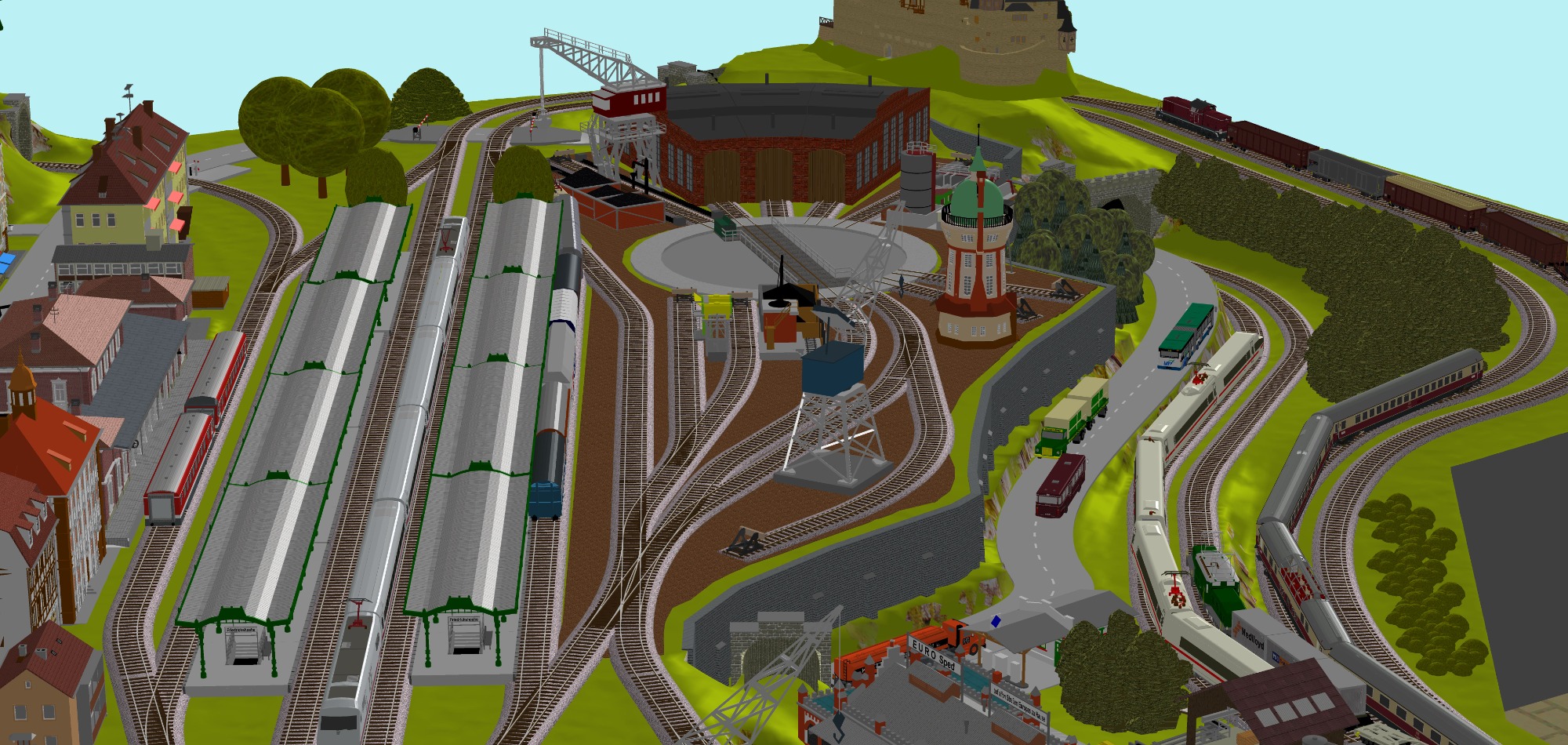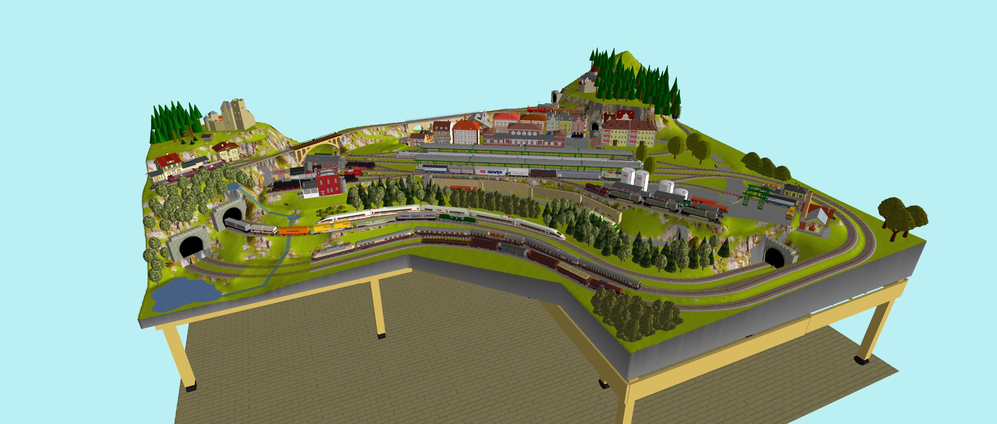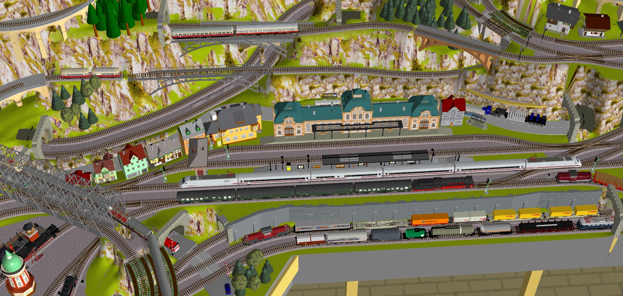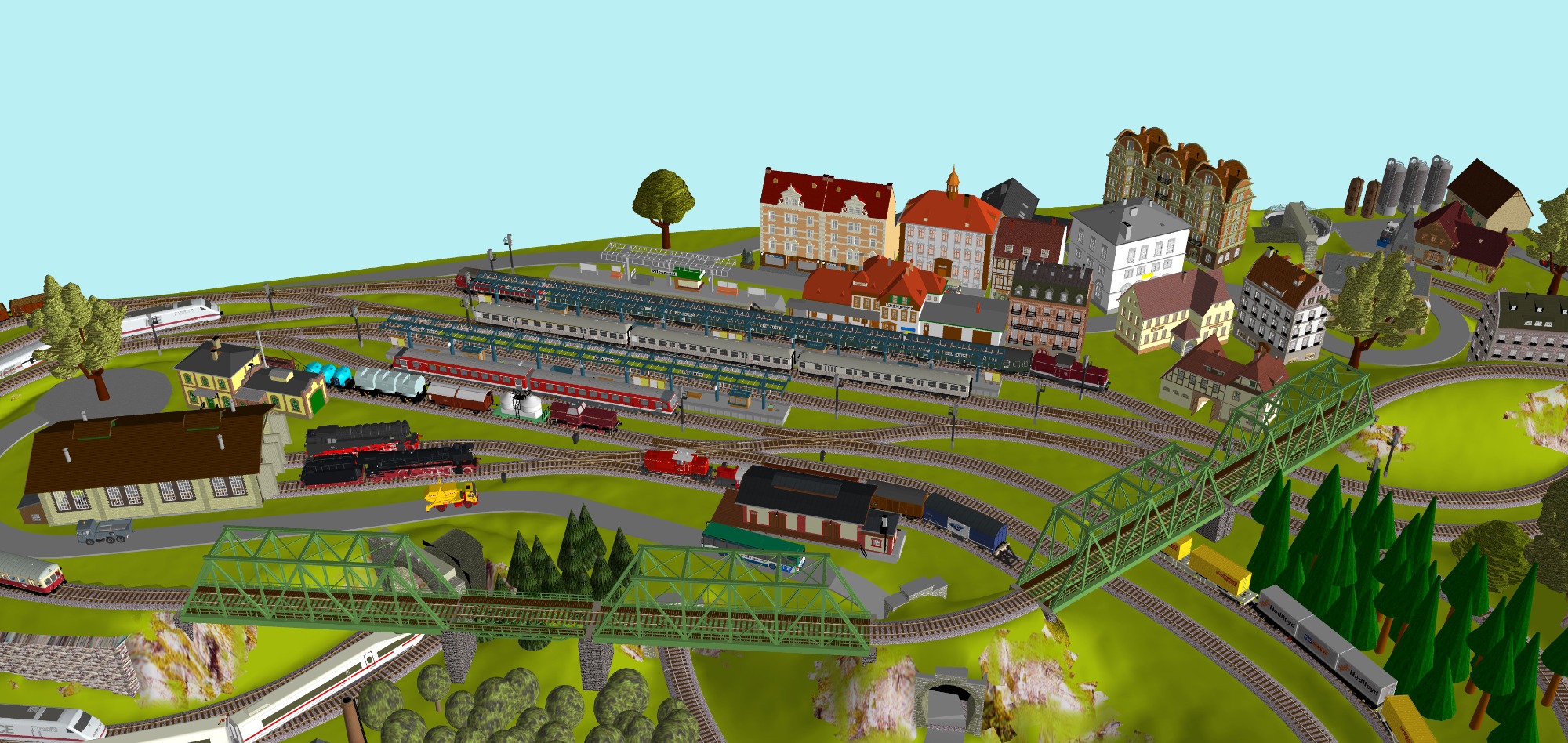 Große Stadt mit 1 Hauptbahnhof (7-gleisig) und 2-gleisiger Hauptstrecke mit langer Paradestrecke, 1-gleisige Nebenstrecke mit 2 Endbahnhöfen (2x 1-gleisig) - 4 Schattenbahnhöfe insgesamt 19-gleisig (1x6-gleisig, 1x 5-gleisig, 2x 4-gleisig), 3 Abstellbahnhöfe 14-gleisig (1x7-gleisig, 1x 4-gleisig, 1x 3-gleisig) - Mittleres Bahnbetriebswerk mit 6-spännigem Ringlokschuppen mit Drehscheibe, sowie 4 Abstellgleise, Wasserturm, Wasserfüllanlage usw. - 1 Abstellgleis mit Güterschuppen, 2 Abstellgleise mit Güterschuppen und Sägemühle, sowie Verladekran, 1 Berg mit Bergsee mit Staumauer, 2. See als Erholungsgebiet mit Burg, Ablauf zum 3. See und zum 4. See über Bachlauf zur Sägemühle - 2. Berg mit großem Alpendorf und Endbahnhof, 3 Bahnübergänge -