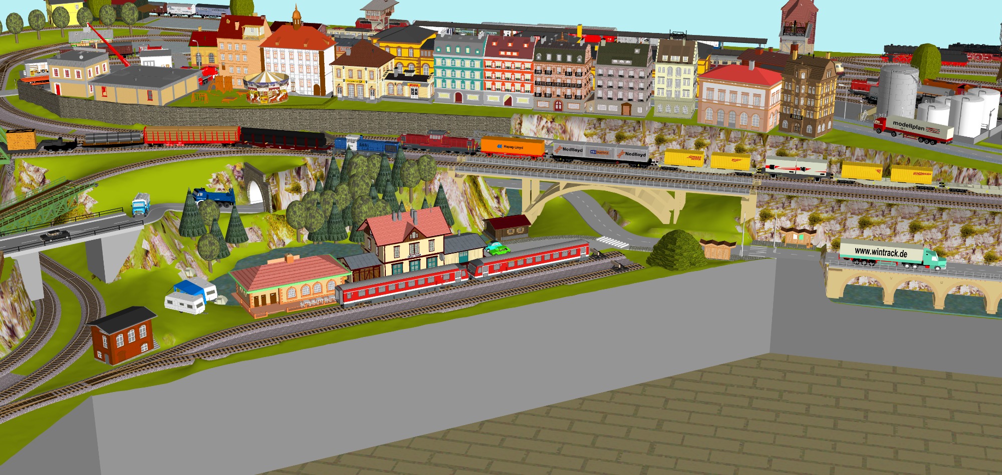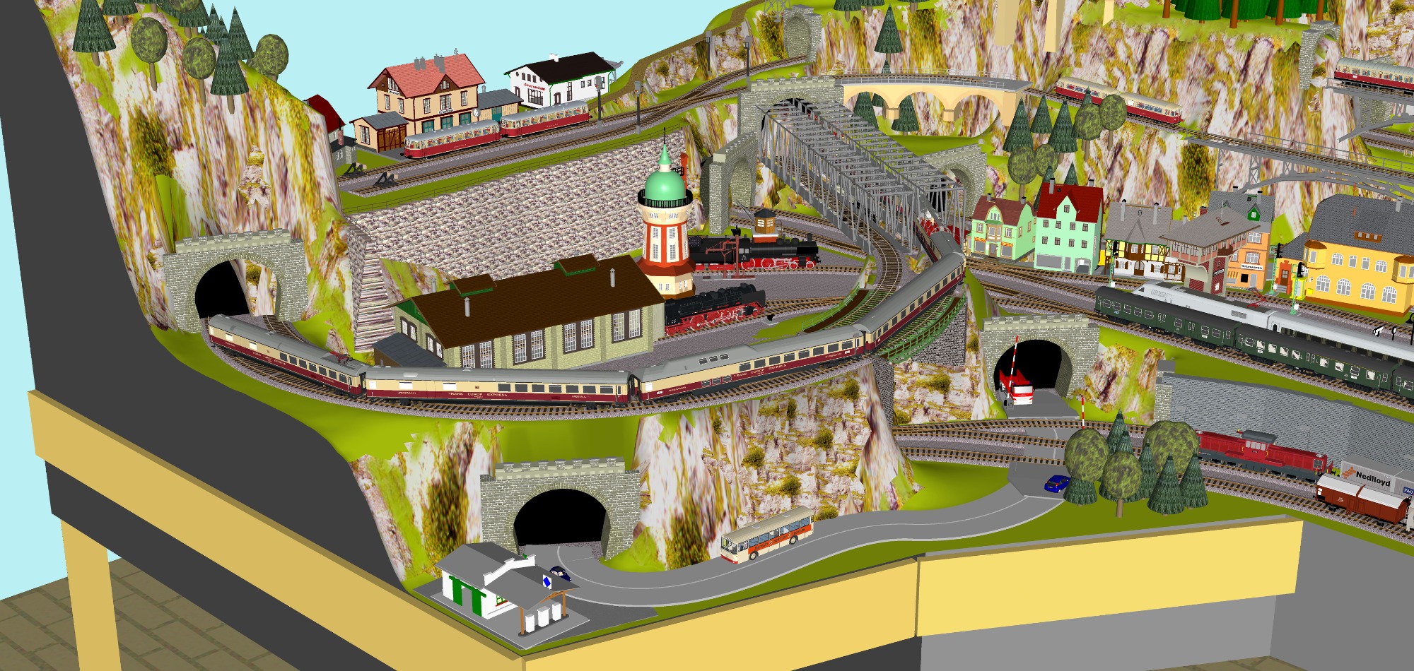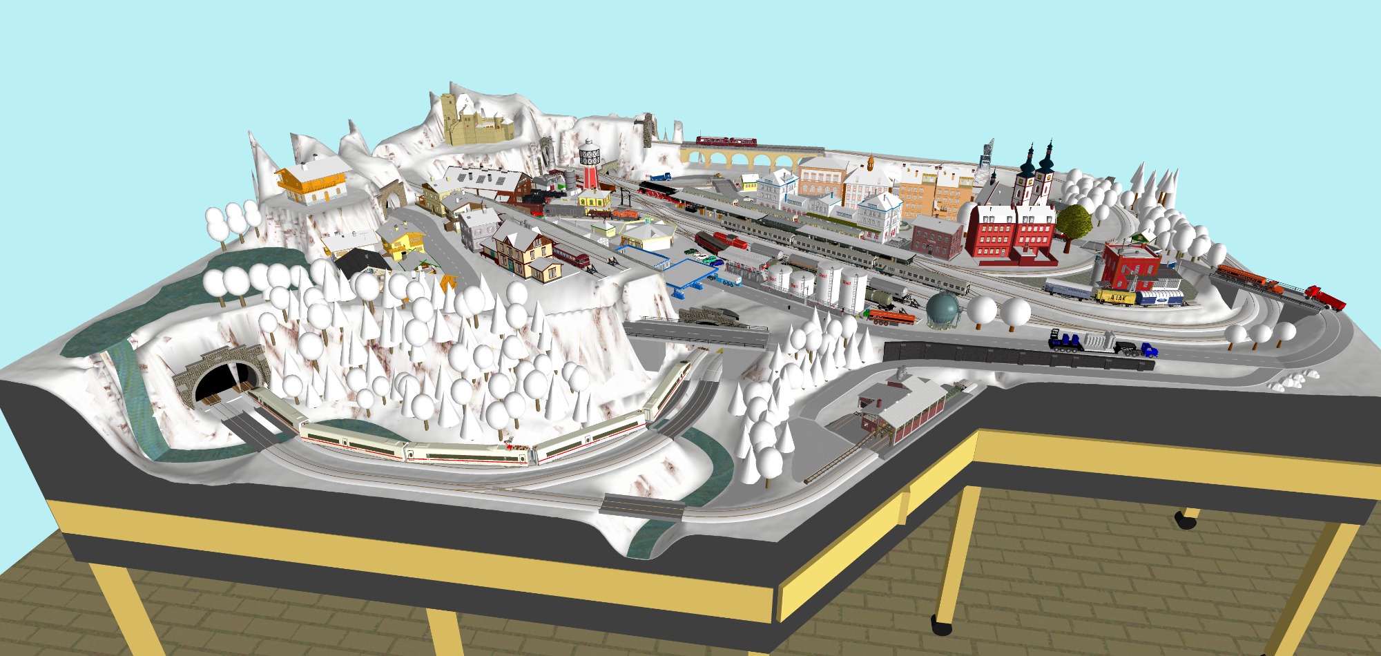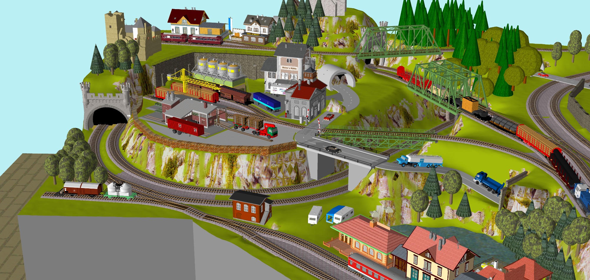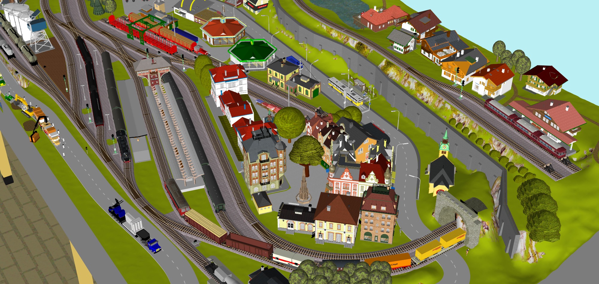 Große Stadt mit 1 Hauptbahnhof (7-gleisig) und 2-gleisiger Hauptstrecke mit langer Paradestrecke, 1-gleisige Nebenstrecke mit 2 Endbahnhöfen (2x 1-gleisig) - 4 Schattenbahnhöfe insgesamt 19-gleisig (1x6-gleisig, 1x 5-gleisig, 2x 4-gleisig), 3 Abstellbahnhöfe 14-gleisig (1x7-gleisig, 1x 4-gleisig, 1x 3-gleisig) - Mittleres Bahnbetriebswerk mit 6-spännigem Ringlokschuppen mit Drehscheibe, sowie 4 Abstellgleise, Wasserturm, Wasserfüllanlage usw. - 1 Abstellgleis mit Güterschuppen, 2 Abstellgleise mit Güterschuppen und Sägemühle, sowie Verladekran, 1 Berg mit Bergsee mit Staumauer, 2. See als Erholungsgebiet mit Burg, Ablauf zum 3. See und zum 4. See über Bachlauf zur Sägemühle - 2. Berg mit großem Alpendorf und Endbahnhof, 3 Bahnübergänge -
