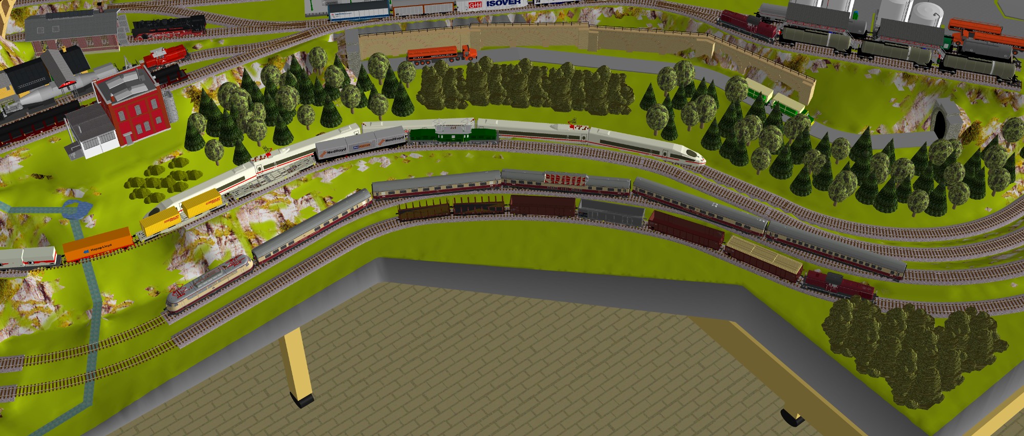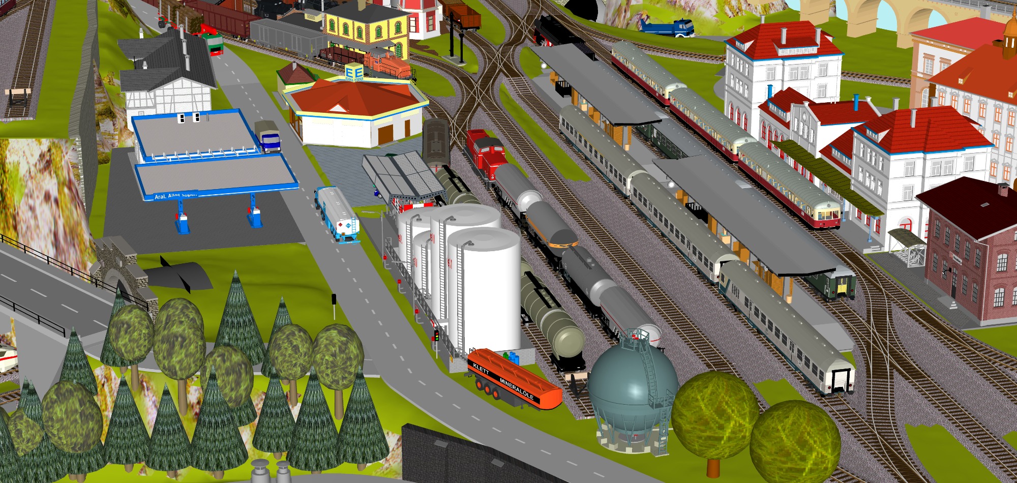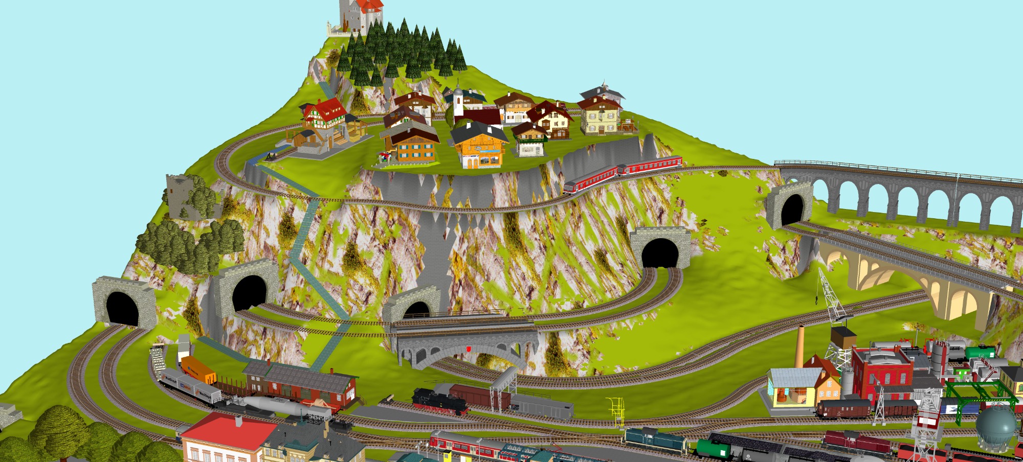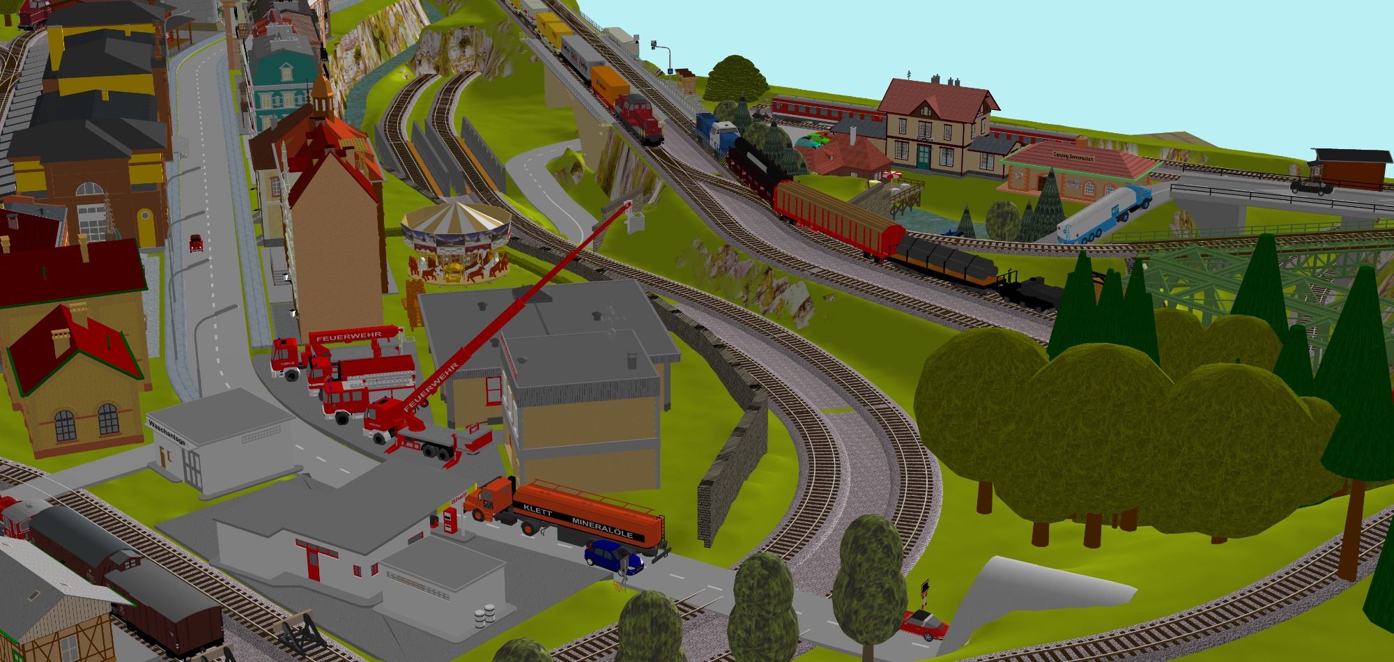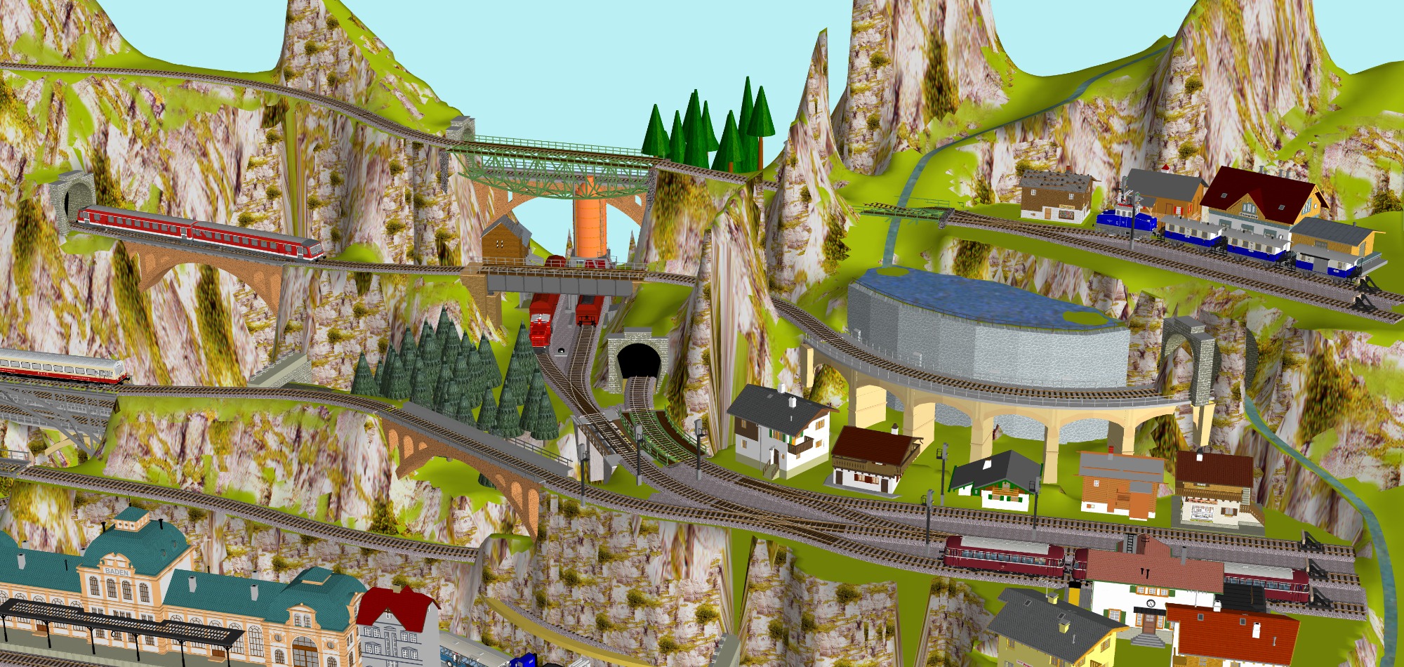 Große Stadt mit 1 Hauptbahnhof (7-gleisig) und 2-gleisiger Hauptstrecke mit langer Paradestrecke, 1-gleisige Nebenstrecke mit 2 Endbahnhöfen (2x 1-gleisig) - 4 Schattenbahnhöfe insgesamt 19-gleisig (1x6-gleisig, 1x 5-gleisig, 2x 4-gleisig), 3 Abstellbahnhöfe 14-gleisig (1x7-gleisig, 1x 4-gleisig, 1x 3-gleisig) - Mittleres Bahnbetriebswerk mit 6-spännigem Ringlokschuppen mit Drehscheibe, sowie 4 Abstellgleise, Wasserturm, Wasserfüllanlage usw. - 1 Abstellgleis mit Güterschuppen, 2 Abstellgleise mit Güterschuppen und Sägemühle, sowie Verladekran, 1 Berg mit Bergsee mit Staumauer, 2. See als Erholungsgebiet mit Burg, Ablauf zum 3. See und zum 4. See über Bachlauf zur Sägemühle - 2. Berg mit großem Alpendorf und Endbahnhof, 3 Bahnübergänge -