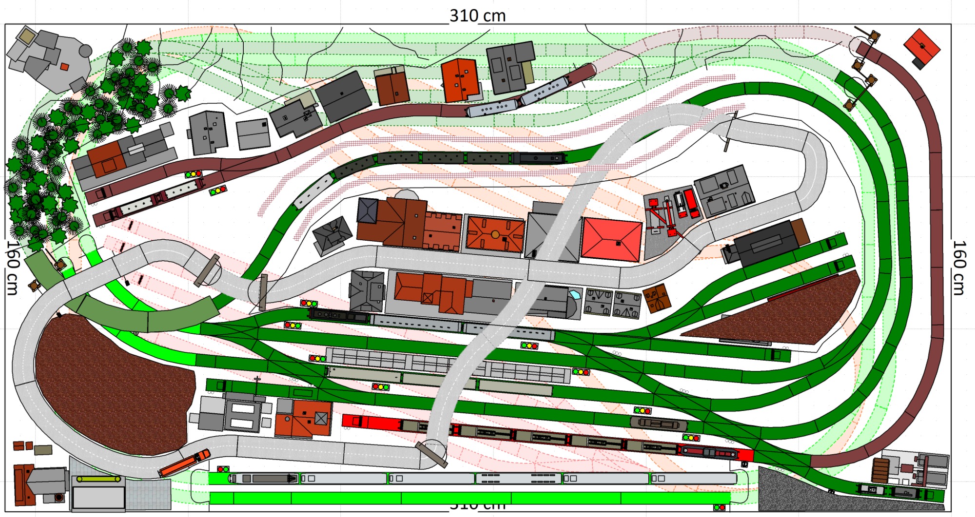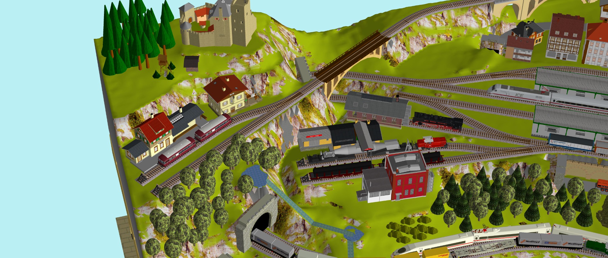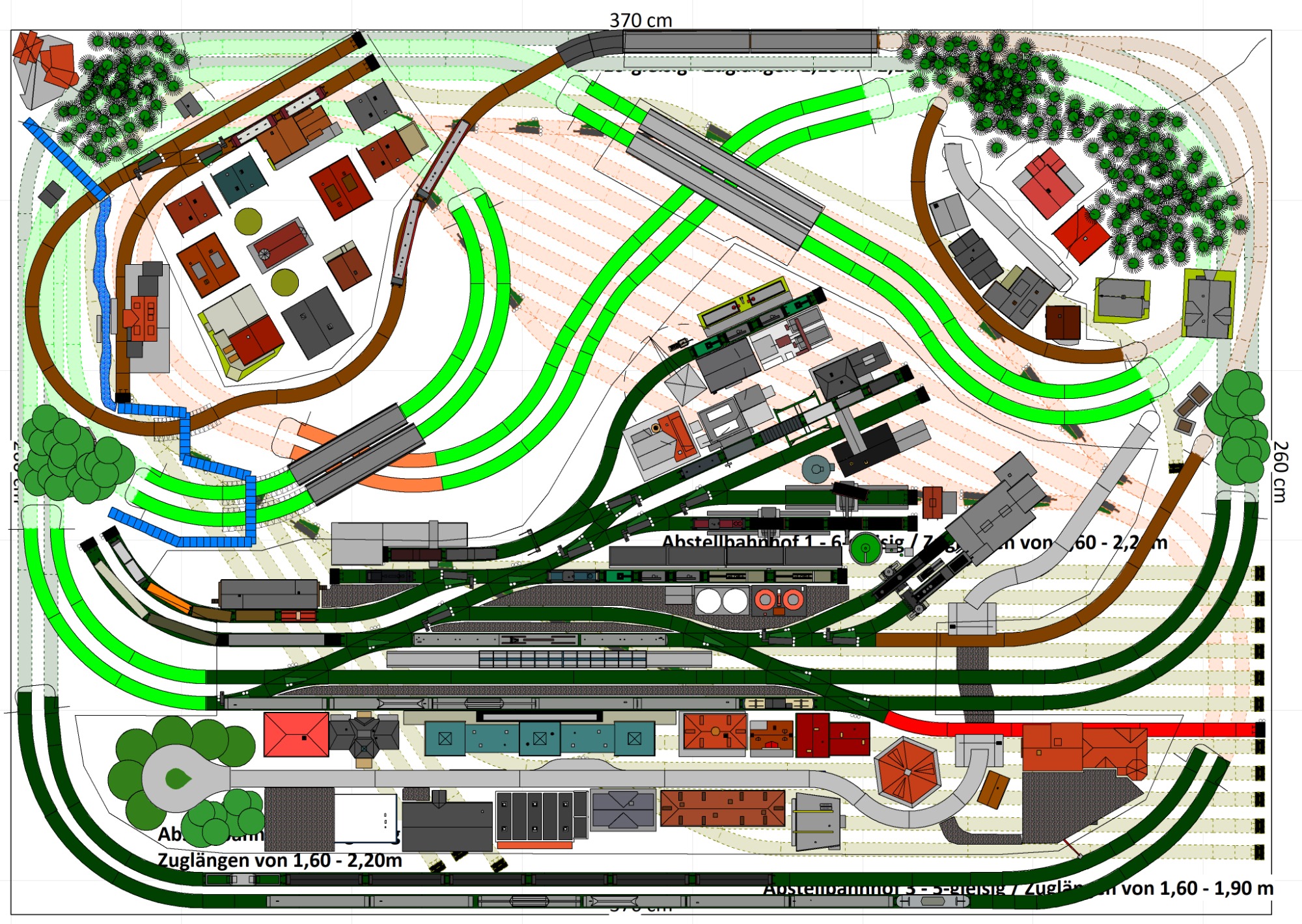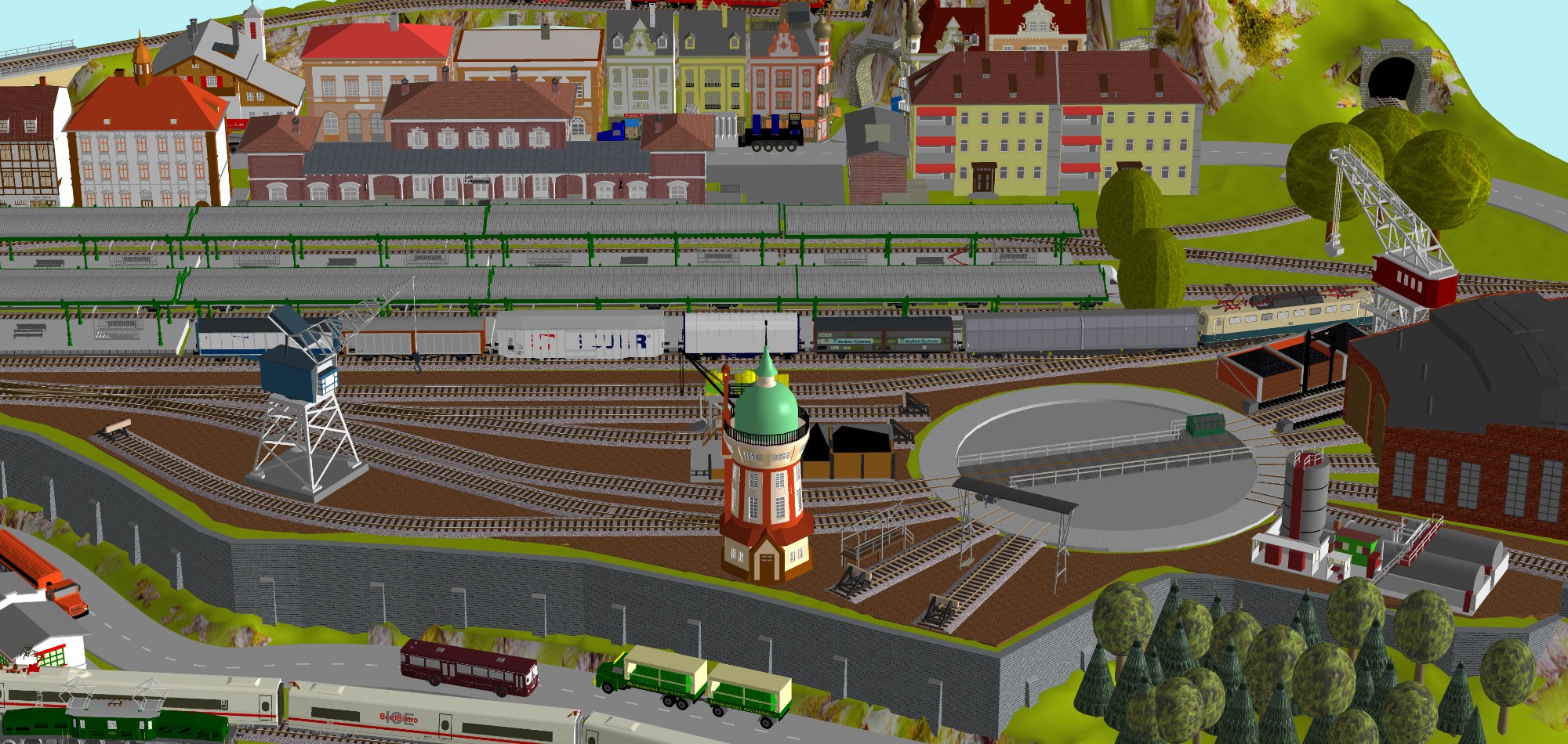 Große Stadt mit 1 Hauptbahnhof (7-gleisig) und 2-gleisiger Hauptstrecke mit langer Paradestrecke, 1-gleisige Nebenstrecke mit 2 Endbahnhöfen (2x 1-gleisig) - 4 Schattenbahnhöfe insgesamt 19-gleisig (1x6-gleisig, 1x 5-gleisig, 2x 4-gleisig), 3 Abstellbahnhöfe 14-gleisig (1x7-gleisig, 1x 4-gleisig, 1x 3-gleisig) - Mittleres Bahnbetriebswerk mit 6-spännigem Ringlokschuppen mit Drehscheibe, sowie 4 Abstellgleise, Wasserturm, Wasserfüllanlage usw. - 1 Abstellgleis mit Güterschuppen, 2 Abstellgleise mit Güterschuppen und Sägemühle, sowie Verladekran, 1 Berg mit Bergsee mit Staumauer, 2. See als Erholungsgebiet mit Burg, Ablauf zum 3. See und zum 4. See über Bachlauf zur Sägemühle - 2. Berg mit großem Alpendorf und Endbahnhof, 3 Bahnübergänge -