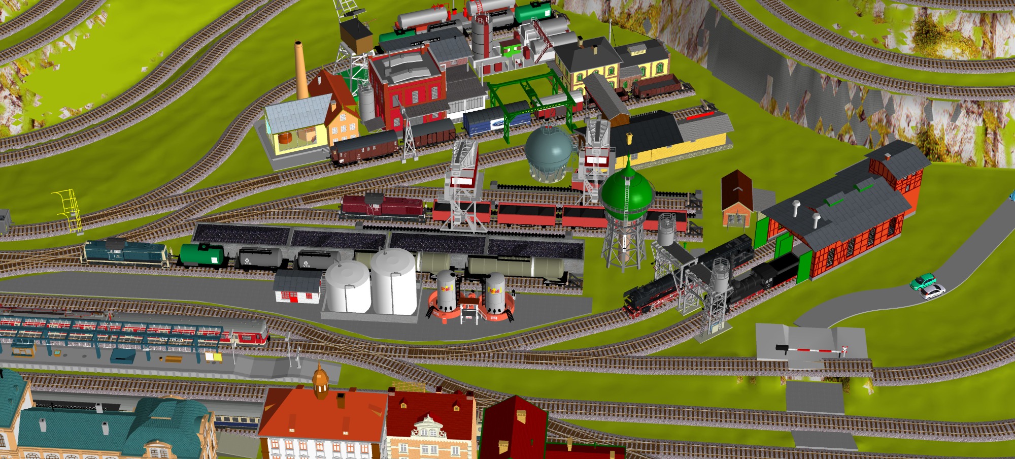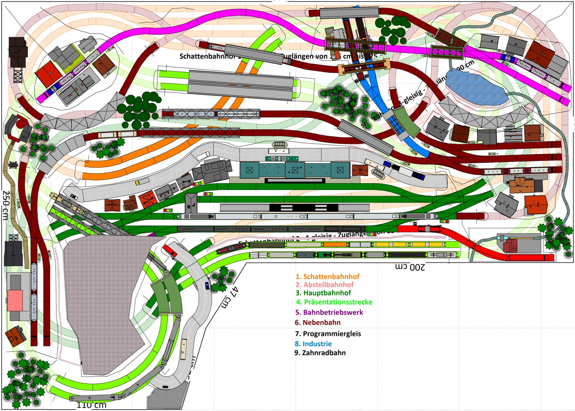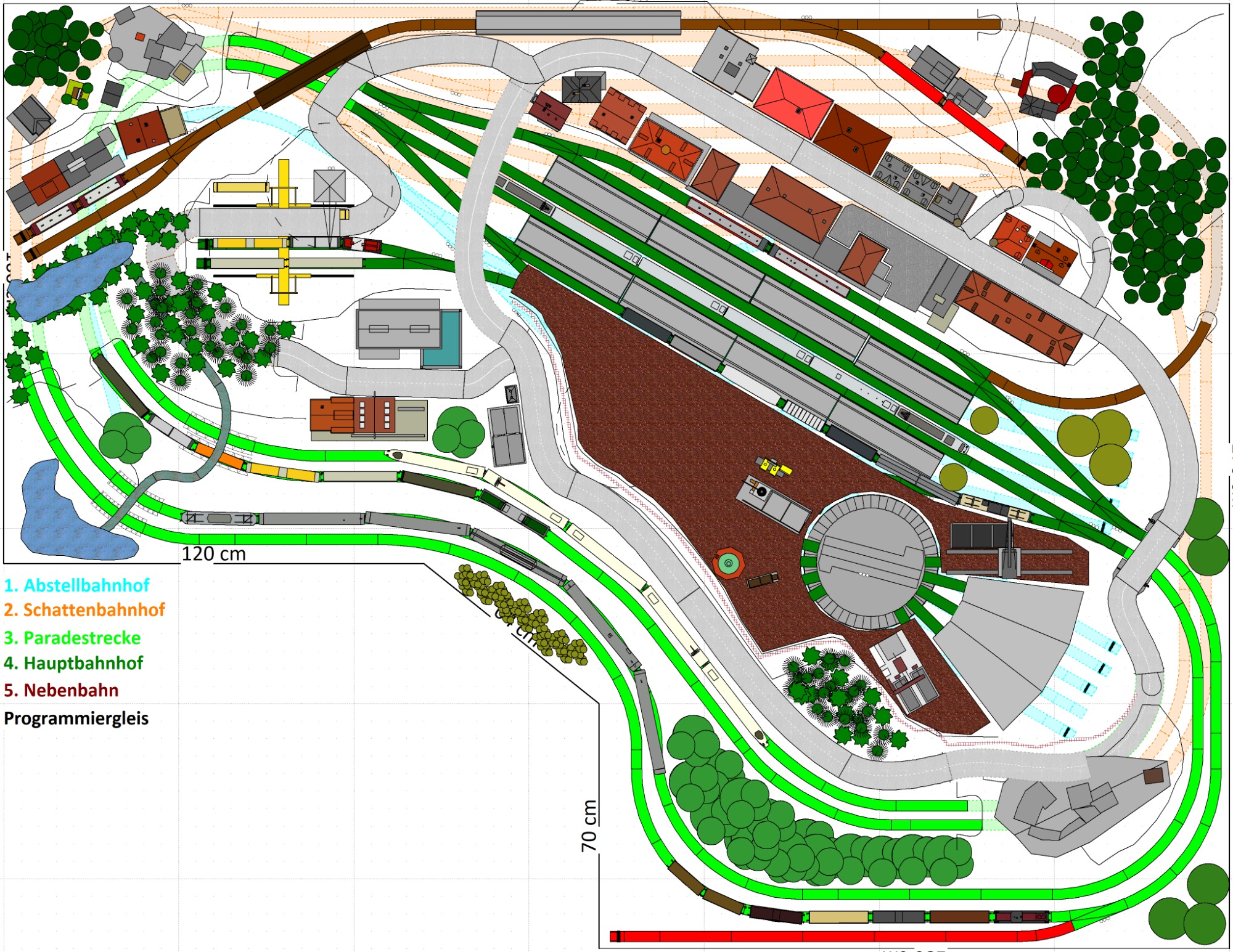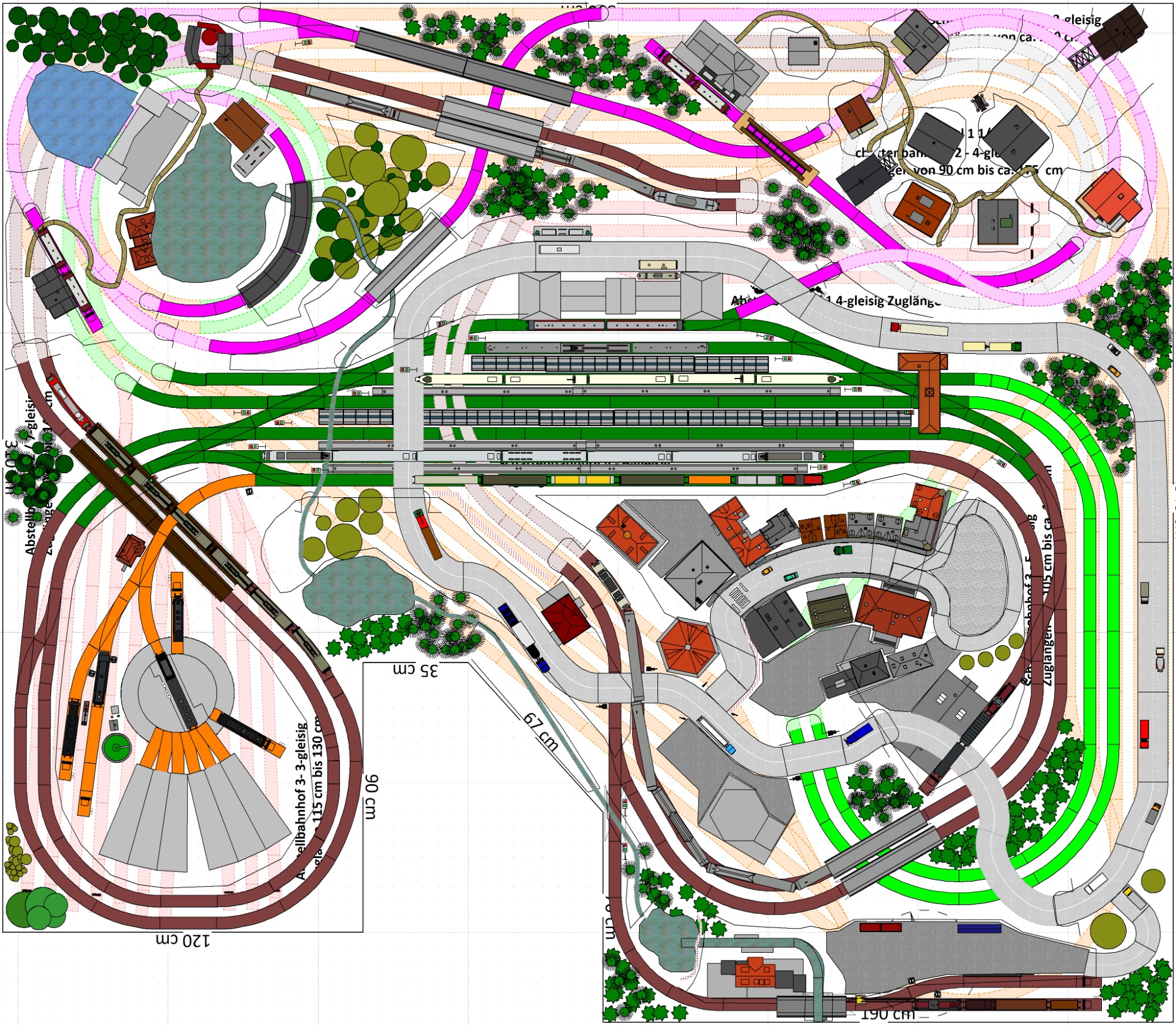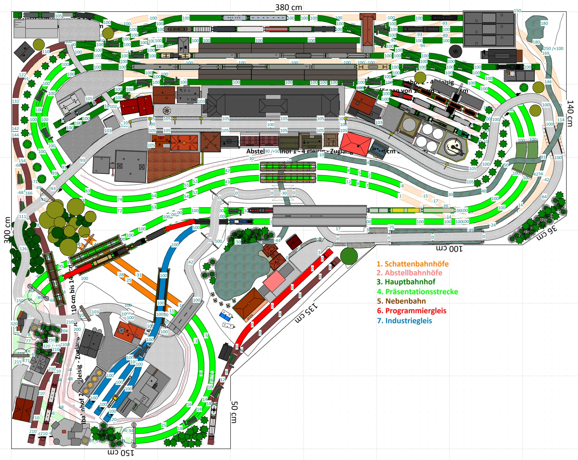 Große Stadt mit 1 Hauptbahnhof (7-gleisig) und 2-gleisiger Hauptstrecke mit langer Paradestrecke, 1-gleisige Nebenstrecke mit 2 Endbahnhöfen (2x 1-gleisig) - 4 Schattenbahnhöfe insgesamt 19-gleisig (1x6-gleisig, 1x 5-gleisig, 2x 4-gleisig), 3 Abstellbahnhöfe 14-gleisig (1x7-gleisig, 1x 4-gleisig, 1x 3-gleisig) - Mittleres Bahnbetriebswerk mit 6-spännigem Ringlokschuppen mit Drehscheibe, sowie 4 Abstellgleise, Wasserturm, Wasserfüllanlage usw. - 1 Abstellgleis mit Güterschuppen, 2 Abstellgleise mit Güterschuppen und Sägemühle, sowie Verladekran, 1 Berg mit Bergsee mit Staumauer, 2. See als Erholungsgebiet mit Burg, Ablauf zum 3. See und zum 4. See über Bachlauf zur Sägemühle - 2. Berg mit großem Alpendorf und Endbahnhof, 3 Bahnübergänge -