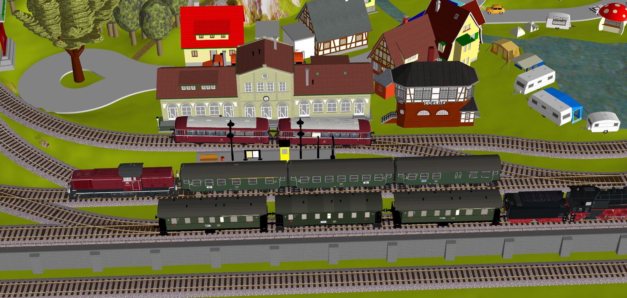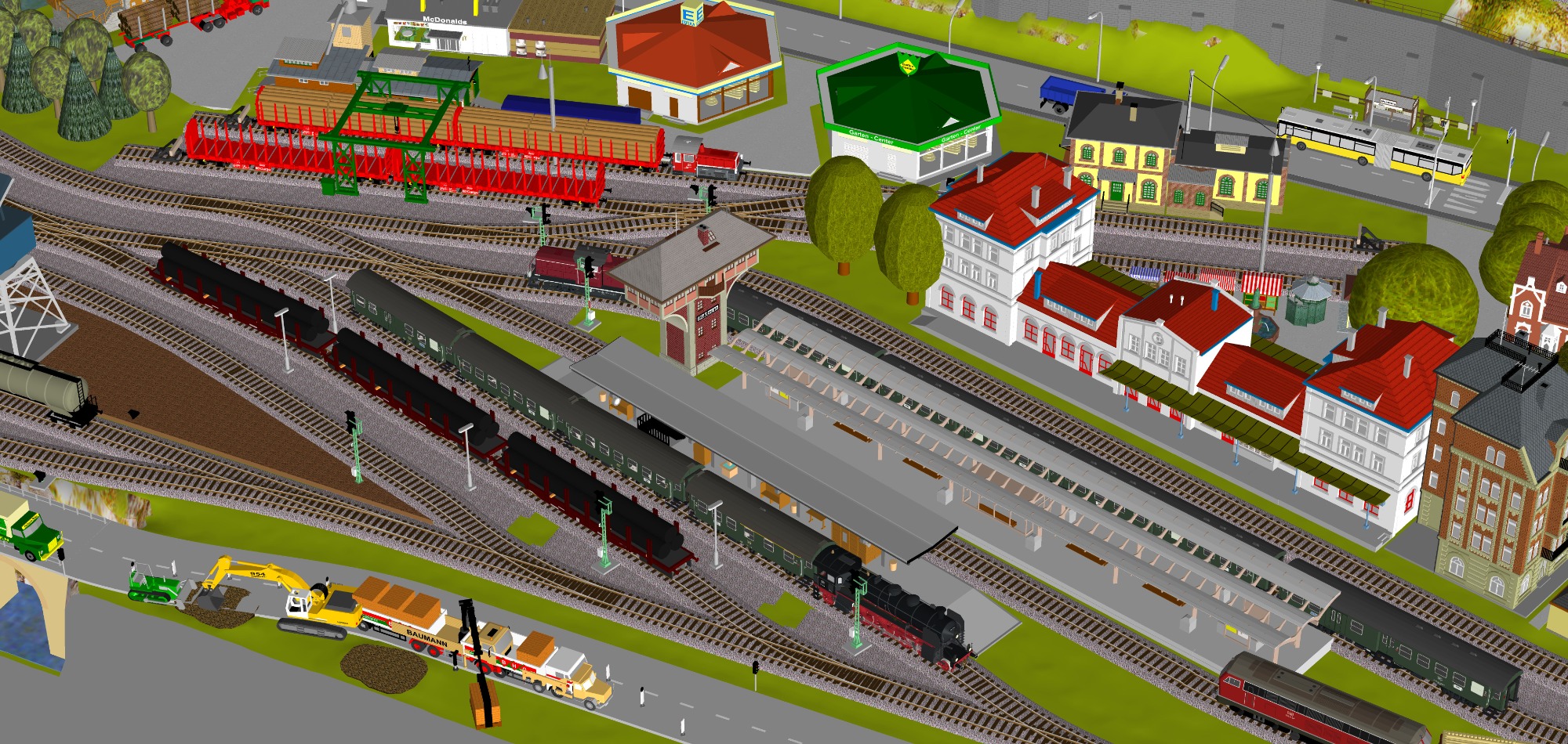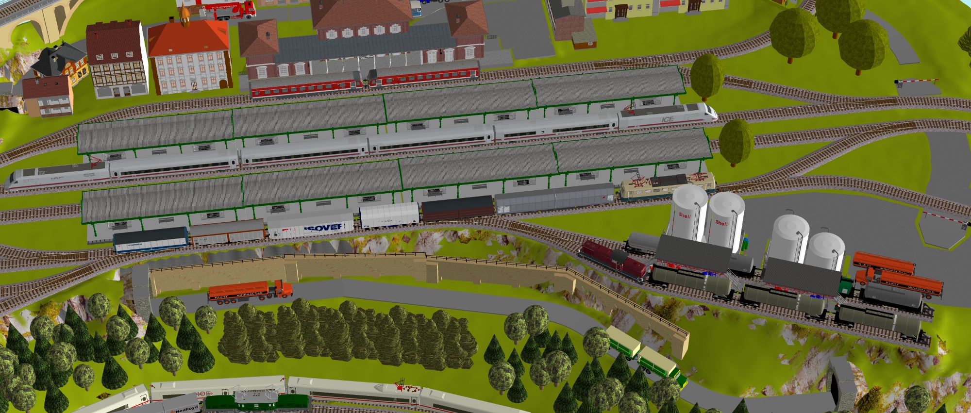 Kleinstadt-Idylle mit 1 Bahnhof (1x 5-gleisig) mit 2-gleisiger Hauptstrecke, 1 gleisige Nebenstrecke mit Endbahnhof (2-gleisig), geeignet für Pendelverkehr - 2 Schattenbahnhöfe insgesamt 8-gleisig (2x 4-gleisig), 1 Abstellbahnhof 5-gleisig - Kleines Bahnbetriebswerk mit 2 spännigem Lokschuppen,
