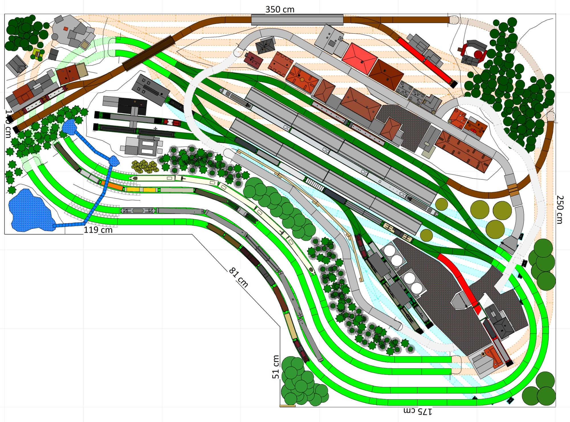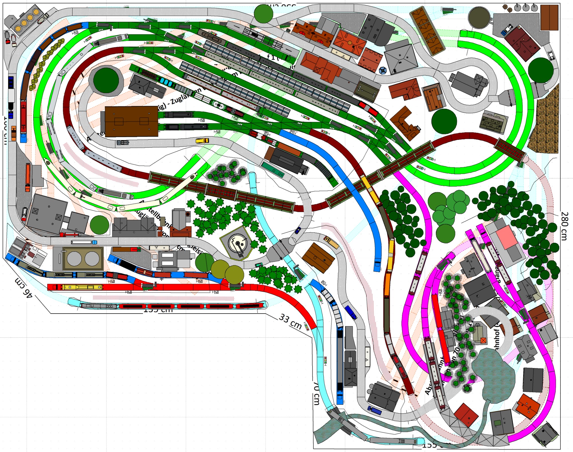 Mittlere Stadt mit 1 Hauptbahnhof (4-gleisig) und 2 -gleisiger Hauptstrecke , 1 gleisige Nebenstrecke mit Zwischenbahnhof (1-gleisig) und Endbahnhof 2-gleisig) - 2 Schattenbahnhöfe insgesamt 10-gleisig (2x 5-gleisig), 3 Abstellbahnhöfe insgesamt 14-gleisig (1x6-, 1x5- und 1x3-gleisig) - Mittleres Bahnbetriebswerk mit 2-gleisigem Lokschuppen, Kohleverladung, Wasserturm, usw. x Abstellgleis mit 2-gleisigem Fahrleitungsmeisterei - 1 Abstellgleis mit Sägemühle auf der Nebenbahn, 1x Abstellgleis mit Tanklager, 2 Abstellgleise mit Güterschuppen, 2x Abstellgleise für Maschinenbau, Brauerei und Maschinenfabrik - 1 großes ländliches Alpendorf, Berg mit Burg, 1 Bahnübergang. Anlage für Car-System geeignet, mit 2 Wendekreisen (2-spurige Straßen)
