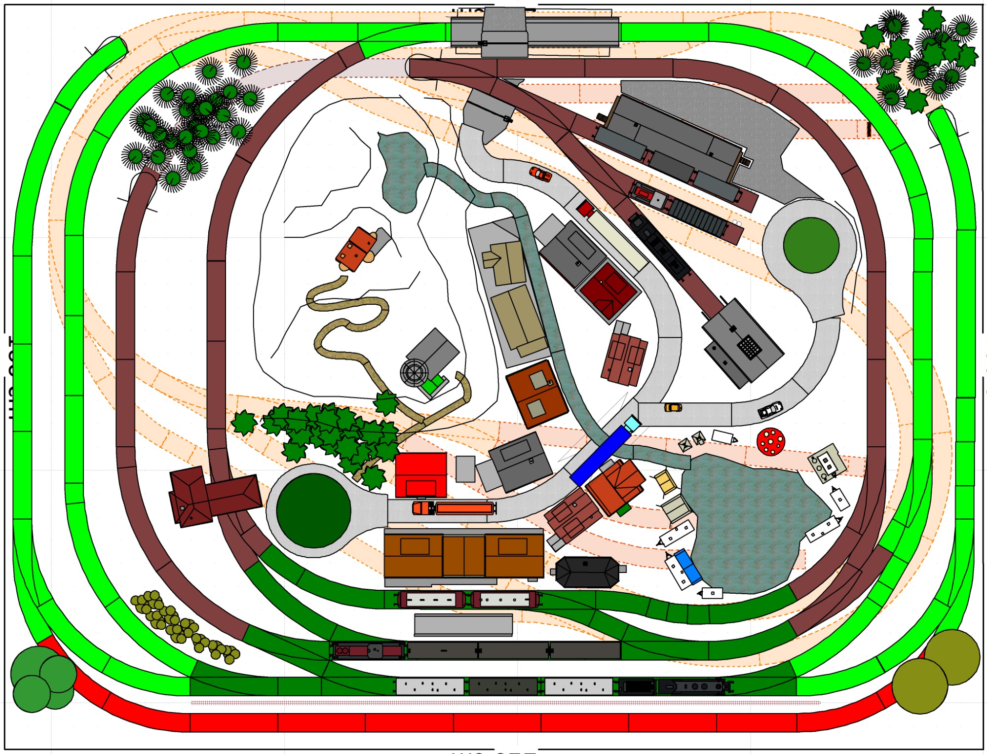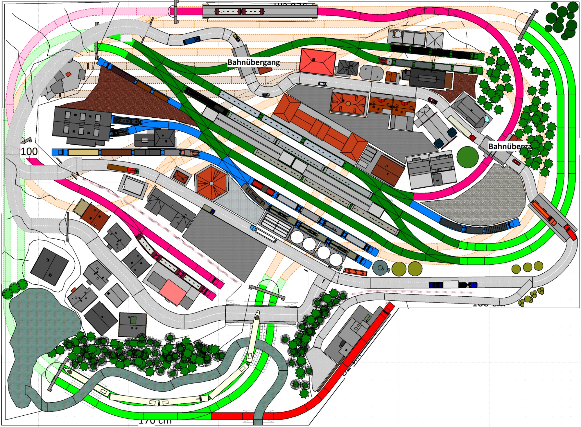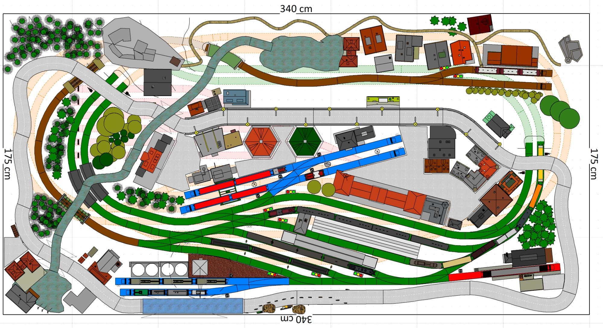 Kleinstadt mit 1 Hauptbahnhof (1x 6-gleisig) mit 2-gleisiger Hauptstrecke und langer Paradestrecke, 1 gleisige Nebenstrecke mit Endbahnhof(2-gleisig) und Dorf, über Hauptstrecke mit Endbahnhof 2-gleisig, 1 Abstellgleis als Programmiergleis, sowie 1 Abstellgleis für Güterschuppen - 2 Schattenbahnhöfe insgesamt 8-gleisig (2x 4-gleisig), 2 Abstellbahnhöfe 8-gleisig (2x 4-gleisig) - 2x Abstellgleise mit Güterschuppen, 1x Abstellgleis mit Güterschuppen und Wasserturm, 2 Abstellgleise mit Sägewerk und Kran, 1 große Stadt mit Kirmes, großer Feuerwache - Berg mit Burg, weiterer Berg mit Bergsee mit Bachlauf und Fluss, 3 bahnübergänge - Anlage für Car-System geeignet - Straßen als Rundkurs 2 spurig, mit 2 T-Kreuzungen, Tankstelle und 2 Bushaltestellen