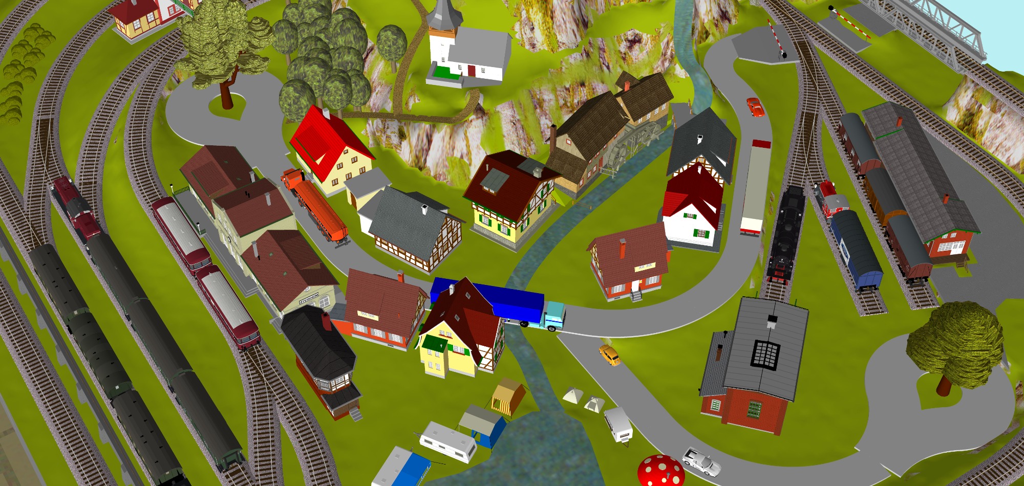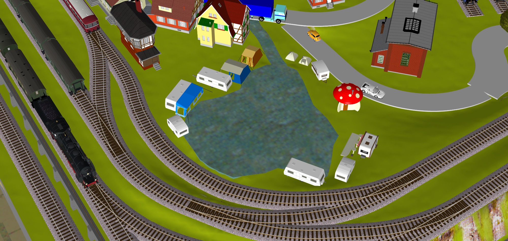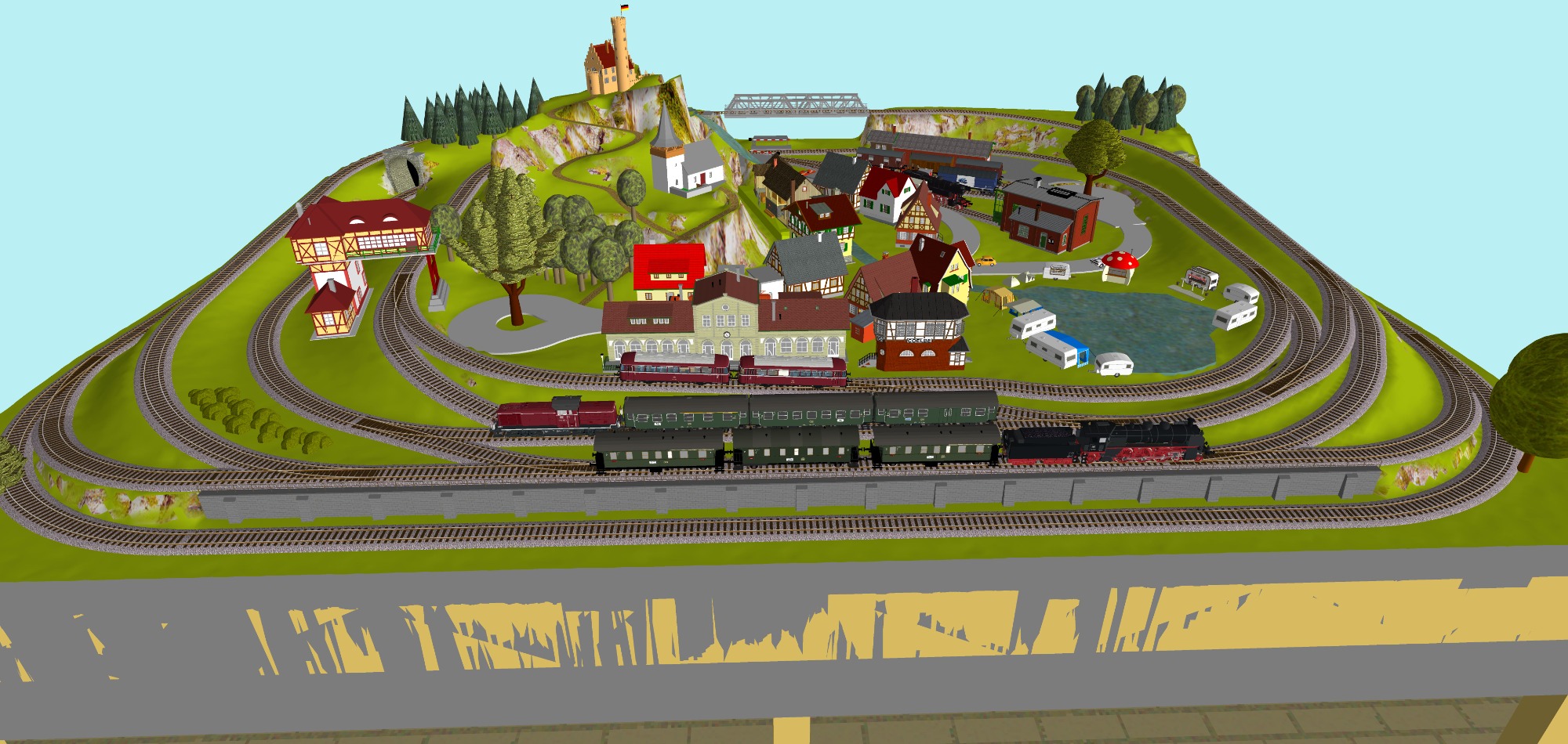 Gemütliches idyllisches Dorfleben mit 1 Bahnhof (3-gleisig) mit 2-gleisiger Hauptstrecke - 1 Schattenbahnhof 5-gleisig, 1 Abstellbahnhof (5-gleisig) - 2 x Abstellgleis mit Güterschuppen, 1 Abstellgleis mit 1-gleisigem Lokschuppen - 1x Berg mit Burg und Kirche auf Anhöhe, 1 großes ländliches Dorf mit See als Erholungsgebiet und Campingplatz, 1 Bahnübergang, Anlage für Car-System geeignet mit 2 Wendekreisen (2-spurige Straßen)