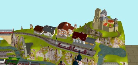 Hinterer rechter Anlagenteil mit Zwischenbahnhof der Nebenstrecke und Burg mit Berg