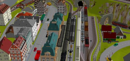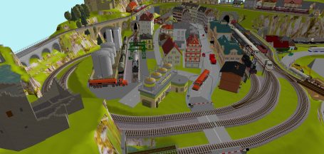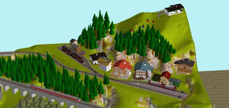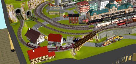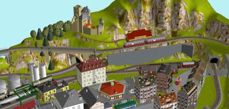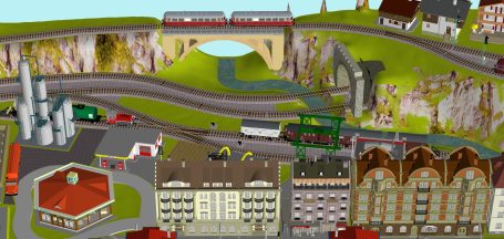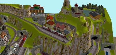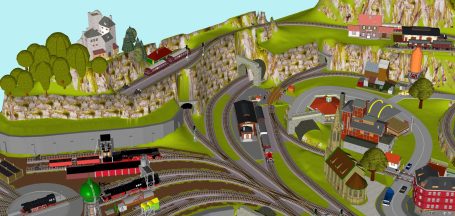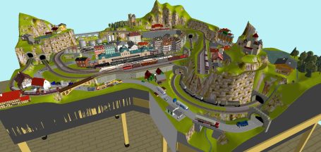 Mittelgebirge / Hochgebirge mit mittlerem Industriegebiet, Erholung am Fluss, 1 Hauptbahnhof 4-gleisig mit 2-gleisiger Hauptstrecke mit 1-gleisiger Nebenstrecke ins Mittelgebirge mit 1 Durchgangsbahnhof 1-gleisig sowie zwei Endbahnhöfen 2-gleisig. Eine Hochgebirgsbahn mit 2 Endbahnhöfen 2-gleisig und einem Durchgangsbahnhof mit Abstellgleis. Die Anlage besitzt 2 Schattenbahnhöfe mit insgesamt 9-Gleisen und 3 Abstellbahnhöfe mit 21 Gleisen. insgesamt 7 Brücken sind auf der Anlage verbaut. Car-System mit 4 Bahnübergänge, Straßen 2-spurig mit insgesamt 3 Wendekreisen und 3 Abzweigen, davon 2 Abzweige als Einbahnstraße, Baustelle mit Ampelverkehr