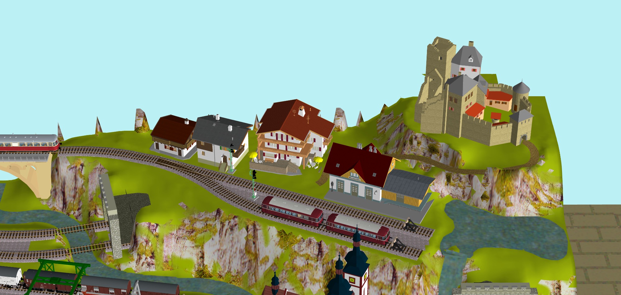 Kleinstadt mit 1 Bahnhof (1x 4-gleisig) und 2-gleisige Hauptstrecke mit Paradestrecke, 1 gleisige Nebenstrecke mit Endbahnhof (2-gleisig) und Gebirgsdorf - 1 Schattenbahnhof (4-gleisig) - 2 Abstellbahnhöfe insgesamt 10-gleisig (2x 5-gleisig) - 2x Abstellgleise mit Güterschuppen und Dieseltankstelle für Loks, 1 Abstellgleis mit Hydrierwerk, 2 Abstellgleise mit Maschinenfabrik und Laufkran, 2 Abstellgleise mit Güterschuppen und Auffahrrampe, sowie ein weiteres Abstellgleis mit Mirotanklager und Dieseltank, Stadt mit Edekamarkt, Tankstelle, MC Donald, 1 Bergsee mit Wasserfall und Bachlauf und Burg, 1 Berg mit Burg und Haltepunkt der Nebenbahn, 1 Bahnübergang, 3 Brücken - Anlage für Car-System geeignet, Straßen als Rundkurs 2 spurig, mit 2 T-Kreuzungen und einer Baustelle mit Ampelanlage, sowie 2 Wendekreise