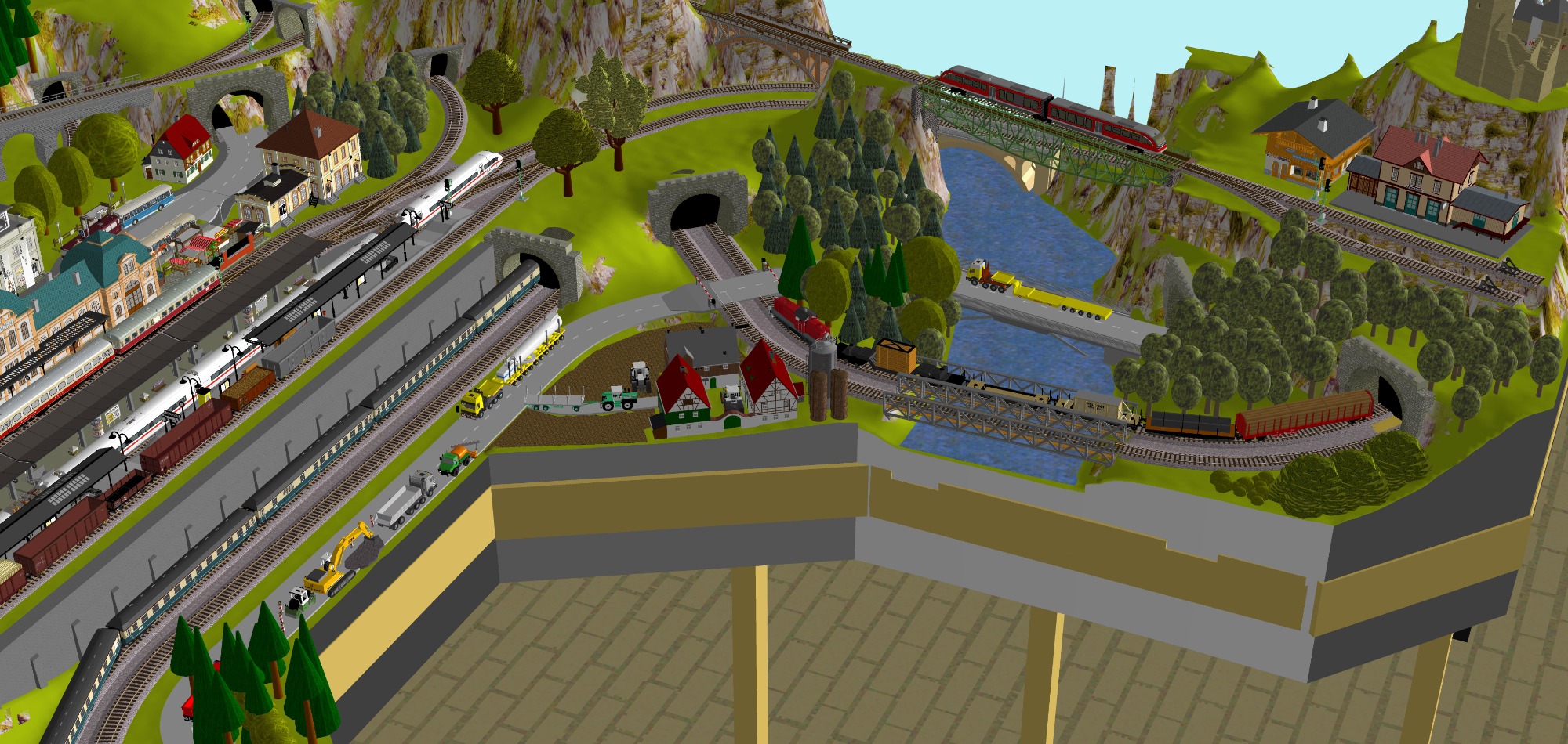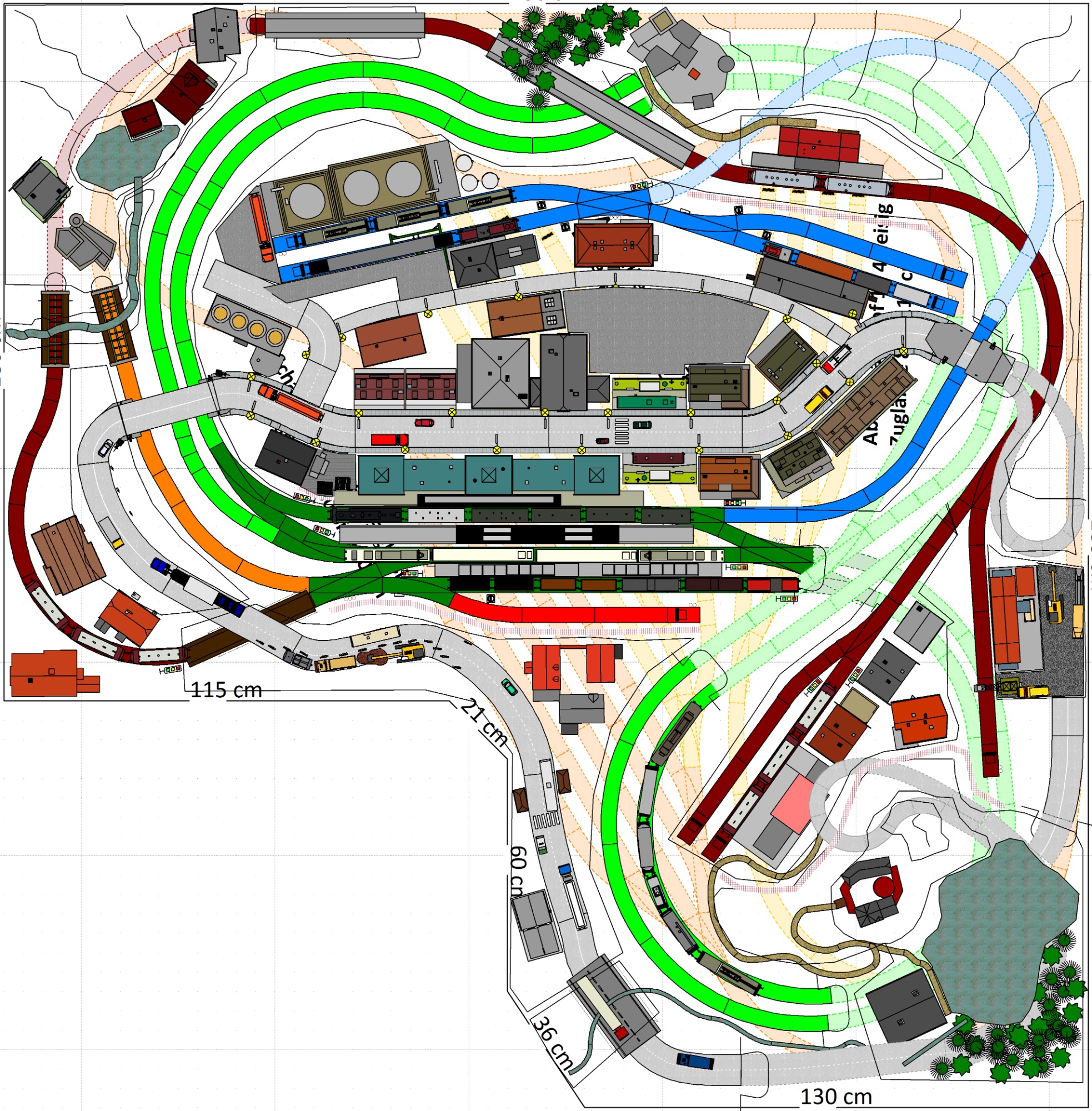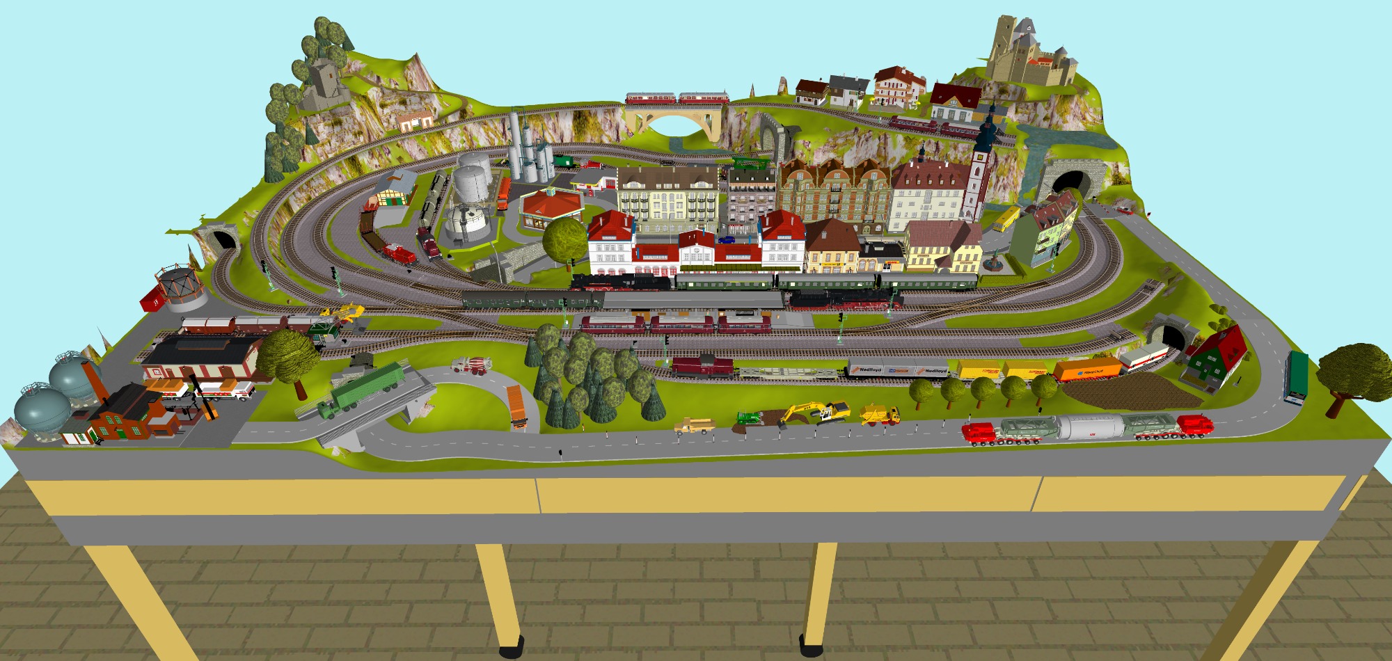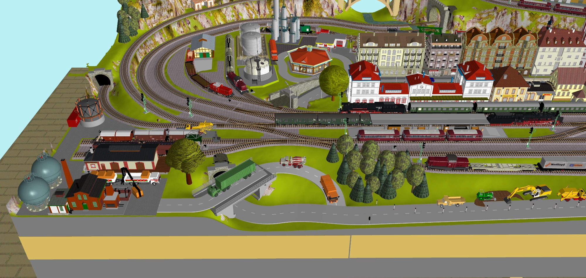 Mittelgebirge / Hochgebirge mit mittlerem Industriegebiet, Erholung am Fluss, 1 Hauptbahnhof 4-gleisig mit 2-gleisiger Hauptstrecke mit 1-gleisiger Nebenstrecke ins Mittelgebirge mit 1 Durchgangsbahnhof 1-gleisig sowie zwei Endbahnhöfen 2-gleisig. Eine Hochgebirgsbahn mit 2 Endbahnhöfen 2-gleisig und einem Durchgangsbahnhof mit Abstellgleis. Die Anlage besitzt 2 Schattenbahnhöfe mit insgesamt 9-Gleisen und 3 Abstellbahnhöfe mit 21 Gleisen. insgesamt 7 Brücken sind auf der Anlage verbaut. Car-System mit 4 Bahnübergänge, Straßen 2-spurig mit insgesamt 3 Wendekreisen und 3 Abzweigen, davon 2 Abzweige als Einbahnstraße, Baustelle mit Ampelverkehr