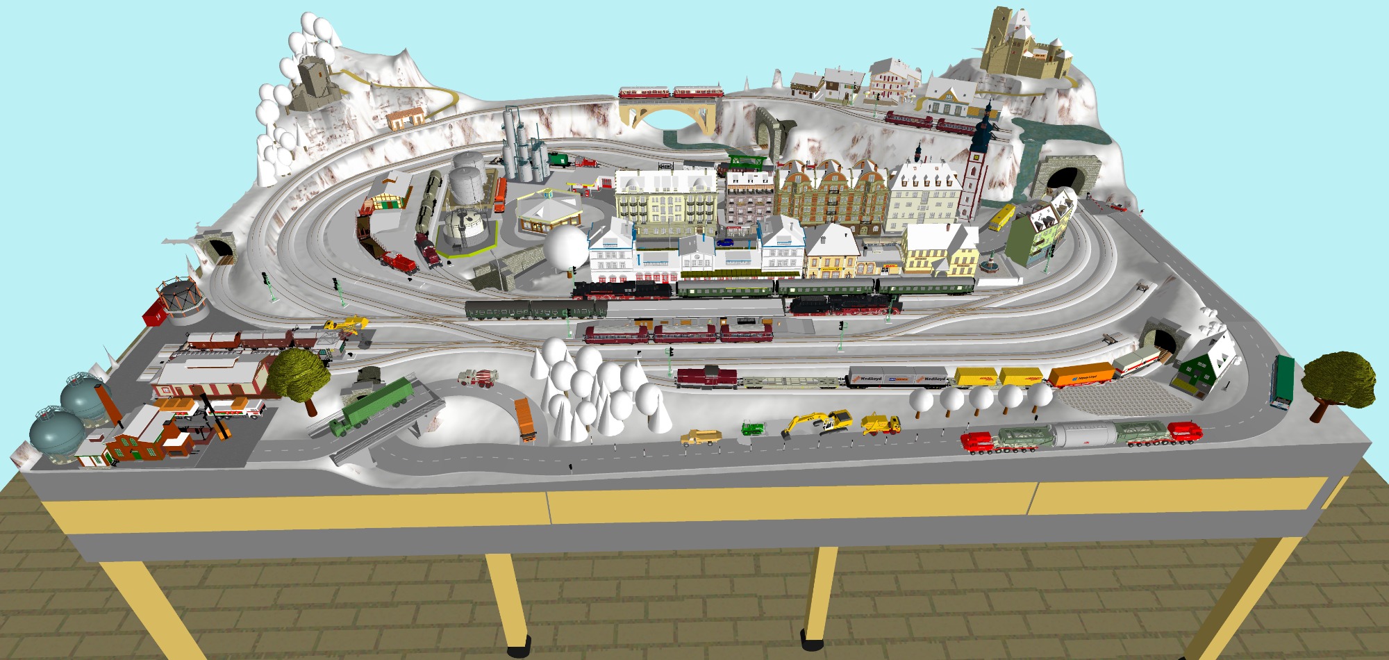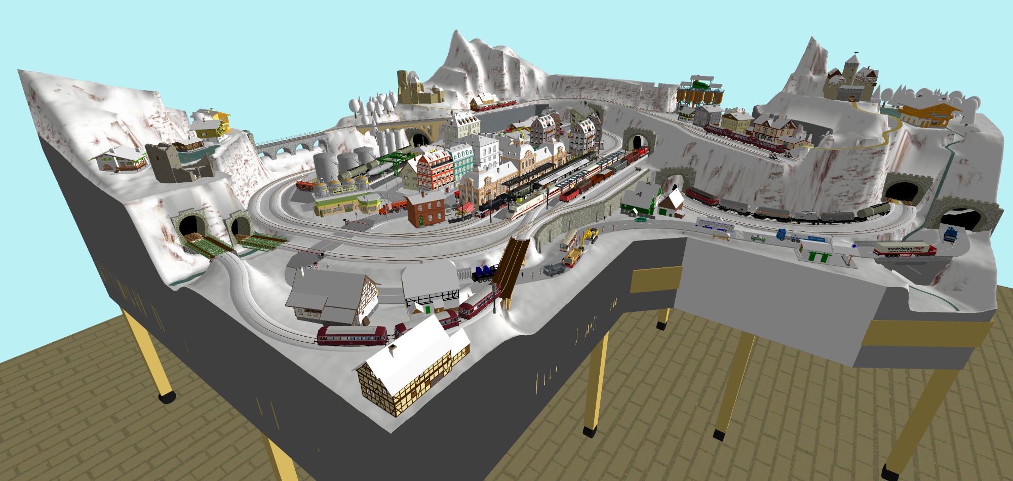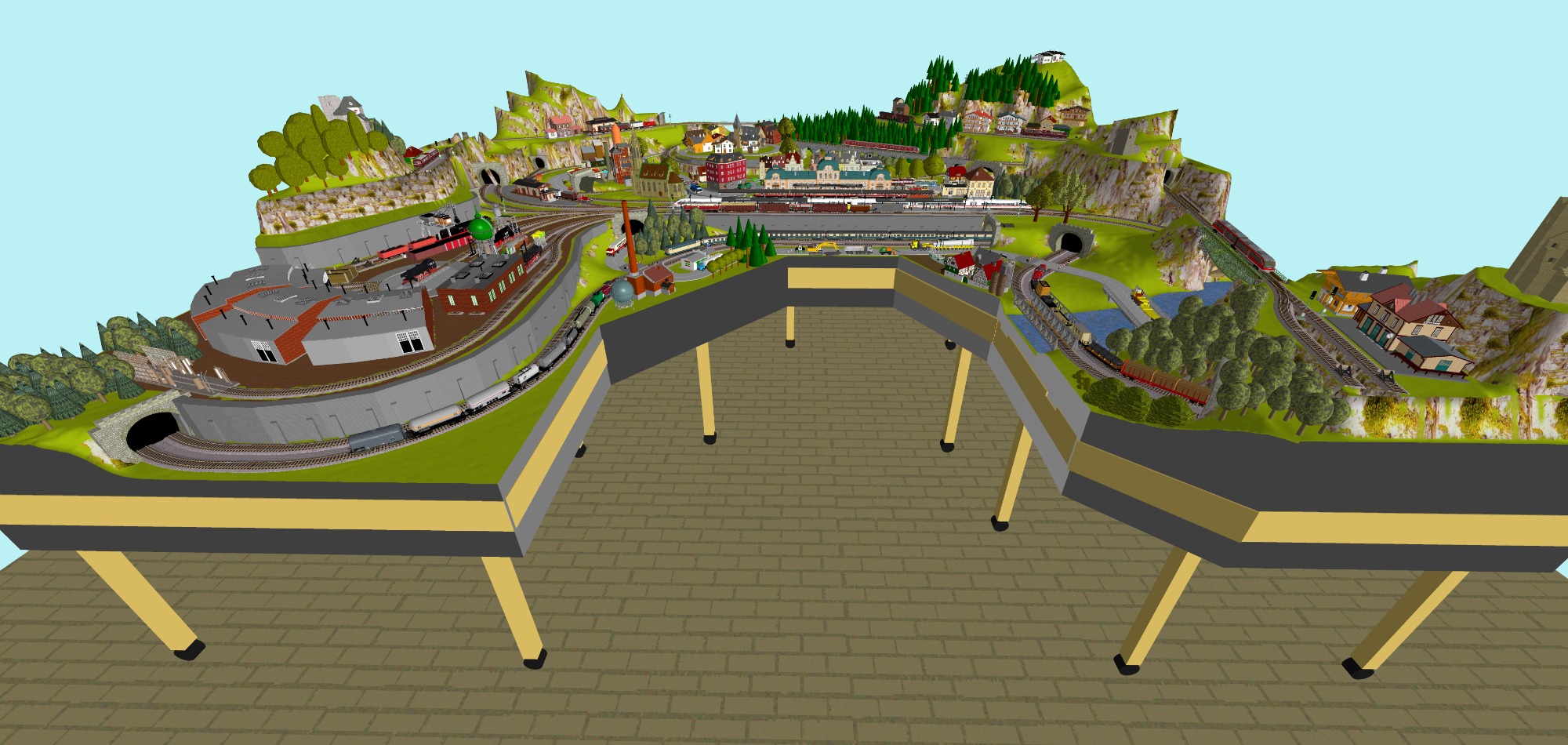 Mittelgebirge / Hochgebirge mit mittlerem Industriegebiet, Erholung am Fluss, 1 Hauptbahnhof 4-gleisig mit 2-gleisiger Hauptstrecke mit 1-gleisiger Nebenstrecke ins Mittelgebirge mit 1 Durchgangsbahnhof 1-gleisig sowie zwei Endbahnhöfen 2-gleisig. Eine Hochgebirgsbahn mit 2 Endbahnhöfen 2-gleisig und einem Durchgangsbahnhof mit Abstellgleis. Die Anlage besitzt 2 Schattenbahnhöfe mit insgesamt 9-Gleisen und 3 Abstellbahnhöfe mit 21 Gleisen. insgesamt 7 Brücken sind auf der Anlage verbaut. Car-System mit 4 Bahnübergänge, Straßen 2-spurig mit insgesamt 3 Wendekreisen und 3 Abzweigen, davon 2 Abzweige als Einbahnstraße, Baustelle mit Ampelverkehr