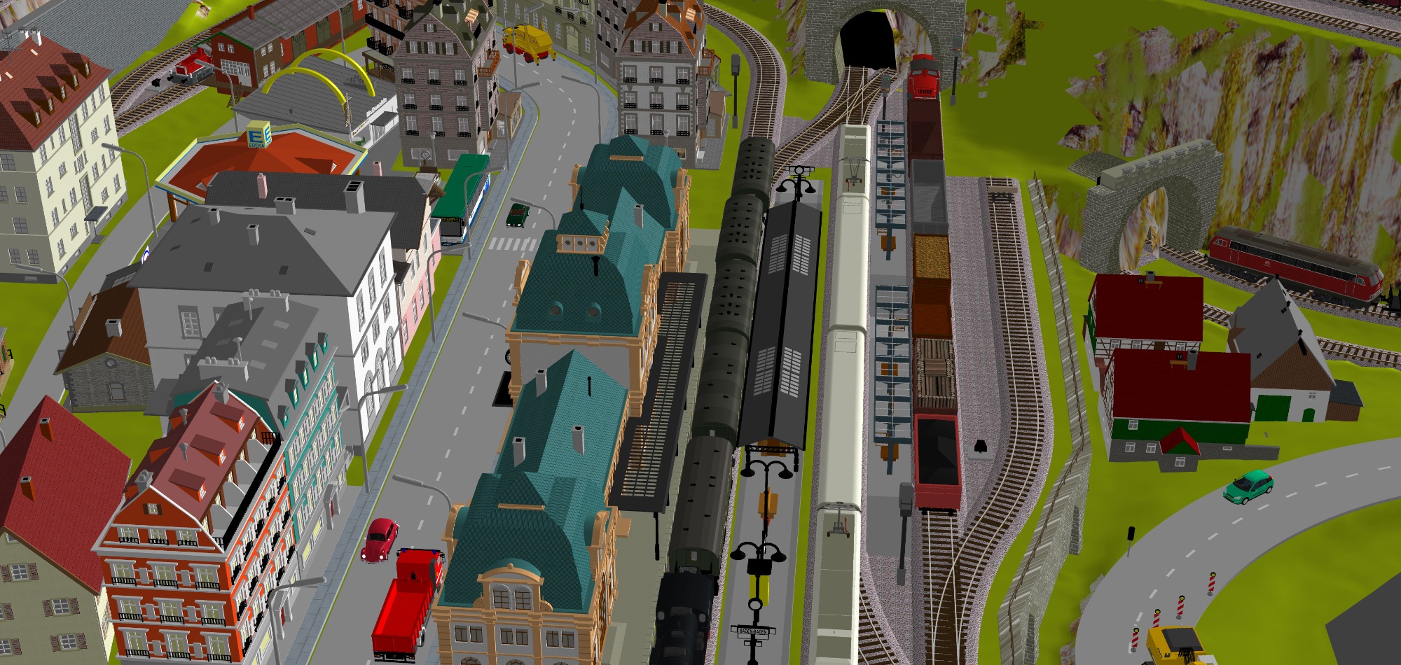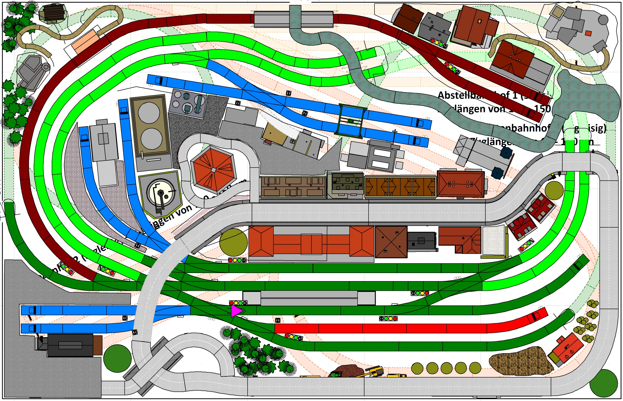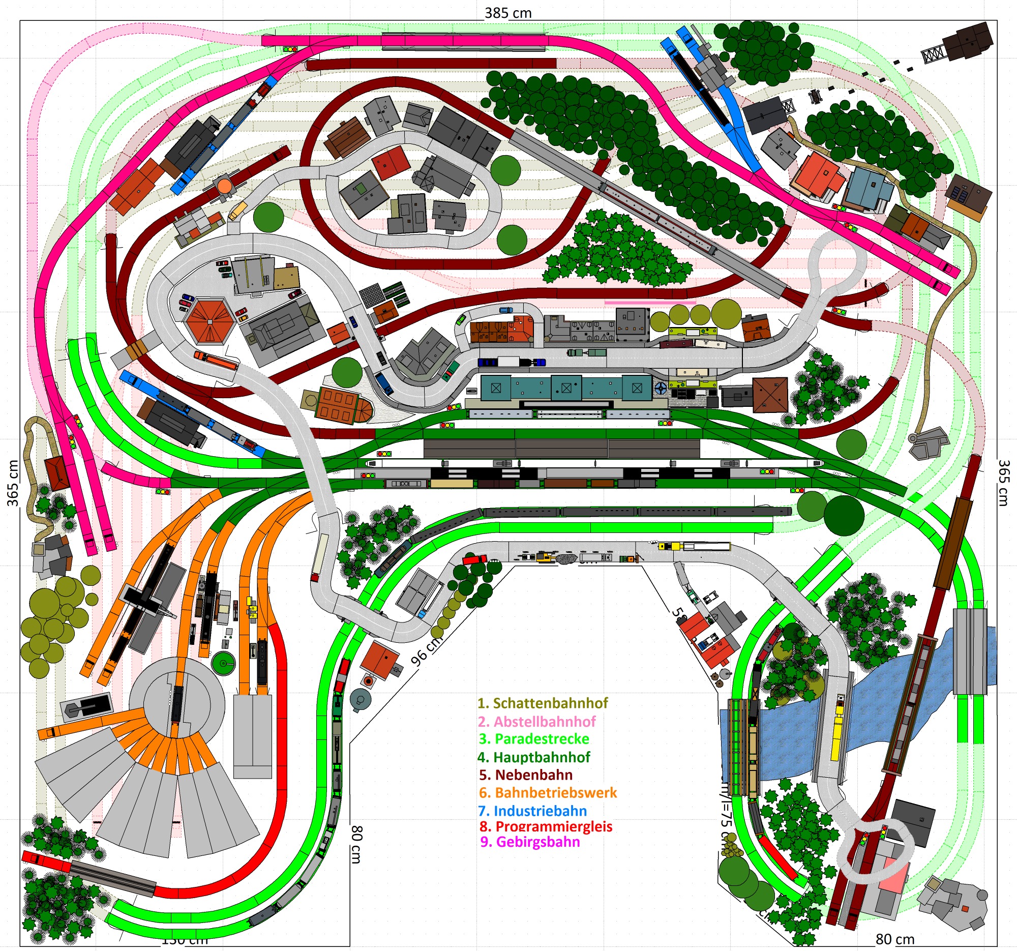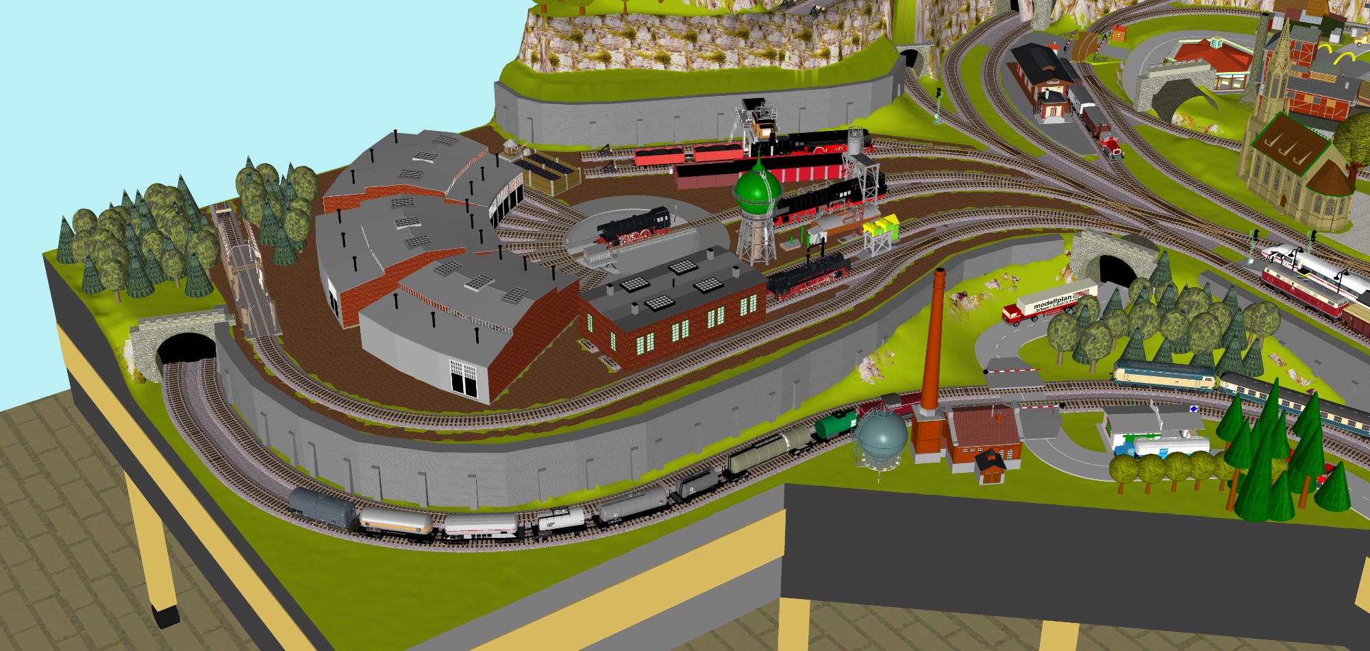 Mittelgebirge / Hochgebirge mit mittlerem Industriegebiet, Erholung am Fluss, 1 Hauptbahnhof 4-gleisig mit 2-gleisiger Hauptstrecke mit 1-gleisiger Nebenstrecke ins Mittelgebirge mit 1 Durchgangsbahnhof 1-gleisig sowie zwei Endbahnhöfen 2-gleisig. Eine Hochgebirgsbahn mit 2 Endbahnhöfen 2-gleisig und einem Durchgangsbahnhof mit Abstellgleis. Die Anlage besitzt 2 Schattenbahnhöfe mit insgesamt 9-Gleisen und 3 Abstellbahnhöfe mit 21 Gleisen. insgesamt 7 Brücken sind auf der Anlage verbaut. Car-System mit 4 Bahnübergänge, Straßen 2-spurig mit insgesamt 3 Wendekreisen und 3 Abzweigen, davon 2 Abzweige als Einbahnstraße, Baustelle mit Ampelverkehr