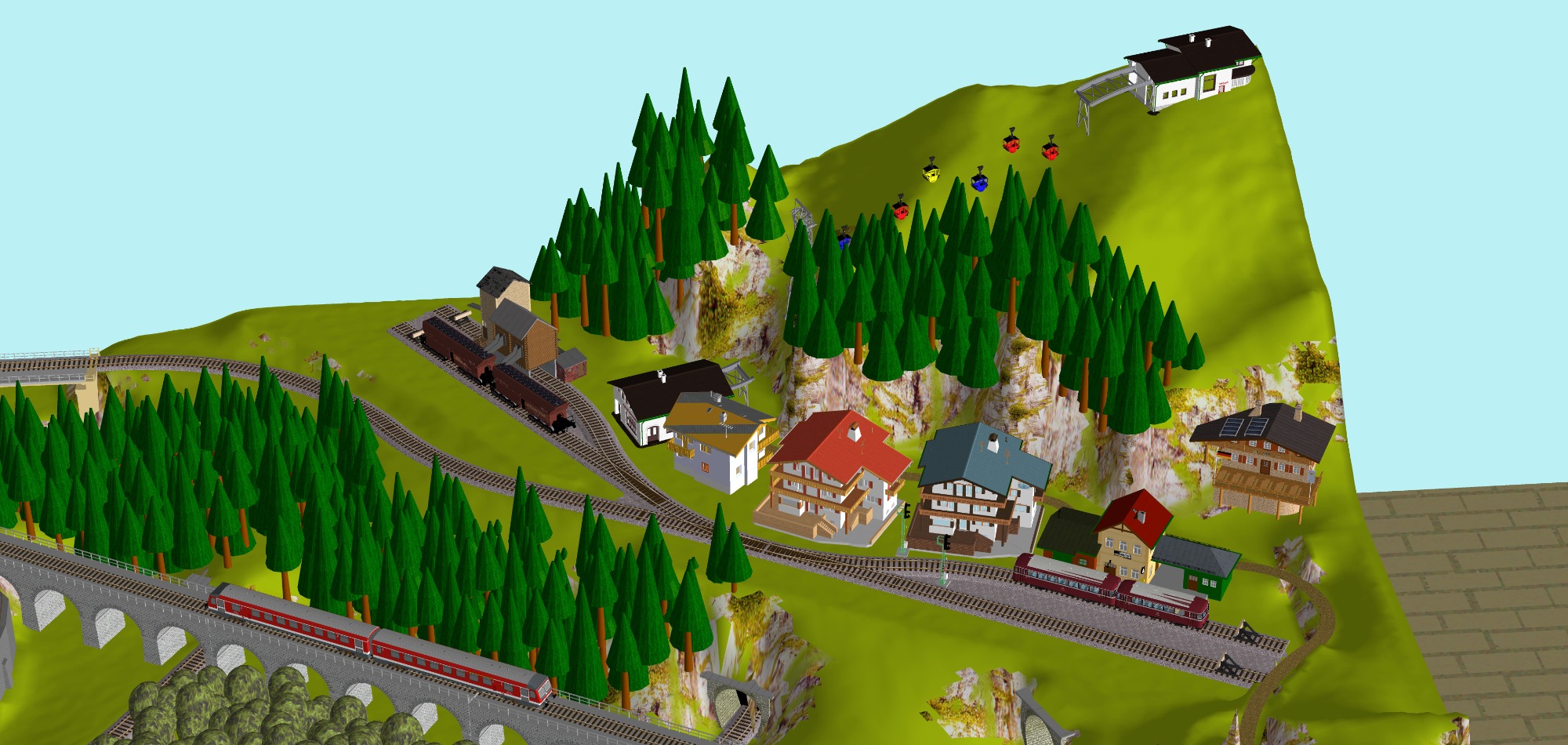 Rechter Anlagenteil mit Seilbahn, B erg- und Talstation, 2. Endbahnhof Gebirgsbahn, kleines Alpendorf mit Viaduktbrücke im Vordergrund